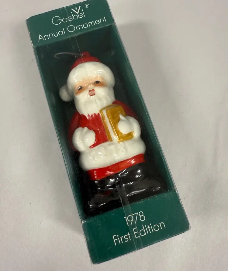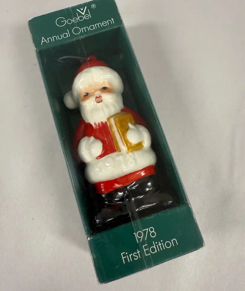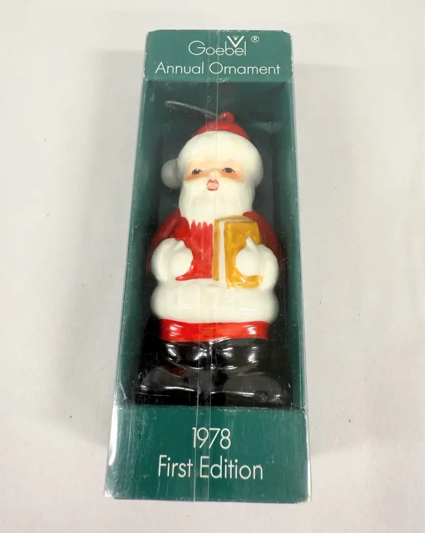 This Vintage 1978 Goebel Annual Christmas Tree Ornament features Santa Claus in a box, made of porcelain and measuring 4 inches in height. Manufactured in Germany, this small multicolor ornament is part of the Christmas collection from the 1970s. The Goebel brand is known for its collectible sculptures and figurines, making this Santa Claus ornament a sentimental addition to any Christmas decor.