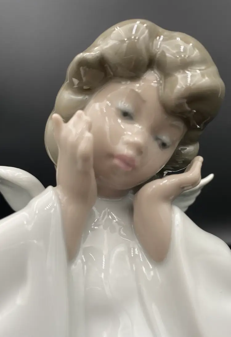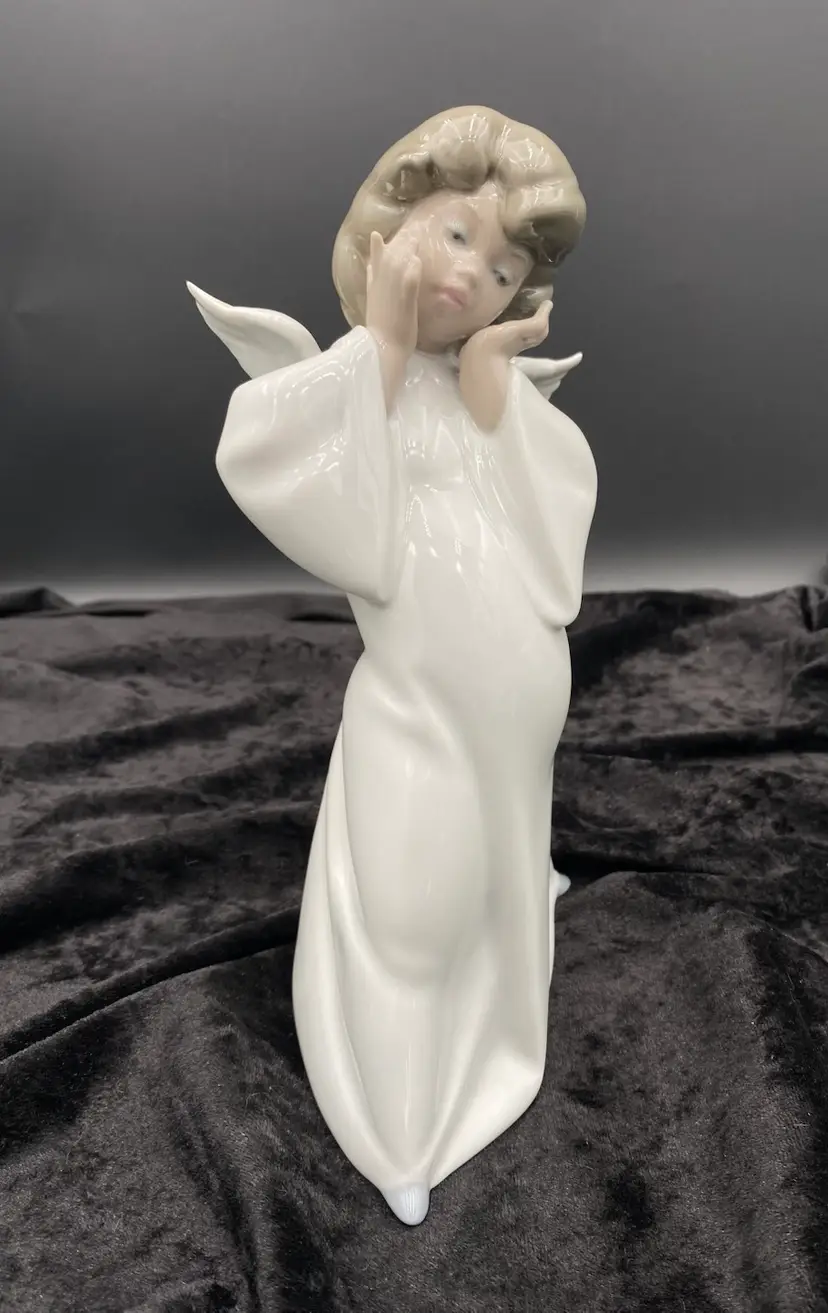 This vintage Lladró (Spain) #4959 "Mime Angel" Figurine is a beautifully crafted porcelain sculpture by artist Salvador Debón, depicting a unique angelic character. This medium-sized figurine, measuring 8.7 inches in height, is a retired piece from 1984 and features a glossy multicolor finish. Note: this figurine was introduced in 1977 and the wordmark indicates it was made between 1977 and 1984. Handmade in Spain, this collectible item is signed by the artists that created it and is a part of the Angels-Cherubs collection by Lladró. Perfect for any room, this angel figurine captures the essence of the late 20th century era with its intricate design and timeless appeal.