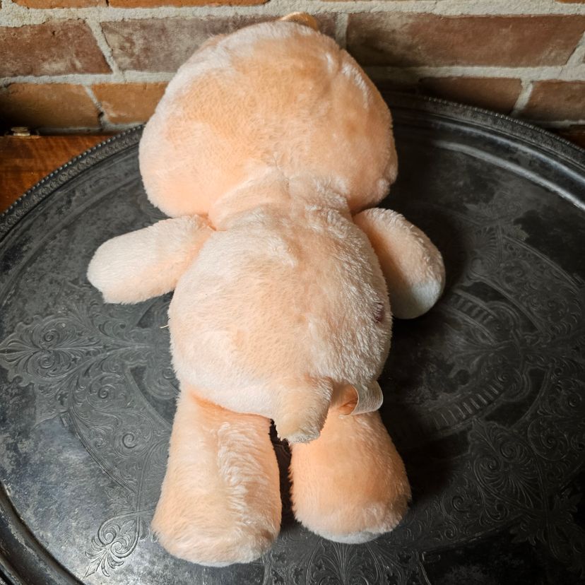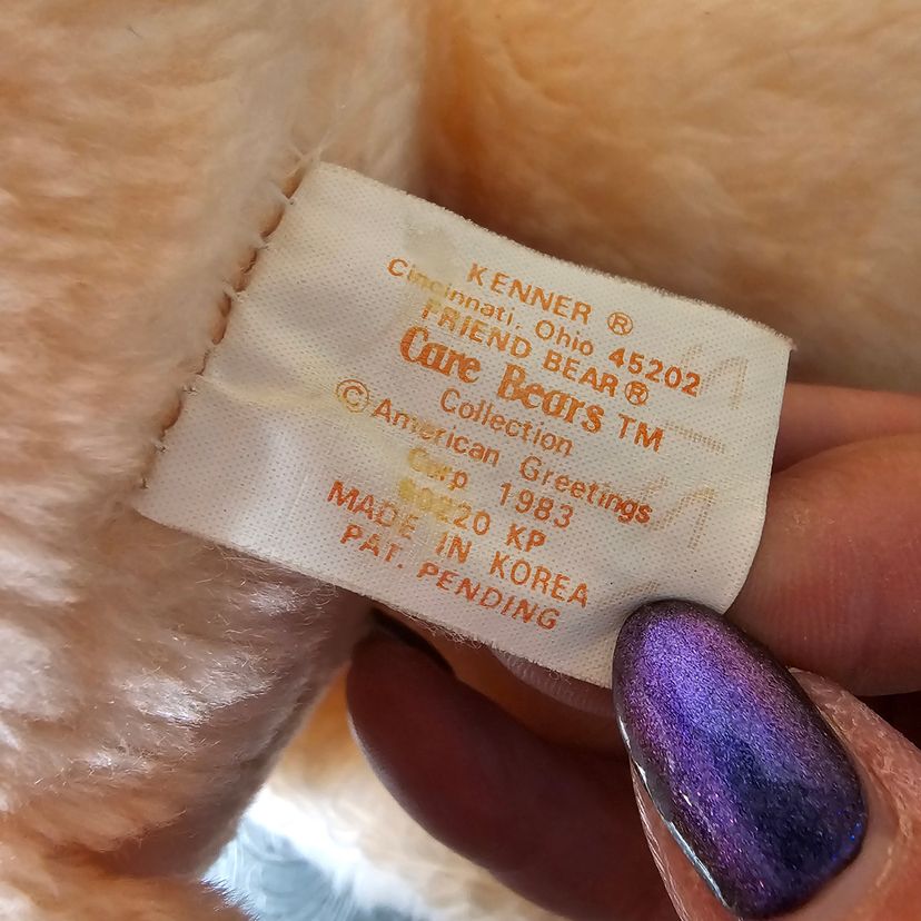 Adorable Friend Bear plush from the original 1983 Care Bears collection by Kenner! This classic peach-colored bear features twin smiling sunflowers on its belly badge and heart-shaped paw pads. Marked ©1983 American Greetings with Kenner tag and red heart tush tag. Measures approx. 13" tall. In good vintage condition with soft fur and minor age-related wear.