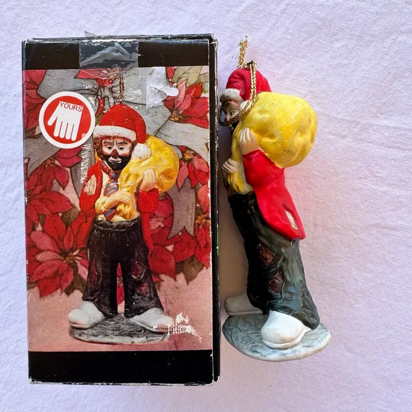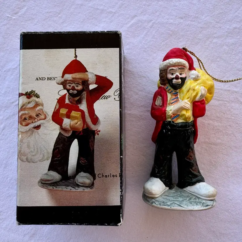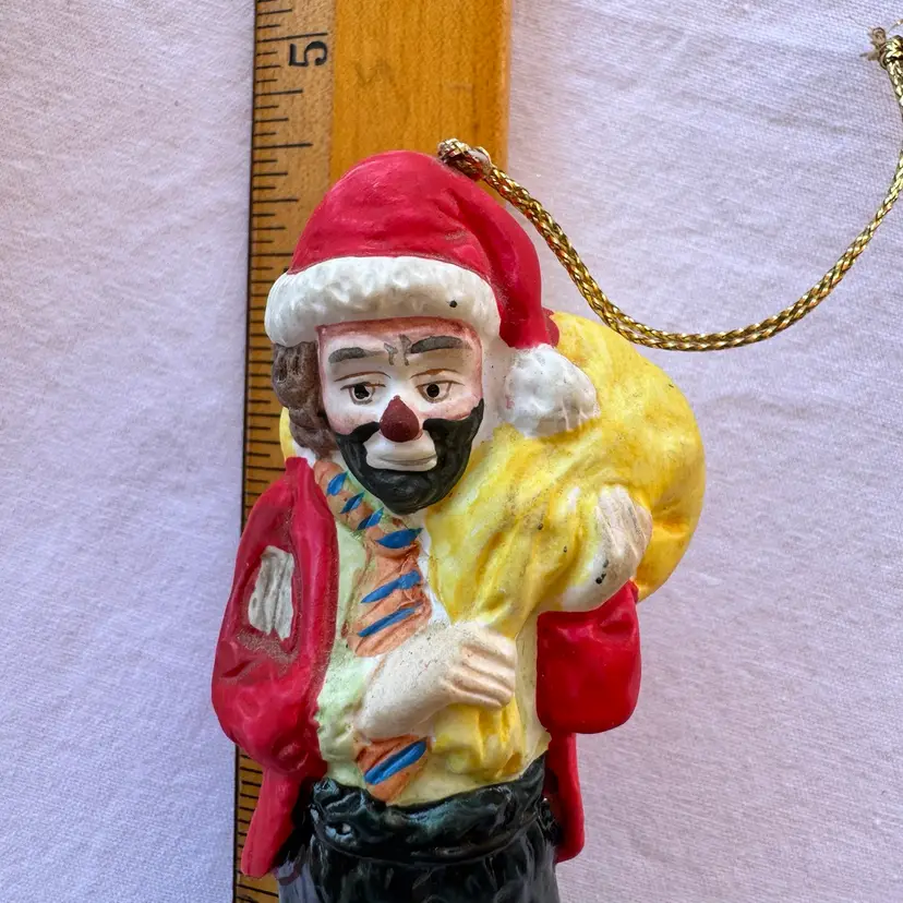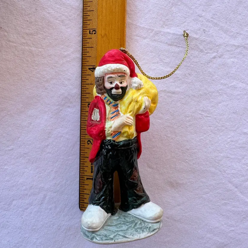 Item: Hand-painted bisque porcelain Christmas ornament/figurine featuring Emmett Kelly Jr as a Santa-themed clown.