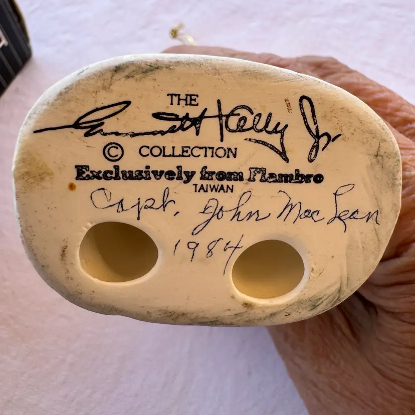 Markings (underside): "THE Emmett Kelly Jr COLLECTION Exclusively from Flambro TAIWAN" with facsimile signature; handwritten inscription reads: "Capt. John MacLean 1984".