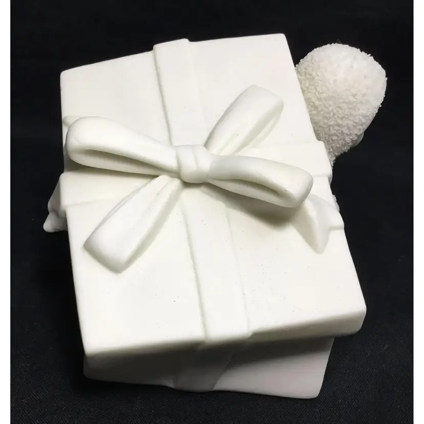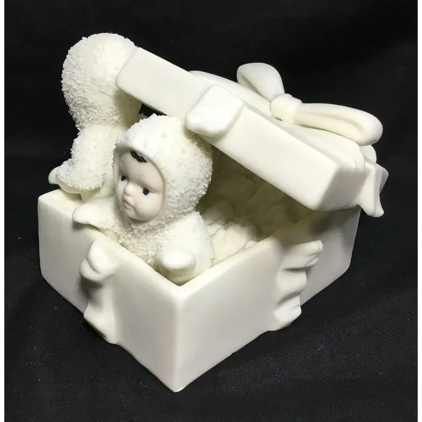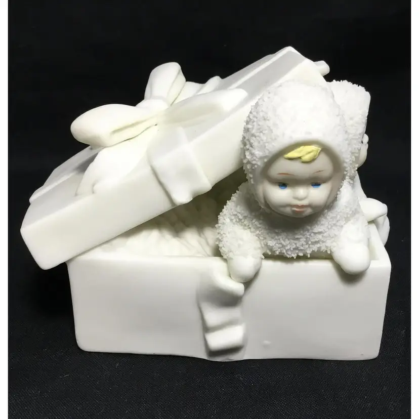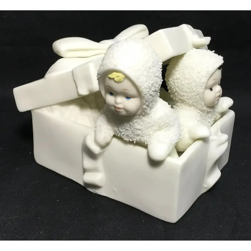 4.25 inches long by 3 inches tall by 2.5 inches wide, 2 babies in furry snow suits playing inside a gift box with ribbons around it and bow on top. Matte porcelain figurine, babies have painted hair, eyes, lips. From online article: How to Identify and Collect Snowbabies "Author Patsy Moyer once published an online article about a book written in 1901, The Snow Baby by Josephine Debitsch Peary, wife of the famous North Pole explorer Rear Admiral Robert E. Peary. In this interesting feature, Moyer detailed how the Peary's daughter, Marie Ahnighito, was “the first white child born that far north.” She also notes that her middle name honored the Inuit woman who made the child her first fur clothing.