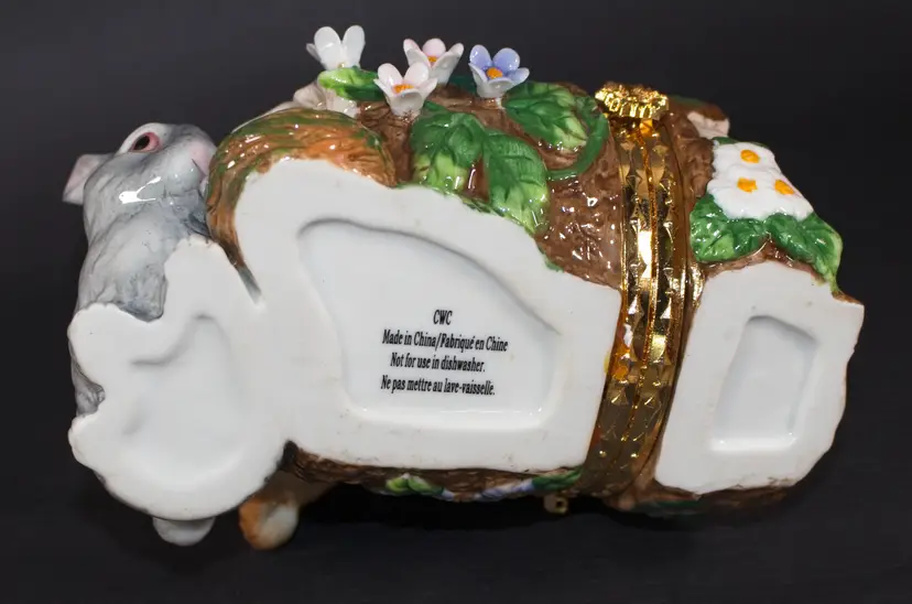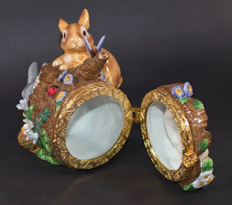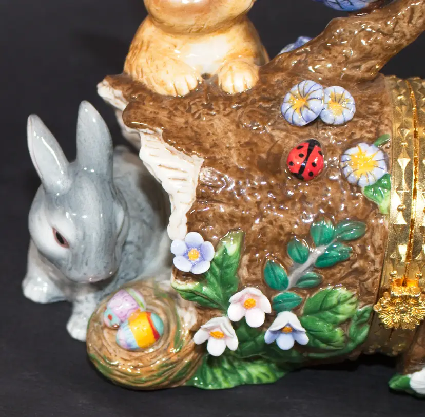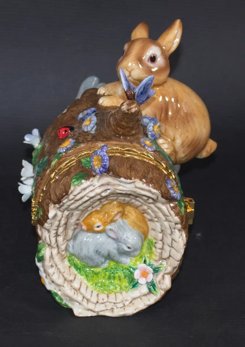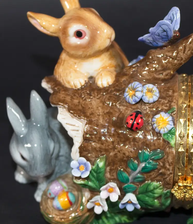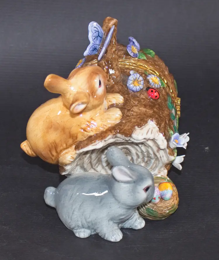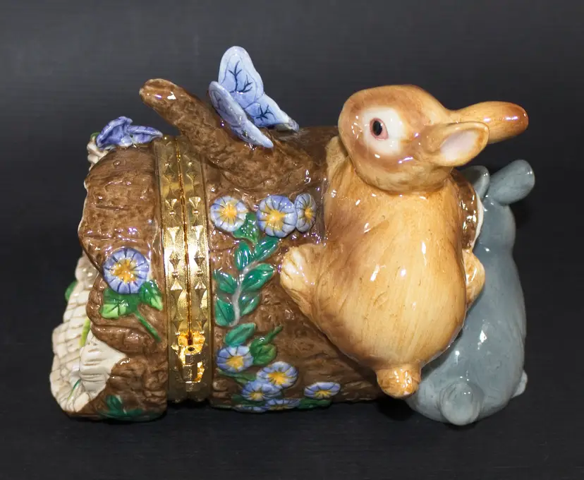 Vintage 1990s Easter Bunny Porcelain Trinket Box Large Butterflies Flowers 5.5" x 4.5". In good condition. 4.5" wide x 5.5" long x 4.5" tall
