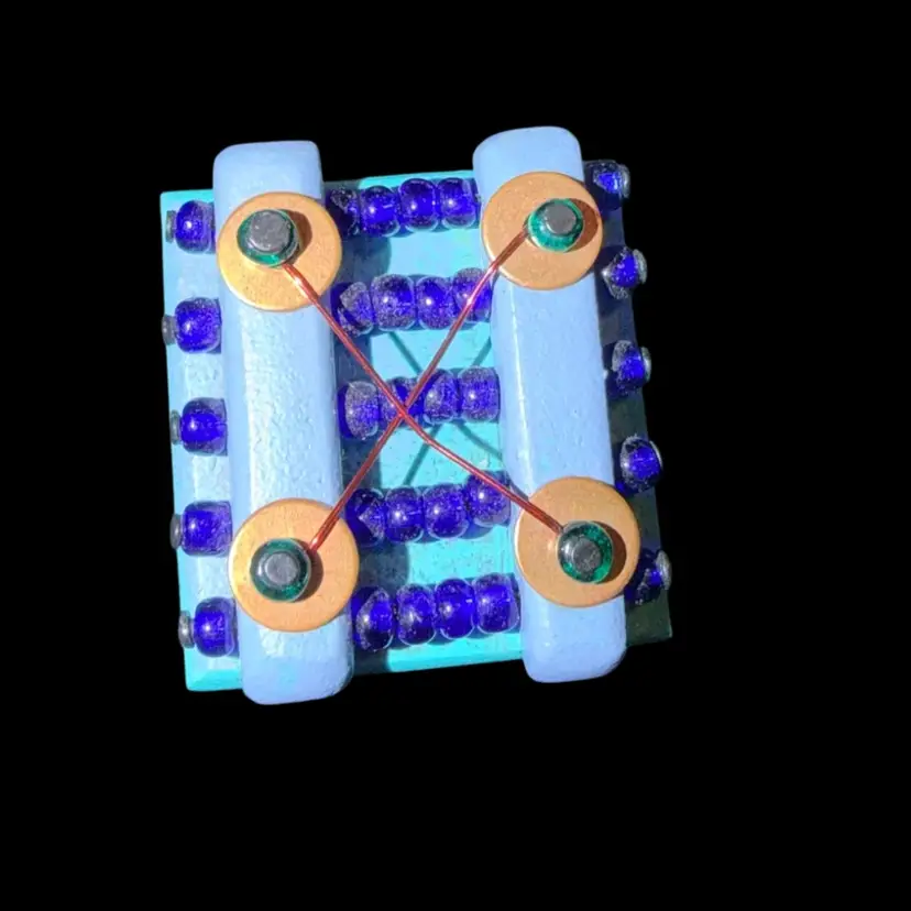 Different style pin with wires, wood, beads. Copper 1.5 by 1.5”