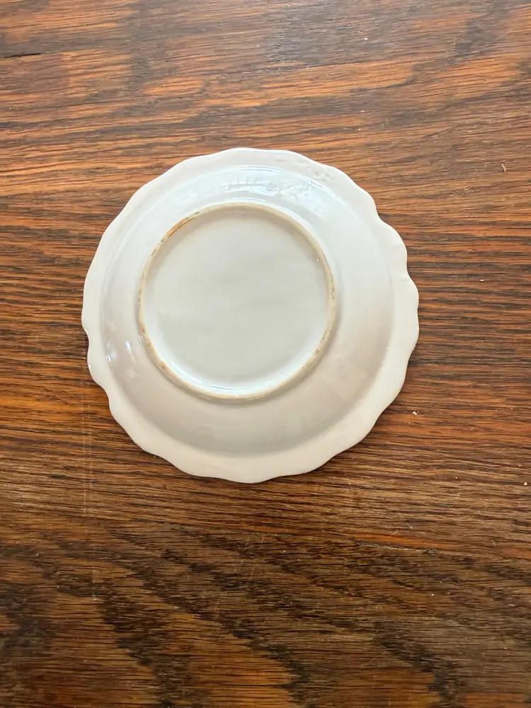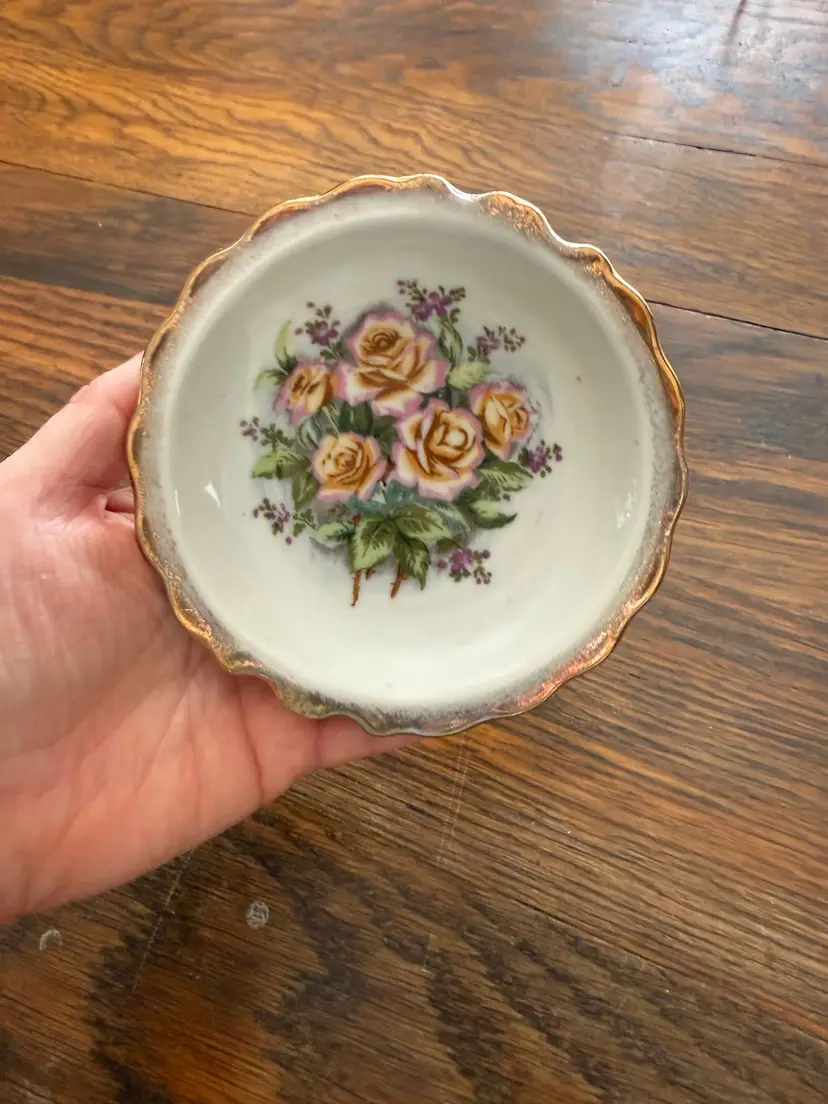 This charming little vintage plate measures just 4.5 inches across, making it perfect as a butter pat, jewelry dish, or dainty accent piece. The design features a lovely bouquet of yellow-pink roses with purple blossoms, framed by a scalloped rim with worn but beautiful gold trim.