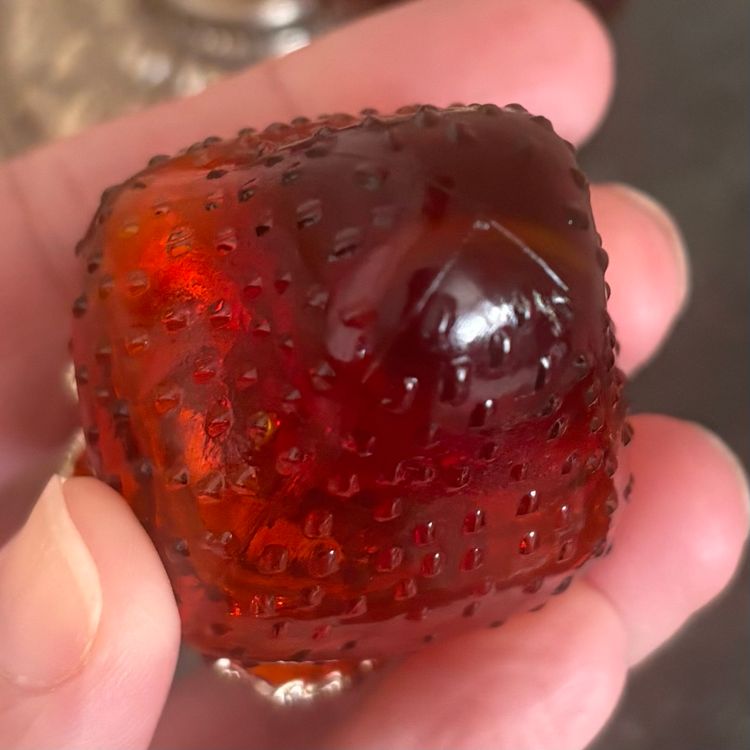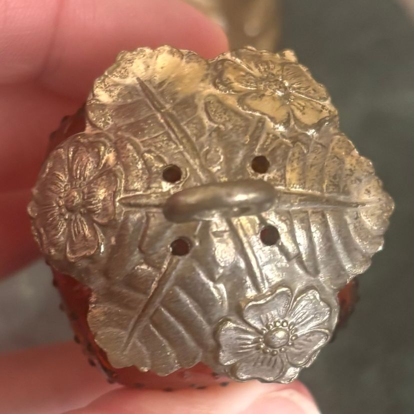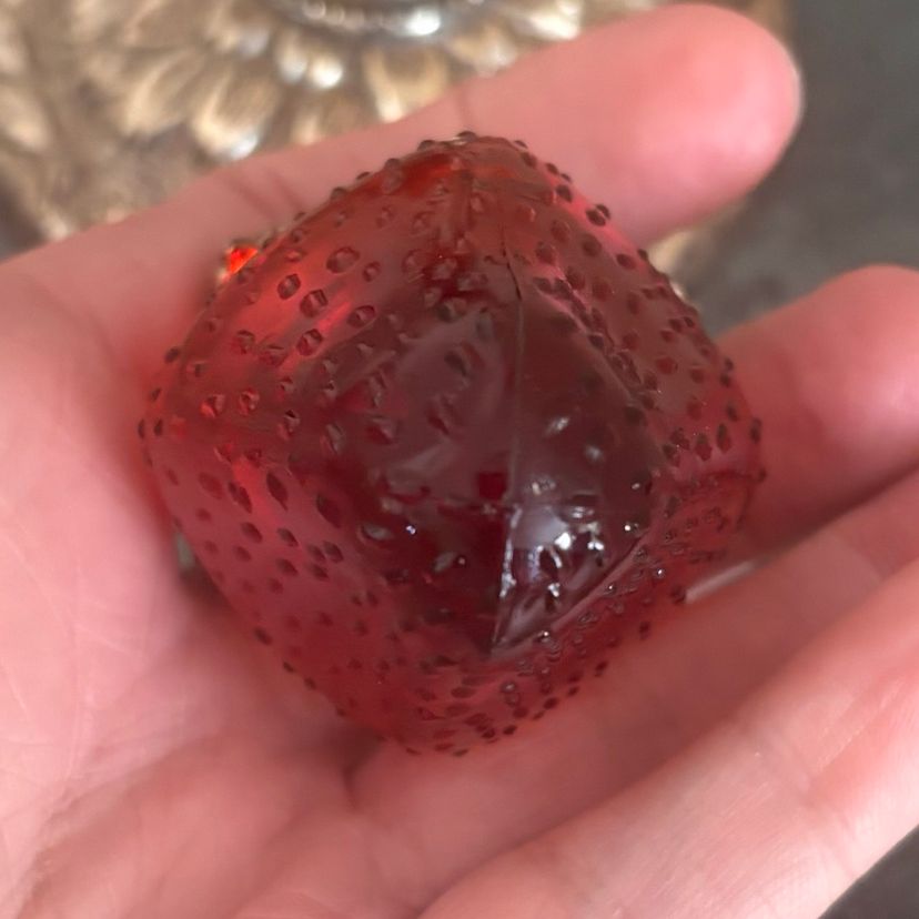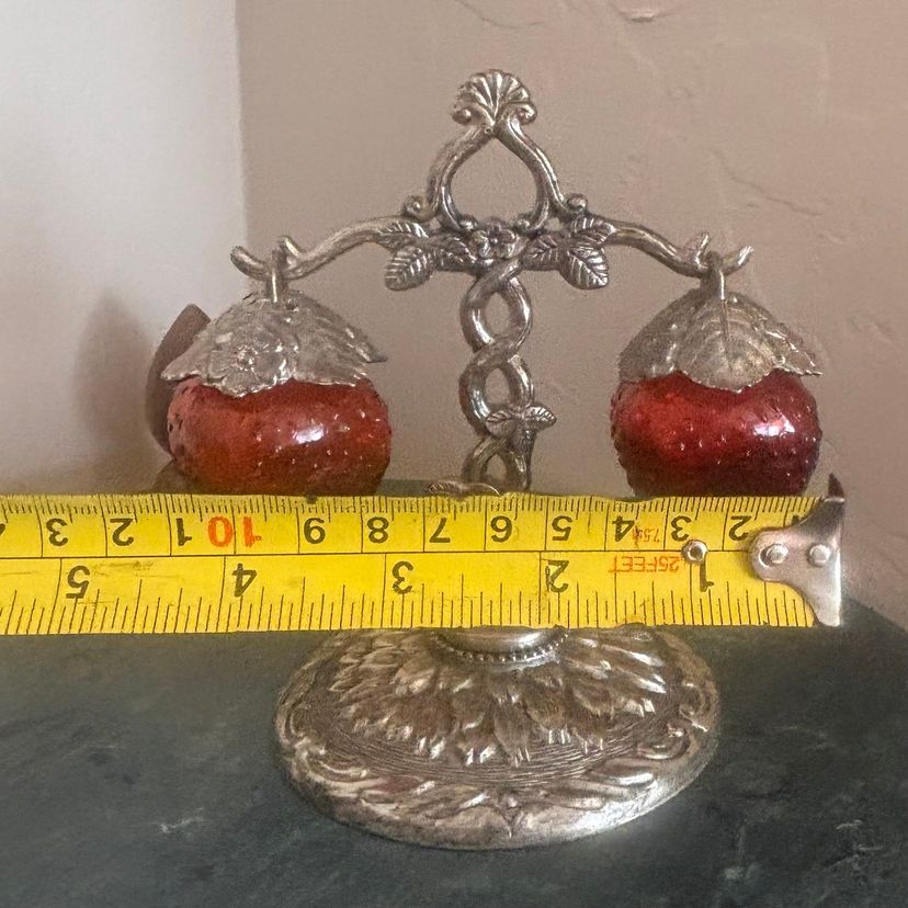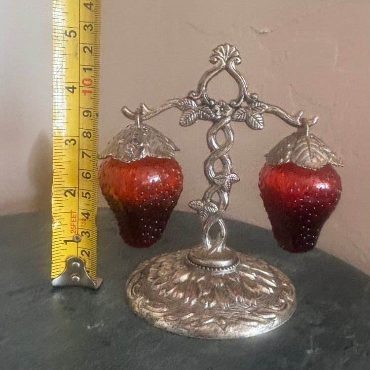 Sweet hanging strawberry shaker set 5”tall x 4 1/2”wide Vintage wear & patina as shown