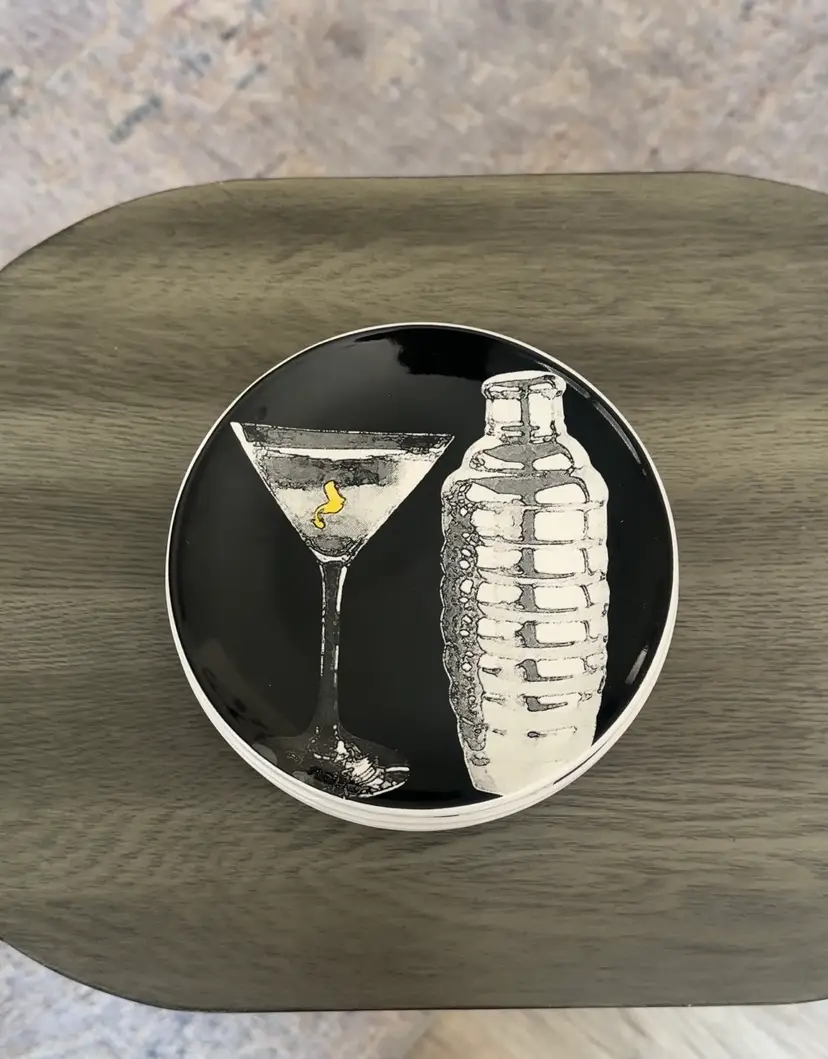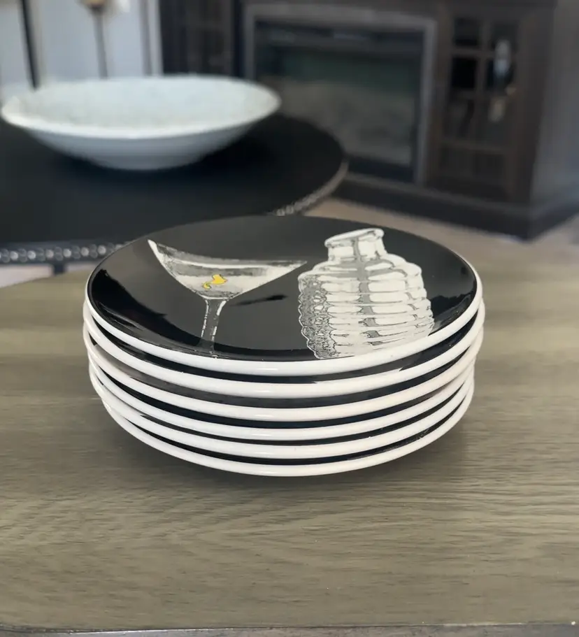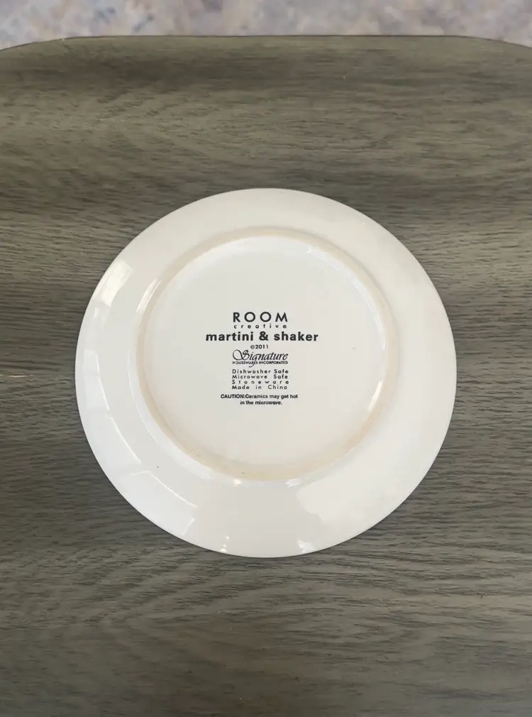 This vintage 6-piece 2011 Signature Room Creative Martini & Shaker plate set features a unique martini bottle and glass stemware pattern in black and white. Made of ceramic with a glossy finish, these round plates have a 6.25" diameter and are perfect for all occasions. This set is stackable, microwave safe, and dishwasher safe, making it a versatile and decorative addition to any home.
