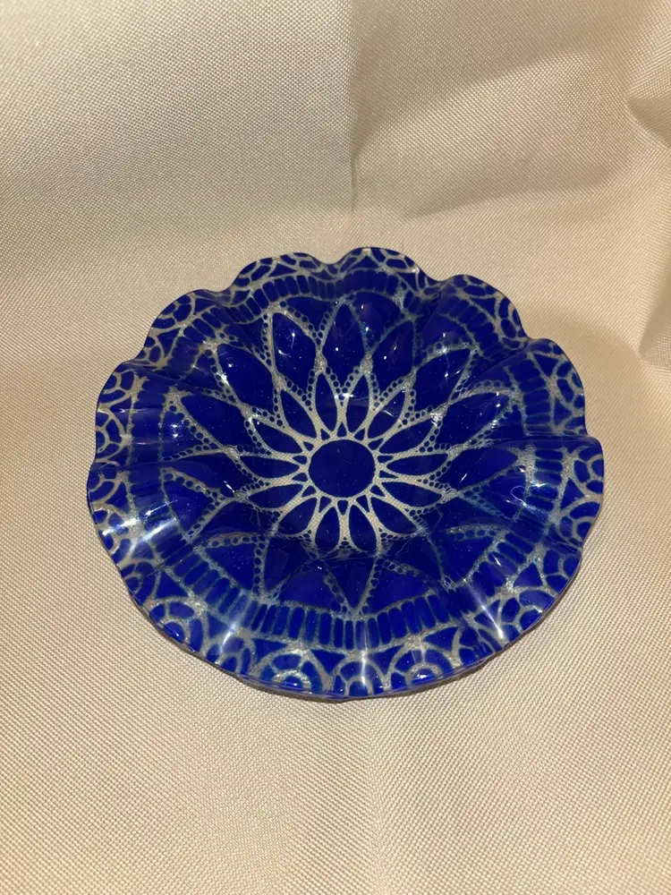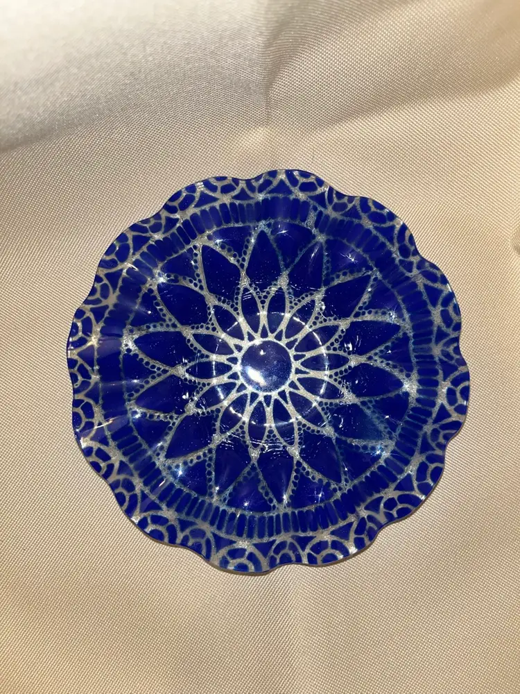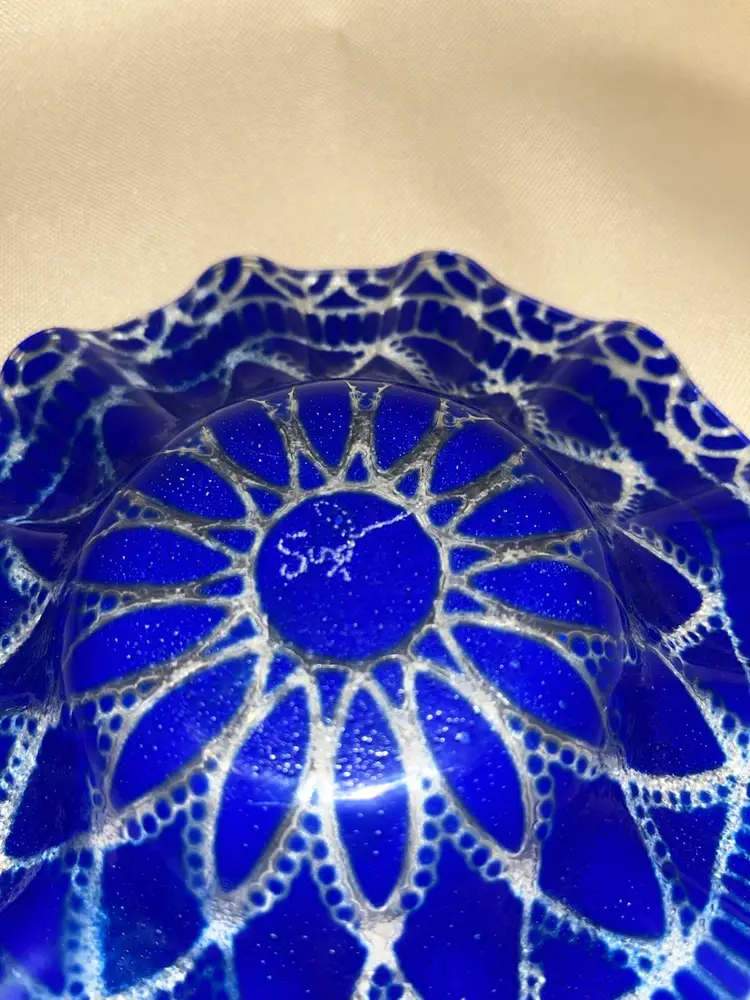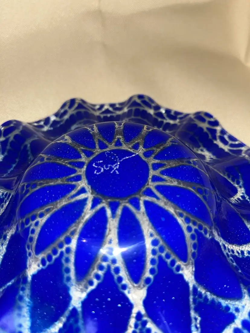 Vintage 7” Sydenstricker fused glass bowl blue and clear. Great condition no chips or cracks