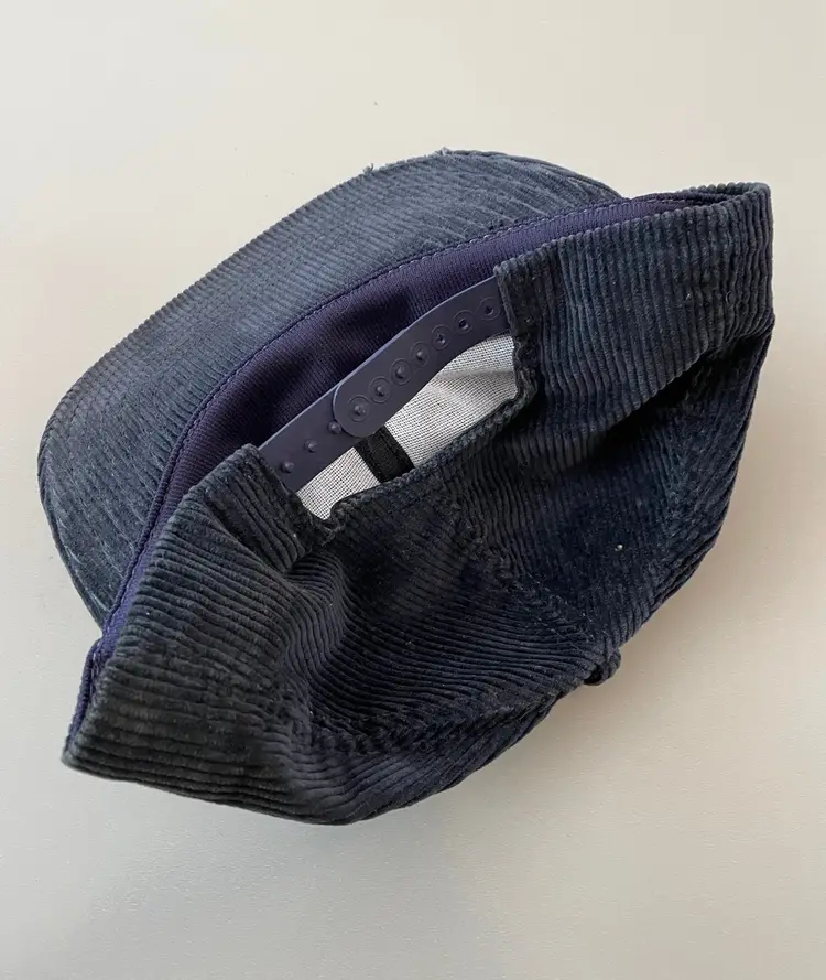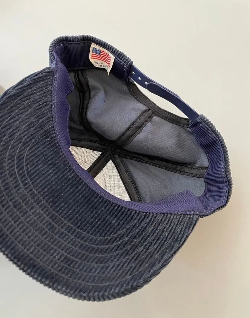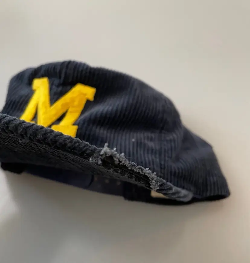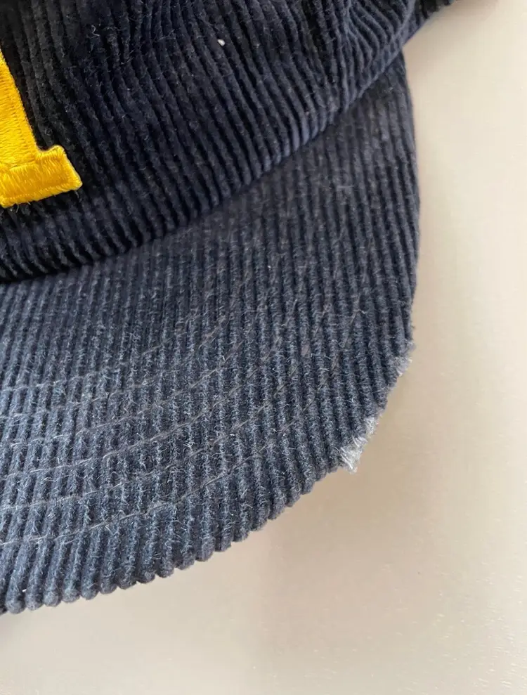 Vintage 80’s Michigan Wolverines Blue Corduroy Snapback Hat Brim Damage. Made in USA. Wear through on brim corner. Minor fading. Comes as seen in pictures.