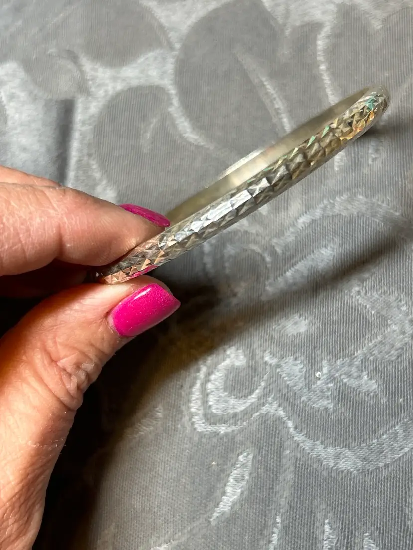 Notable Details: • Genuine 925 sterling silver (marked) • Faceted / diamond-cut texture for extra sparkle • Slim profile – perfect for stacking • Classic round bangle shape • Comfortable lightweight everyday wear • Vintage piece with great shine