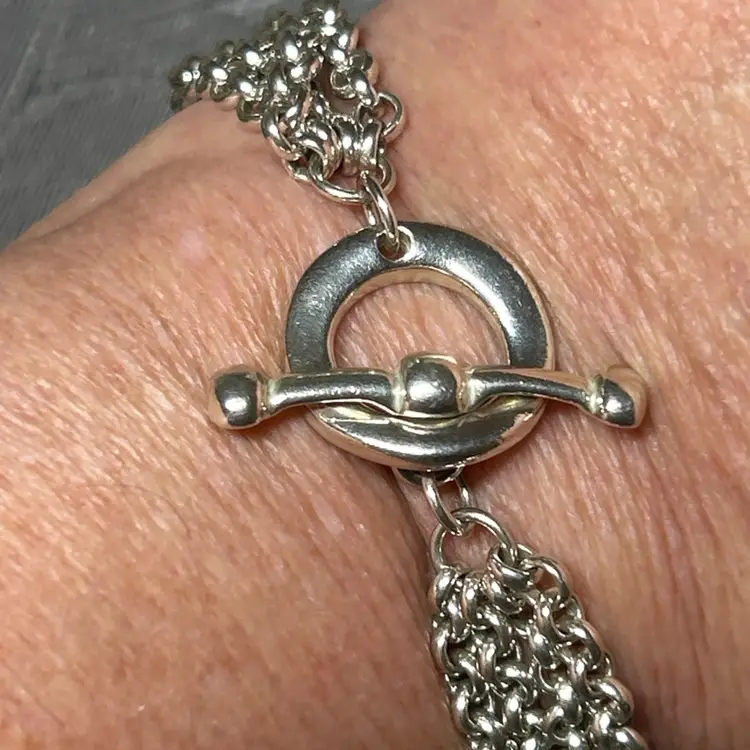 • Marked 925 sterling silver • Four-row / multi-strand chain construction • Substantial weight with great drape on the wrist • Toggle clasp closure • Statement silver bracelet