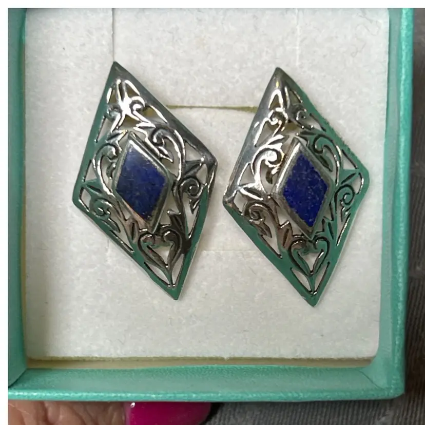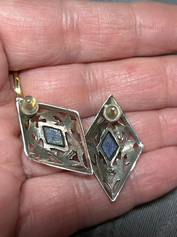 • Marked 925 sterling silver • Genuine lapis lazuli stones • Diamond-shaped filigree openwork design • Art Nouveau–inspired styling • Stud post backs with plastic backings • Total weight 4.2 grams