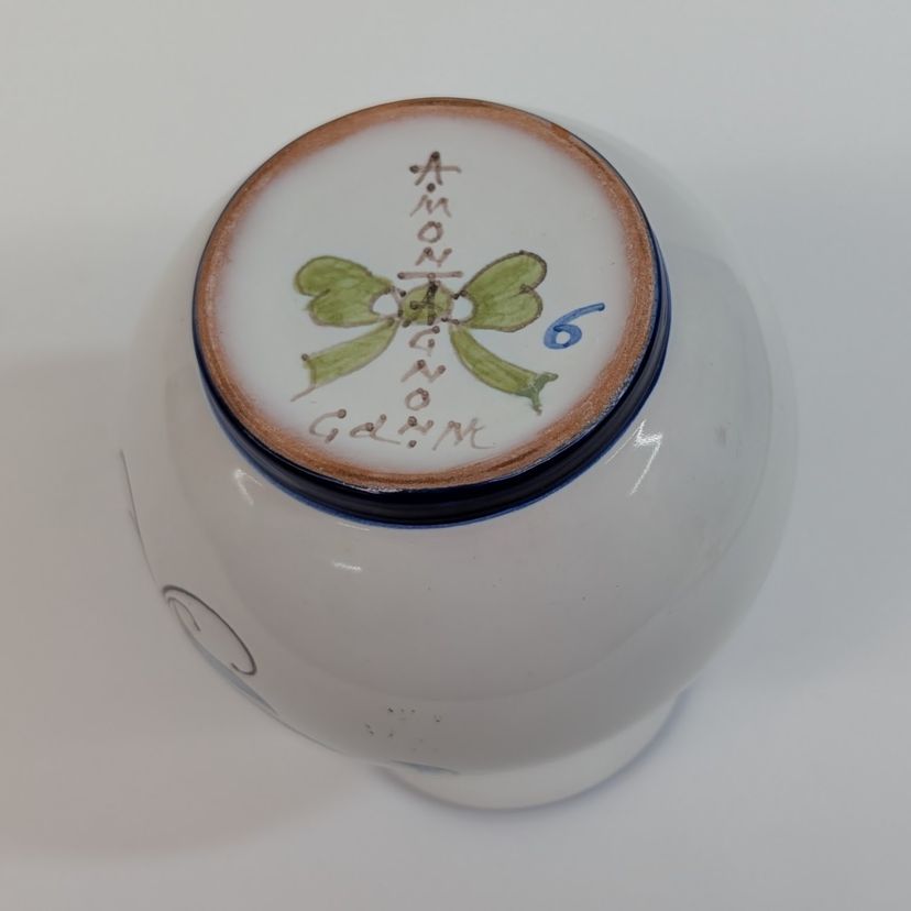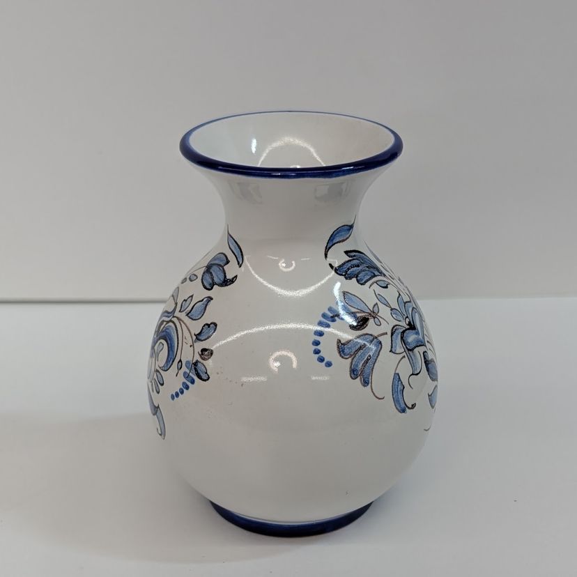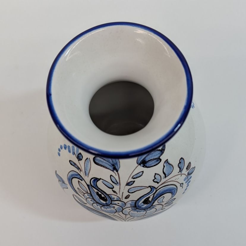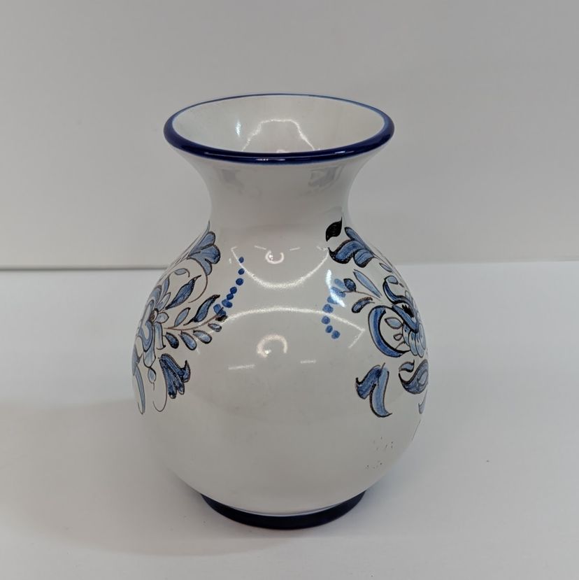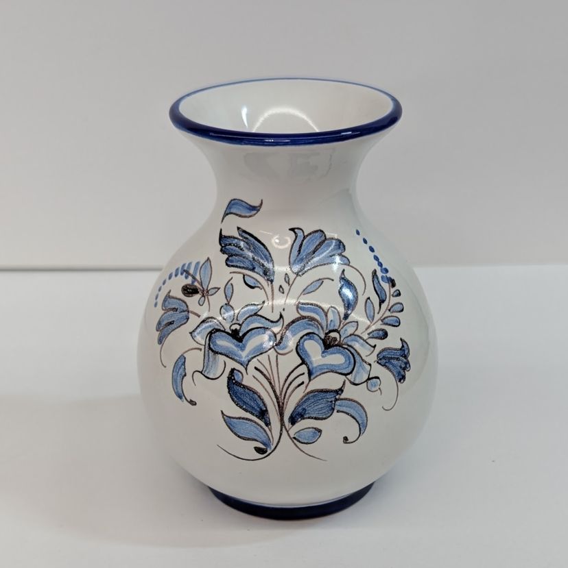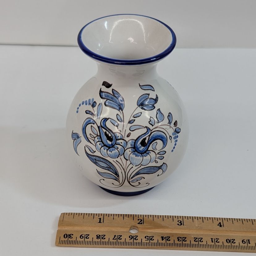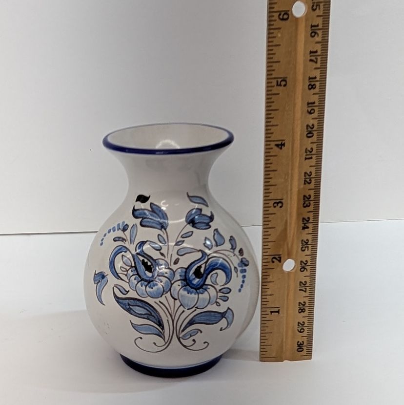 Beautiful, hand painted vase in the style of Nevers pottery with a smooth top. It has a floral design on each side and blue detailing. In nice, used condition. Measurements ~ 3.25 x 4"