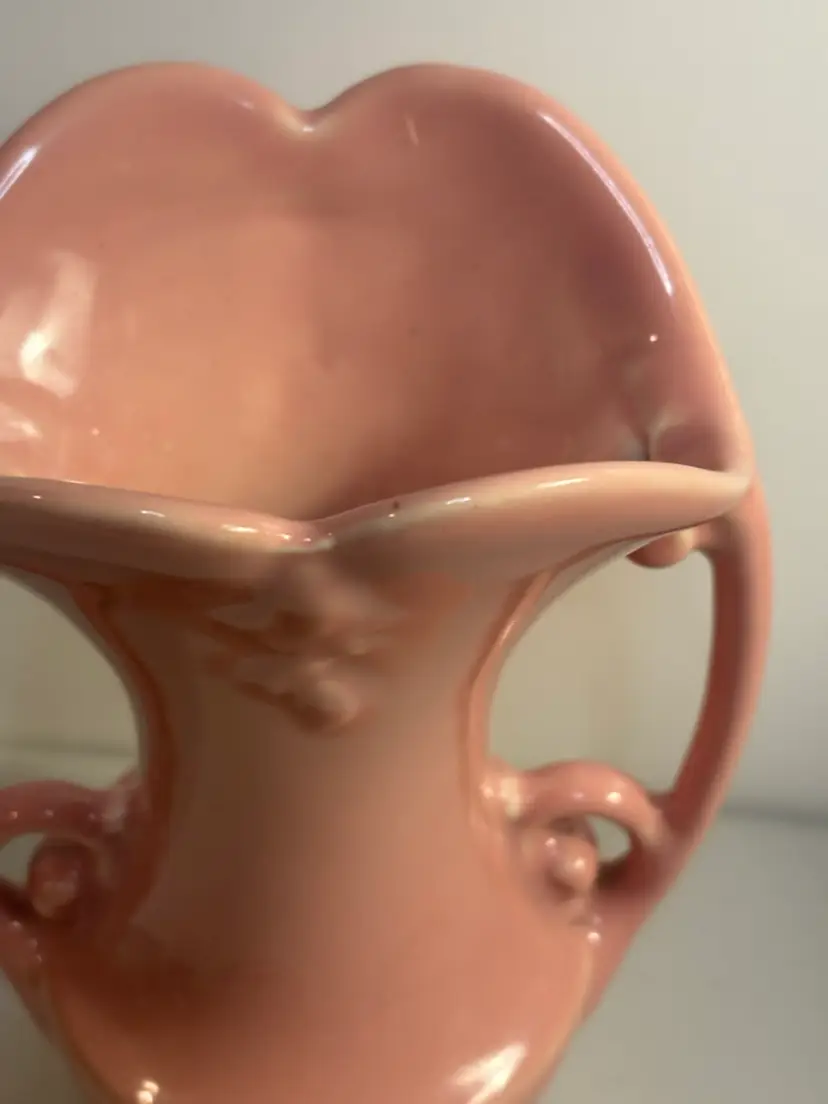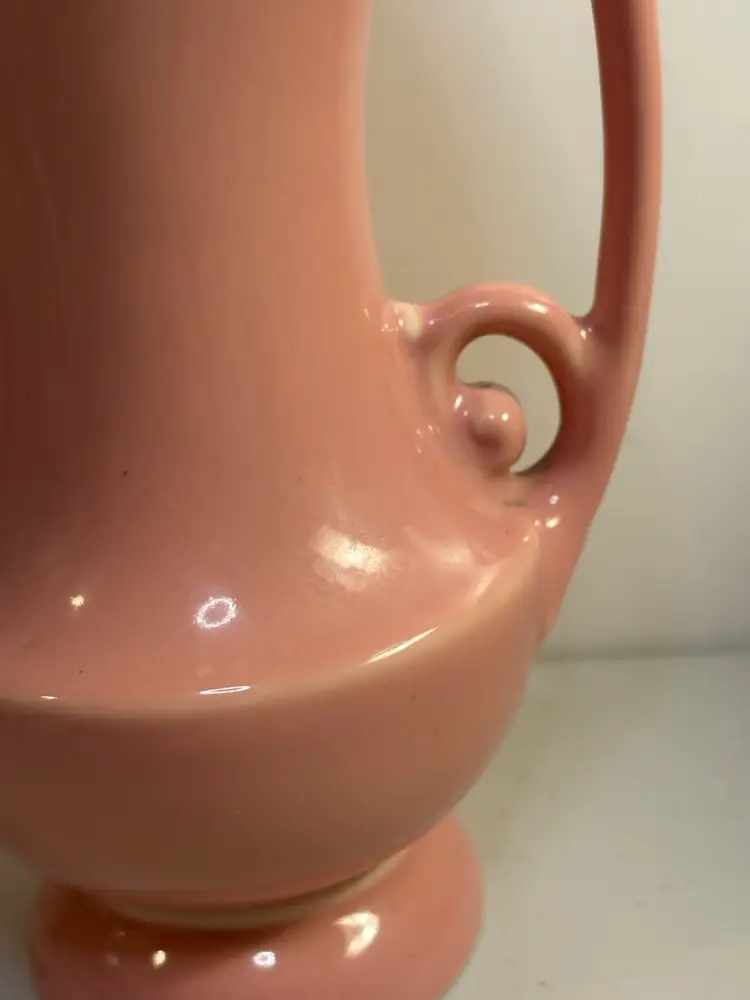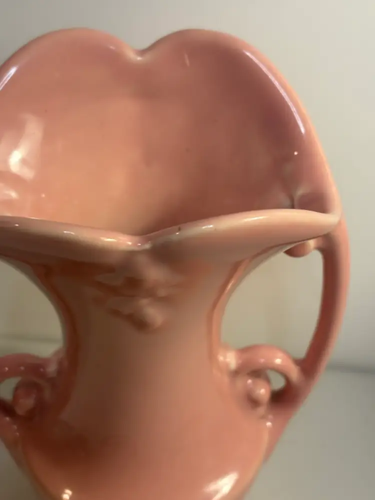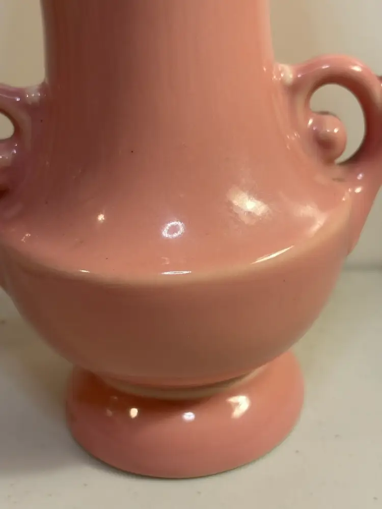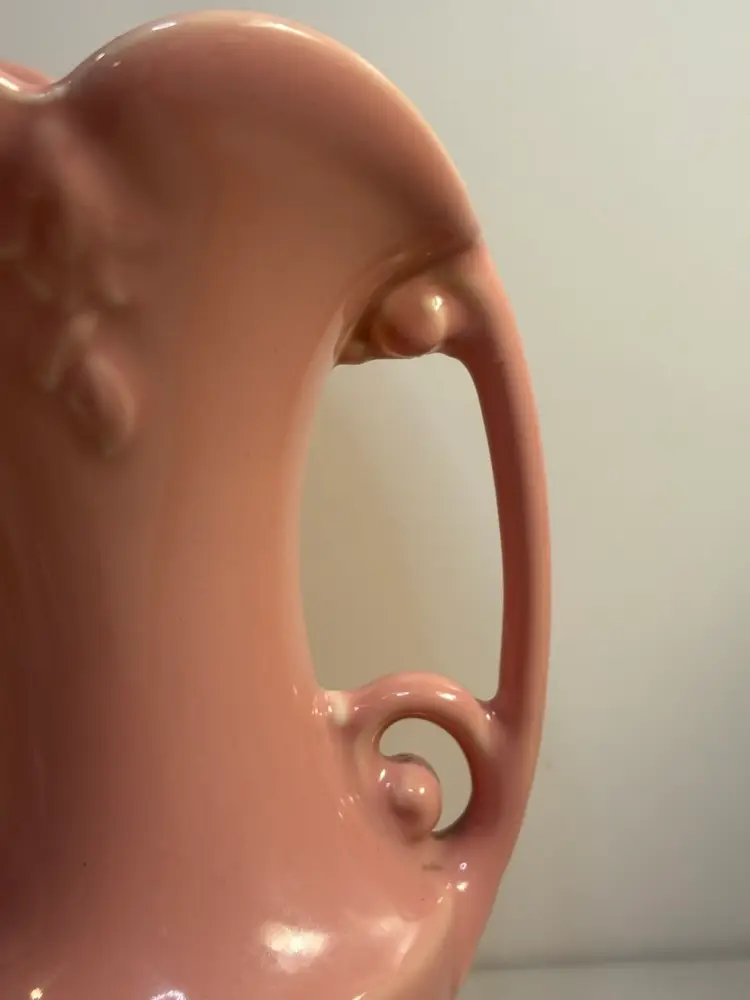 This vintage vase from the Abingdon Co. is a beautiful piece of pink ceramic art pottery with a leaves pattern. It features two handles and is a unique addition to any collection of decorative pottery and glassware. Made in the USA with traditional pottery techniques, this vase exudes a timeless charm and elegance that is sure to enhance any home decor setting.