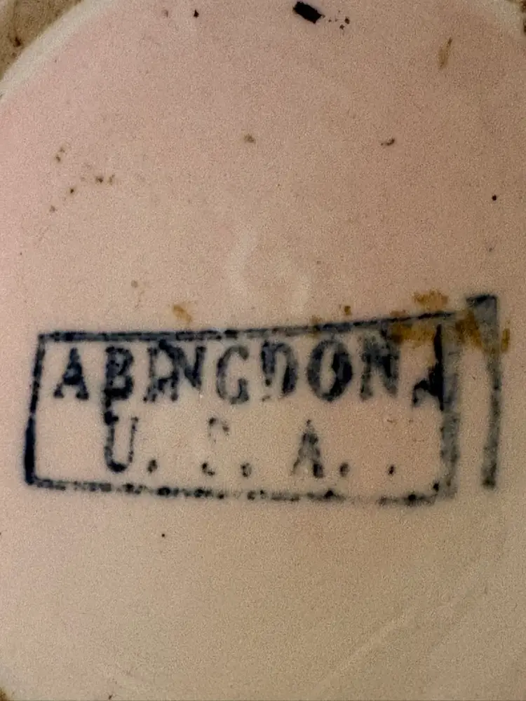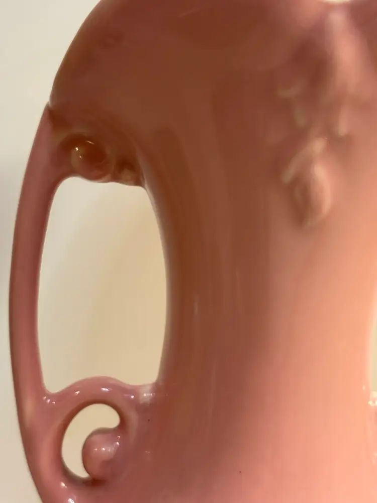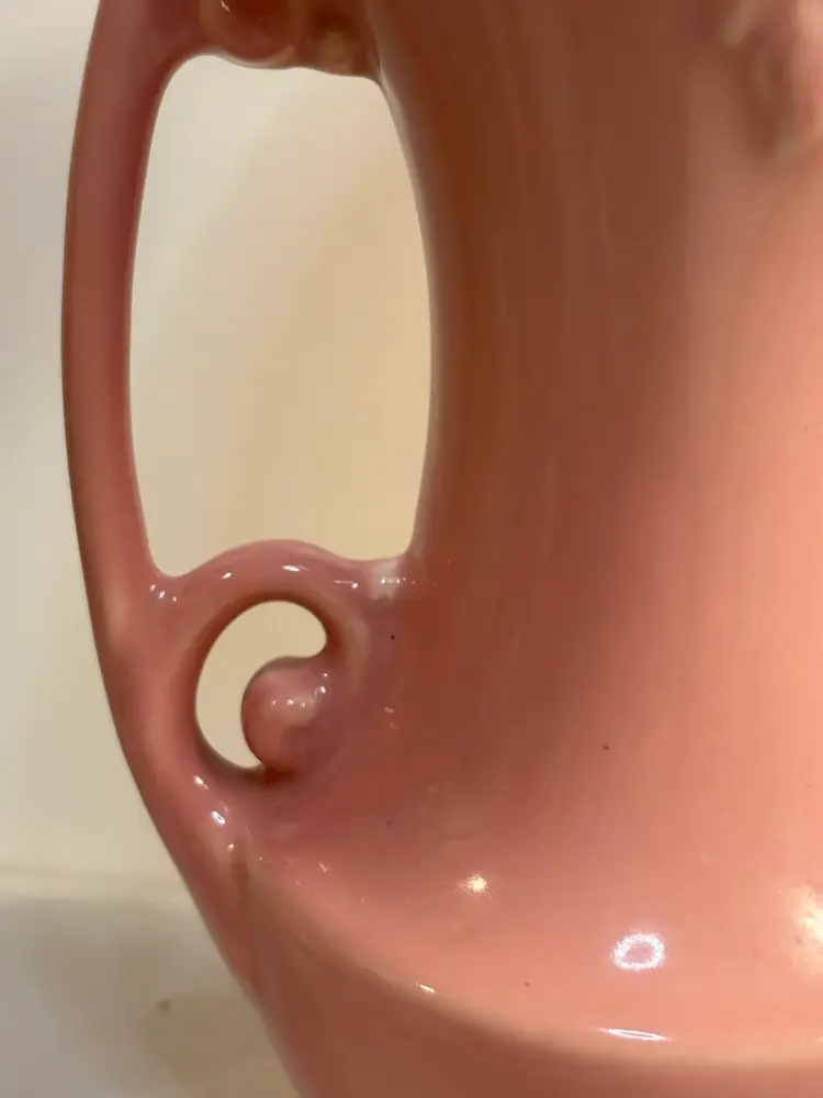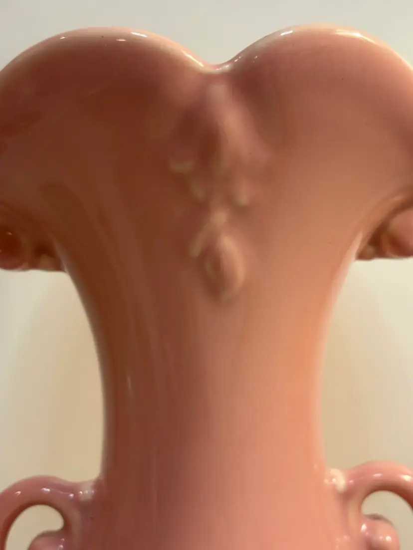 This vintage vase from the Abingdon Co. is a beautiful piece of pink ceramic art pottery with a leaves pattern. It features two handles and is a unique addition to any collection of decorative pottery and glassware. Made in the USA with traditional pottery techniques, this vase exudes a timeless charm and elegance that is sure to enhance any home decor setting.