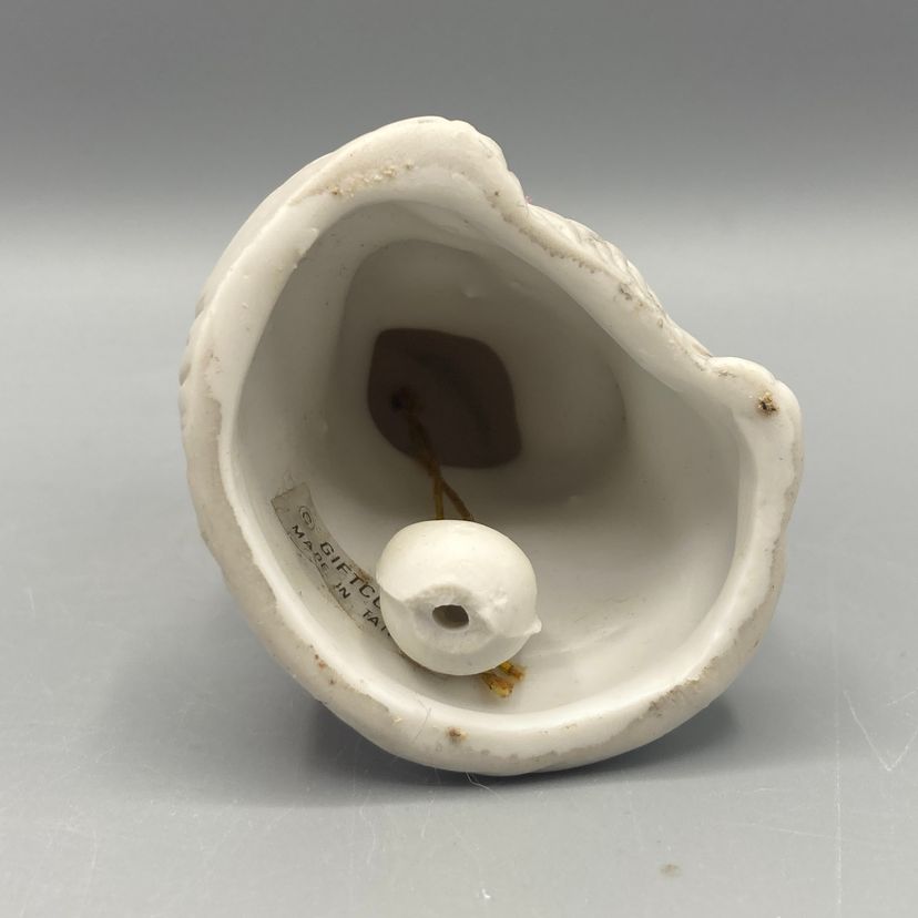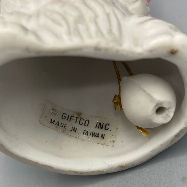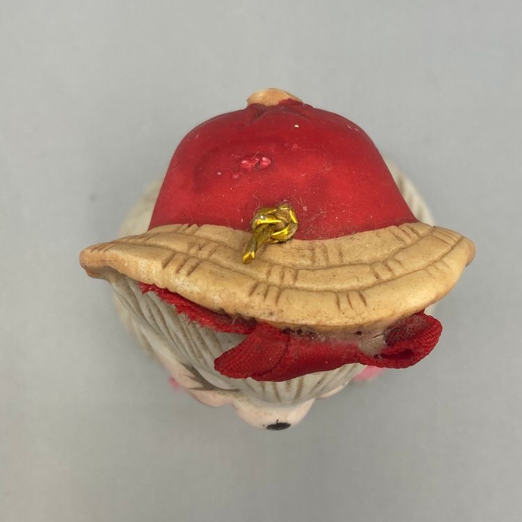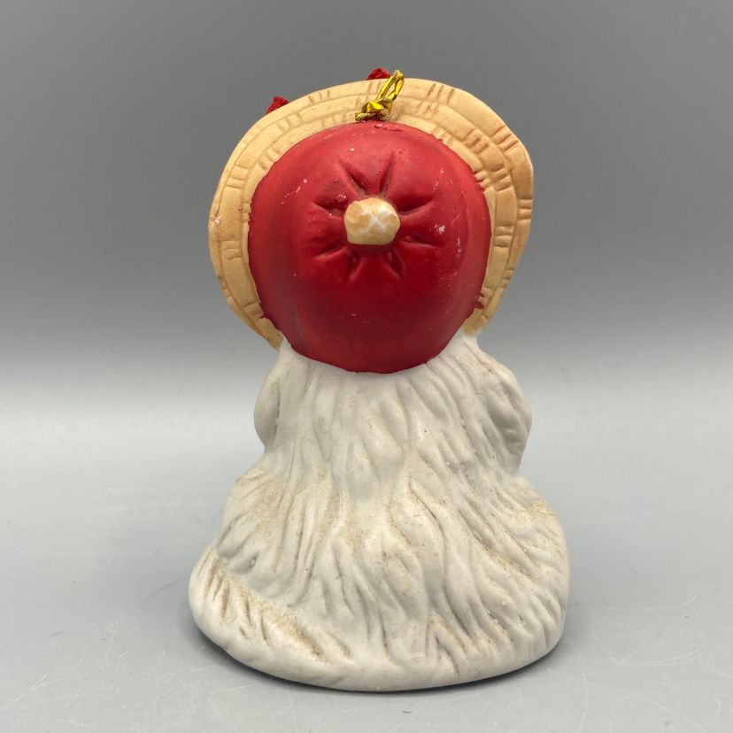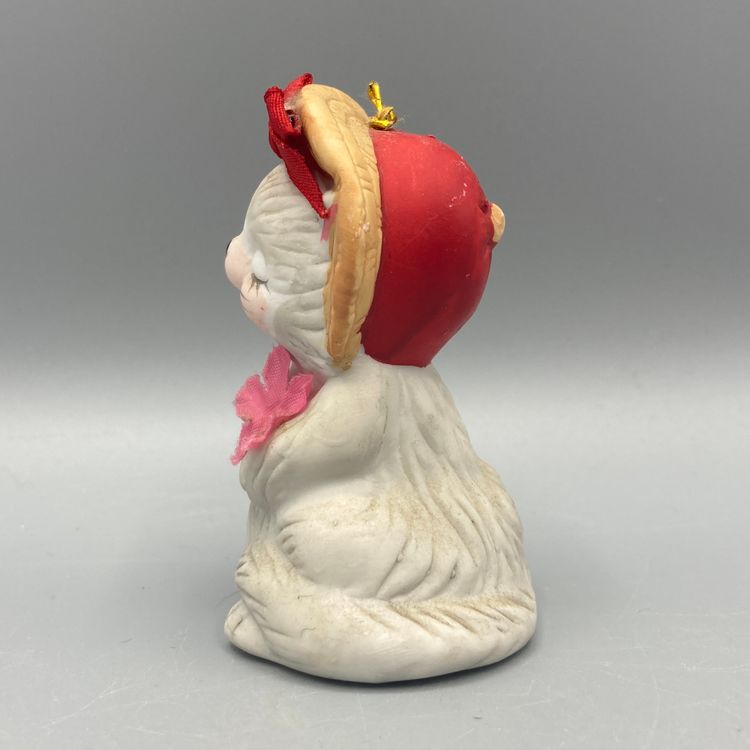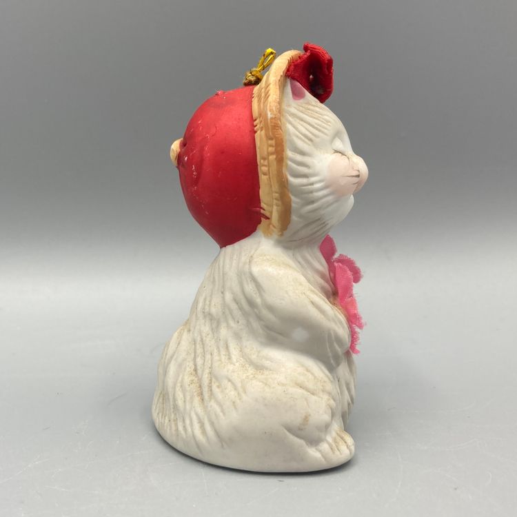 This cat bell is in good condition. (Not sure if there is missing fabric attachments). It can be used as a bell, or the string can be lifted up through the hole in the top and used as an ornament, but it would not function as a bell this way. It measures approximately 3" tall x 2" wide x 1 1/2".
