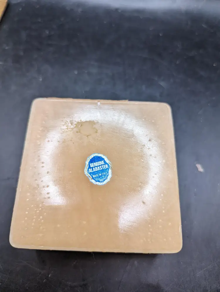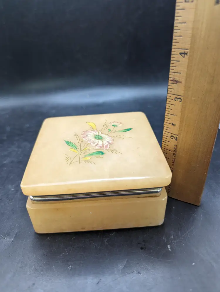 Keep your treasures safe in this charming vintage Alabaster trinket box featuring a delicate floral design. Perfect for adding a touch of elegance to your vanity or dresser. There is some wear as seen in last two pictures. Please see all pictures for condition and measurements.