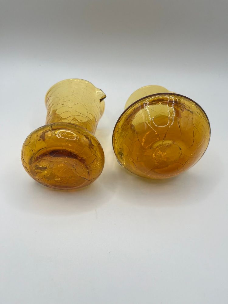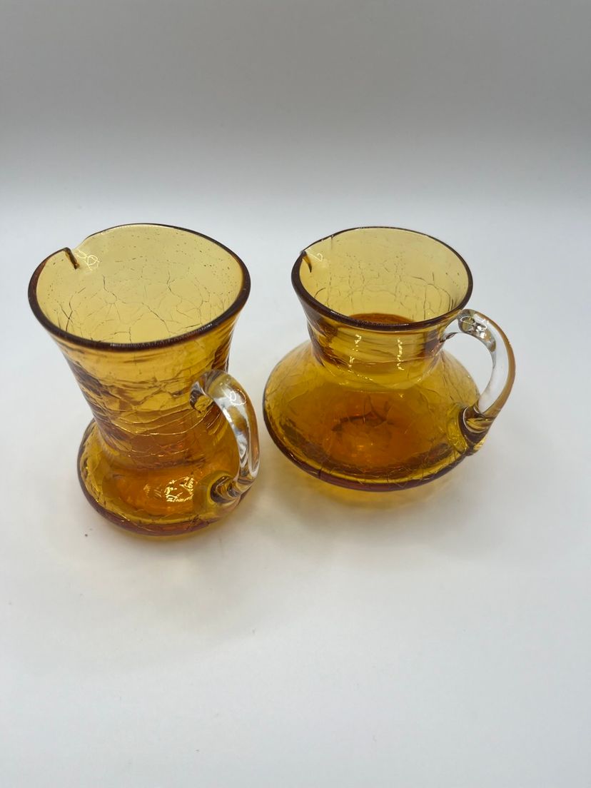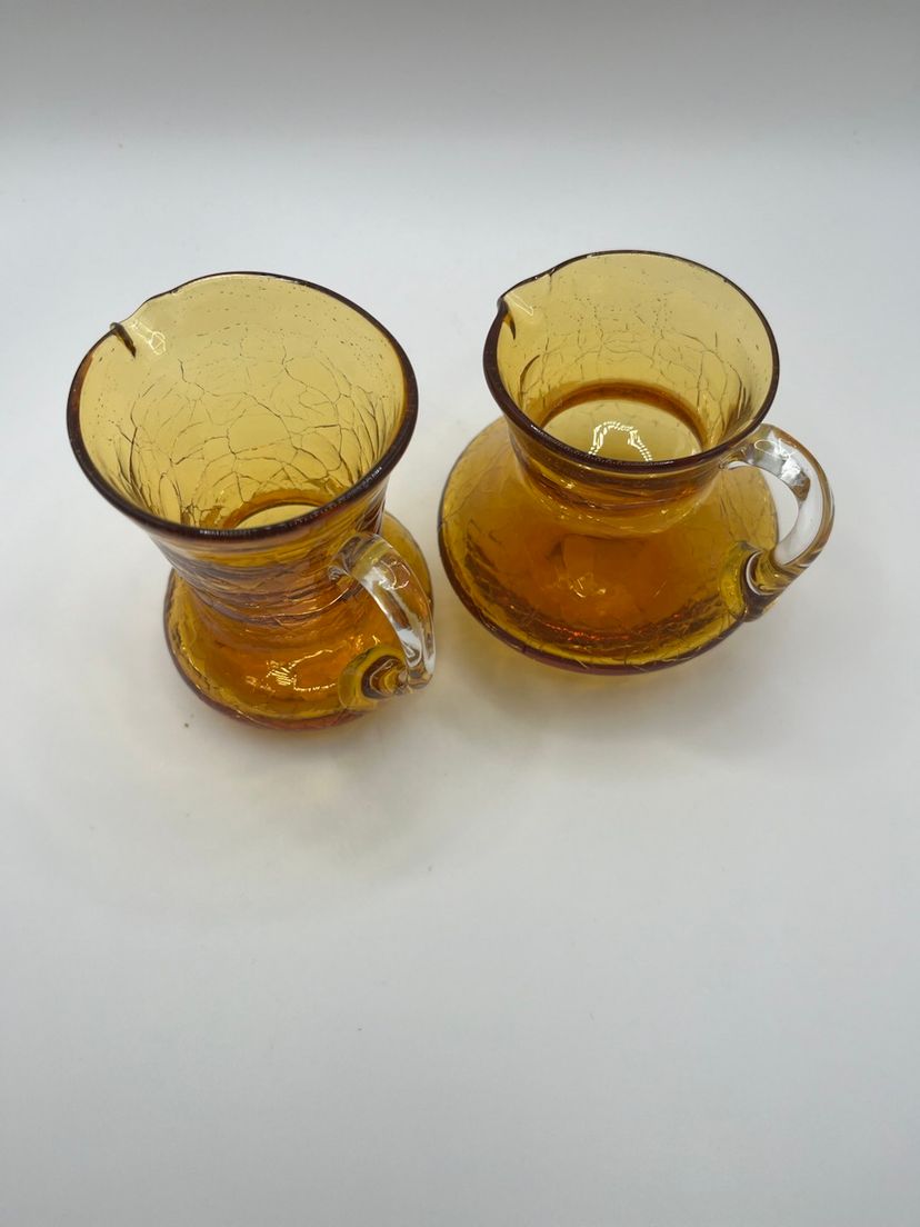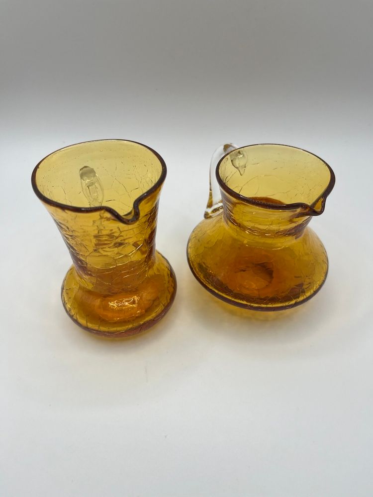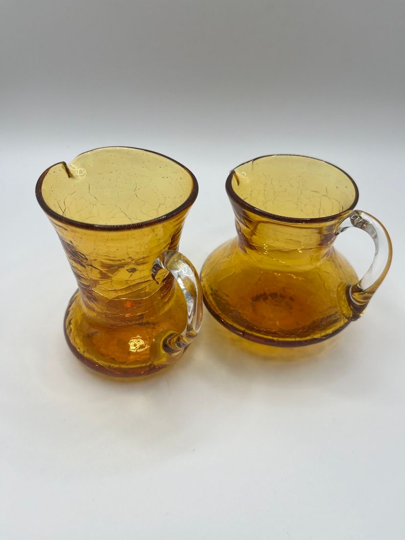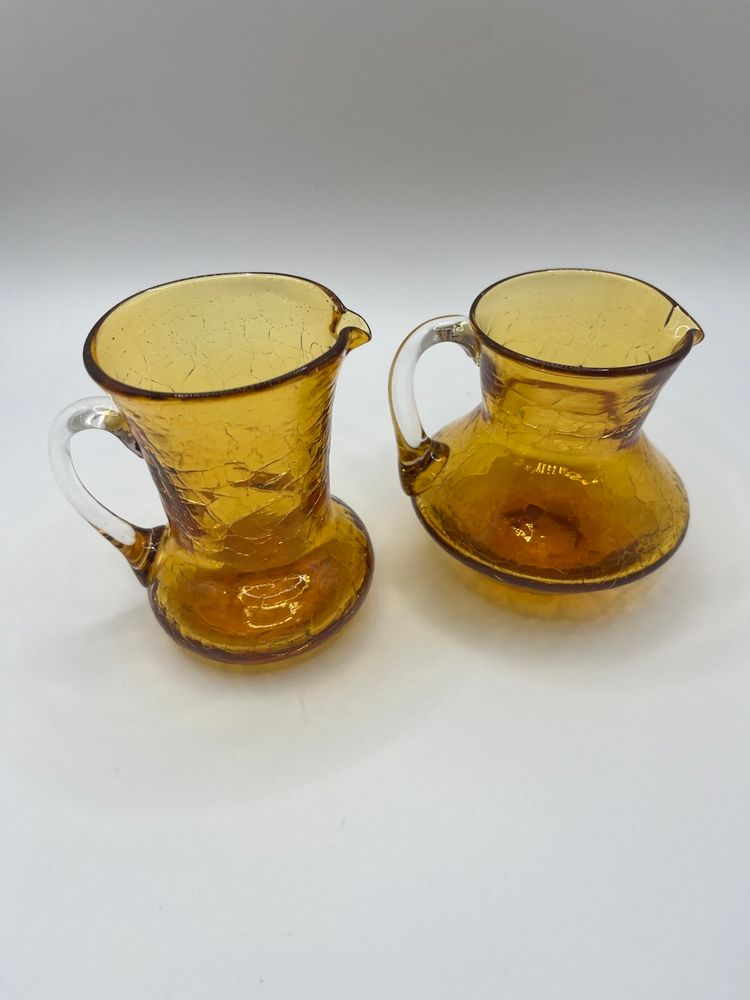 This is a set of two vintage amber crackle glass pitchers. Hand-blown glass and applied handles.