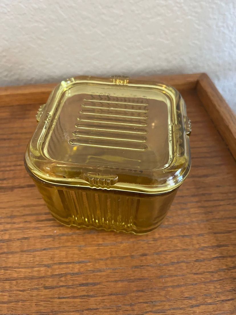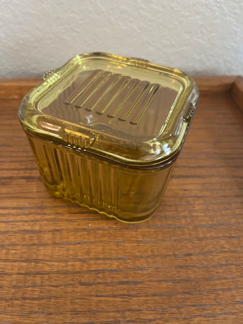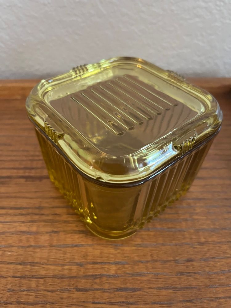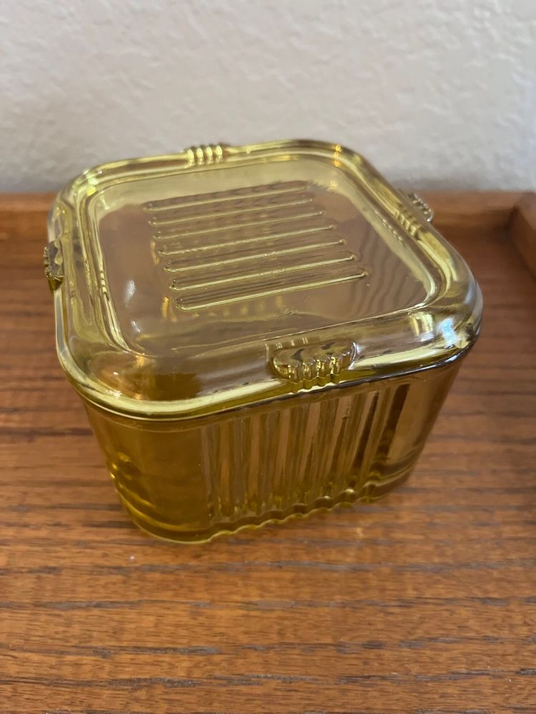 This is a vintage Federal Depression Glass refrigerator box in yellow/amber color with a ribbed design.