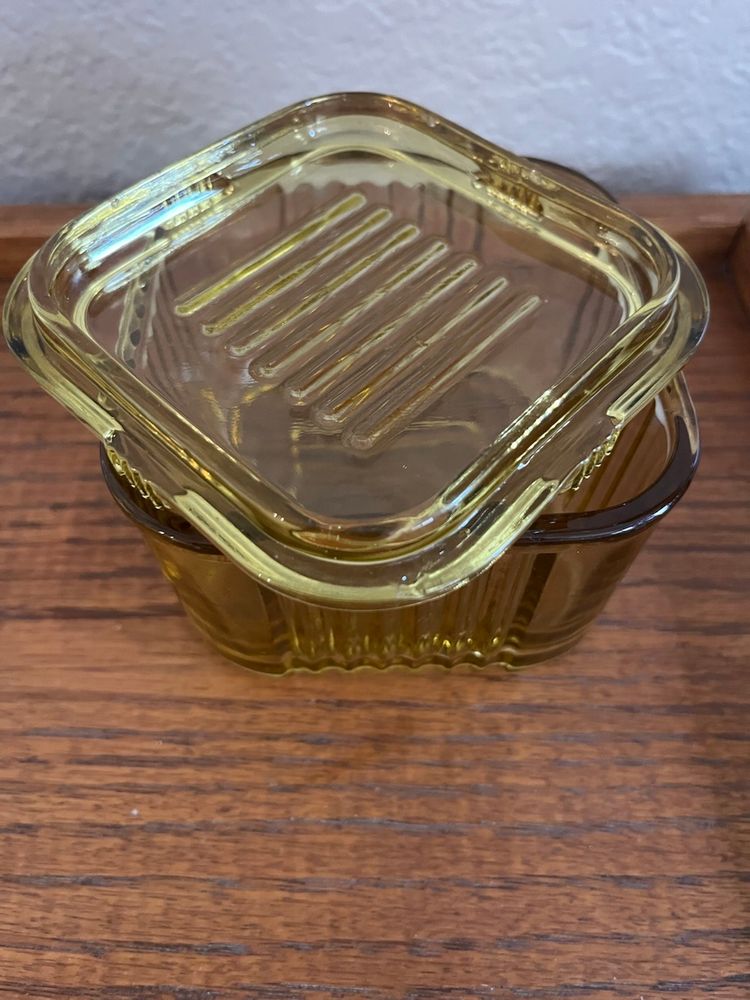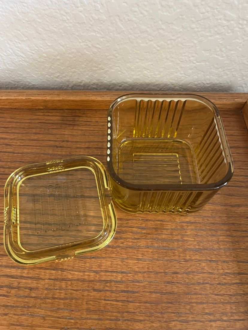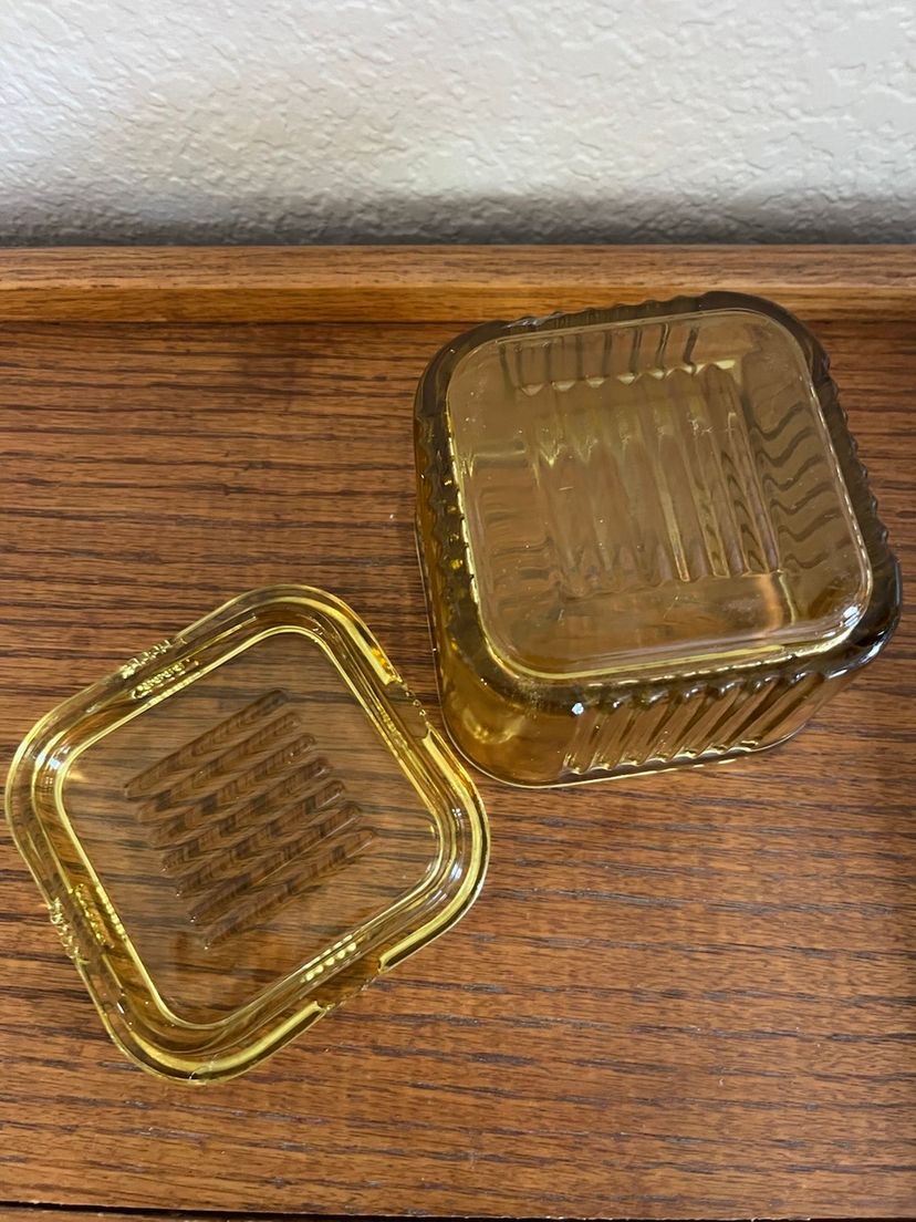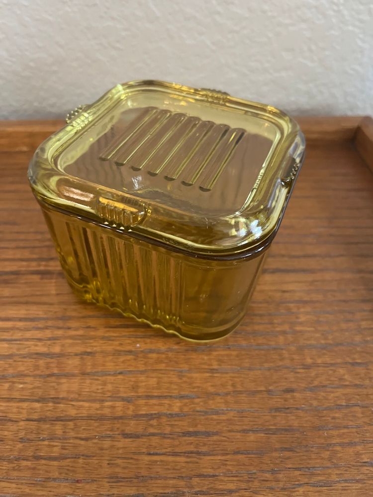 This is a vintage Federal Depression Glass refrigerator box in yellow/amber color with a ribbed design.