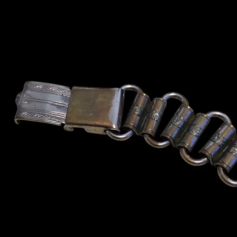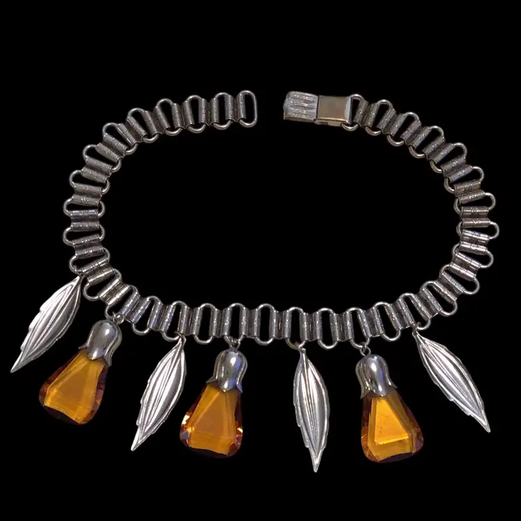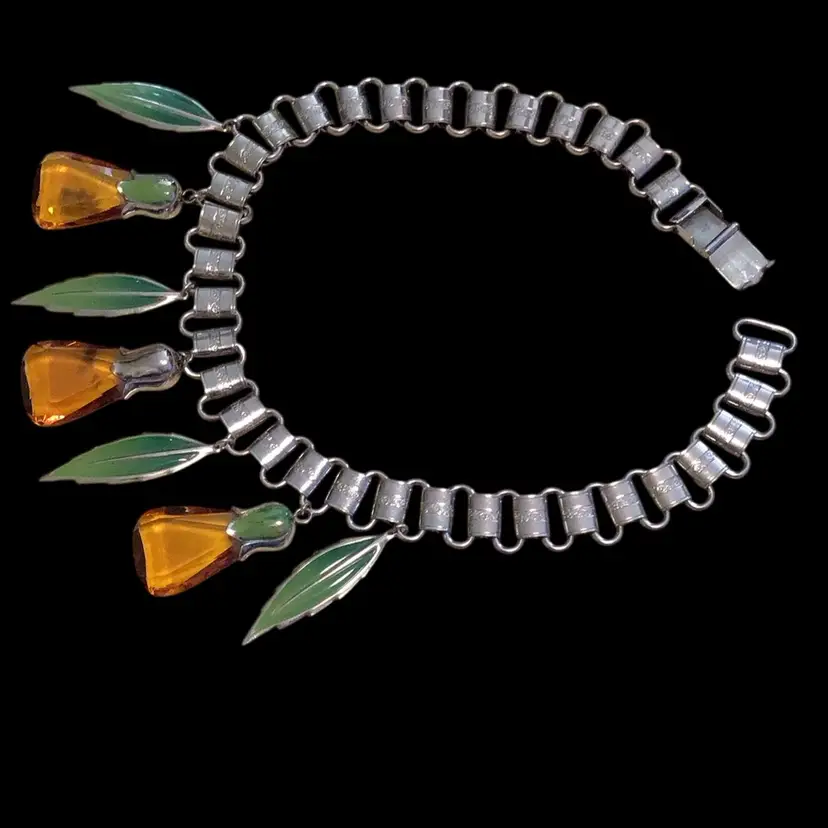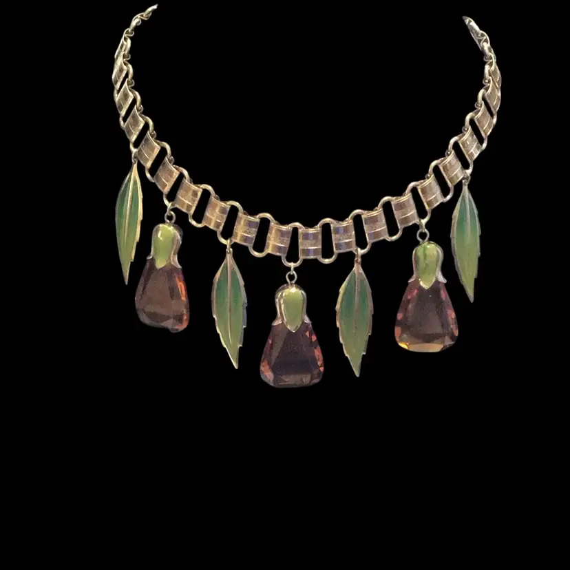 Book chain with faceted pear shaped dangles & green enameled leaves, choker length 15-1/2” small amount of wear to the enamel on pears & to the backside of chain. Dates from the 1940s. #594