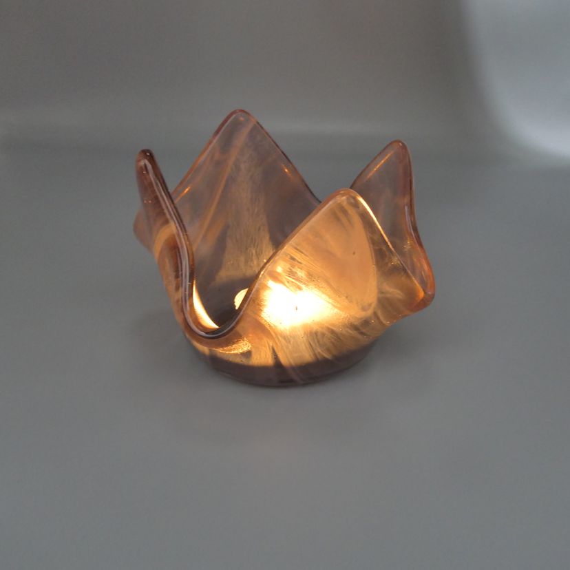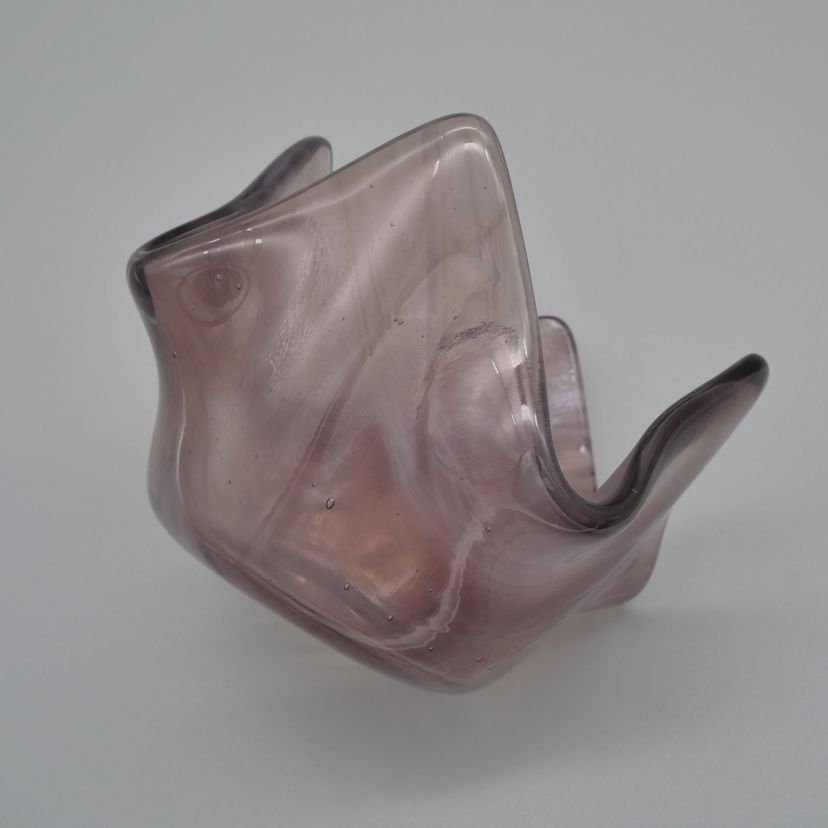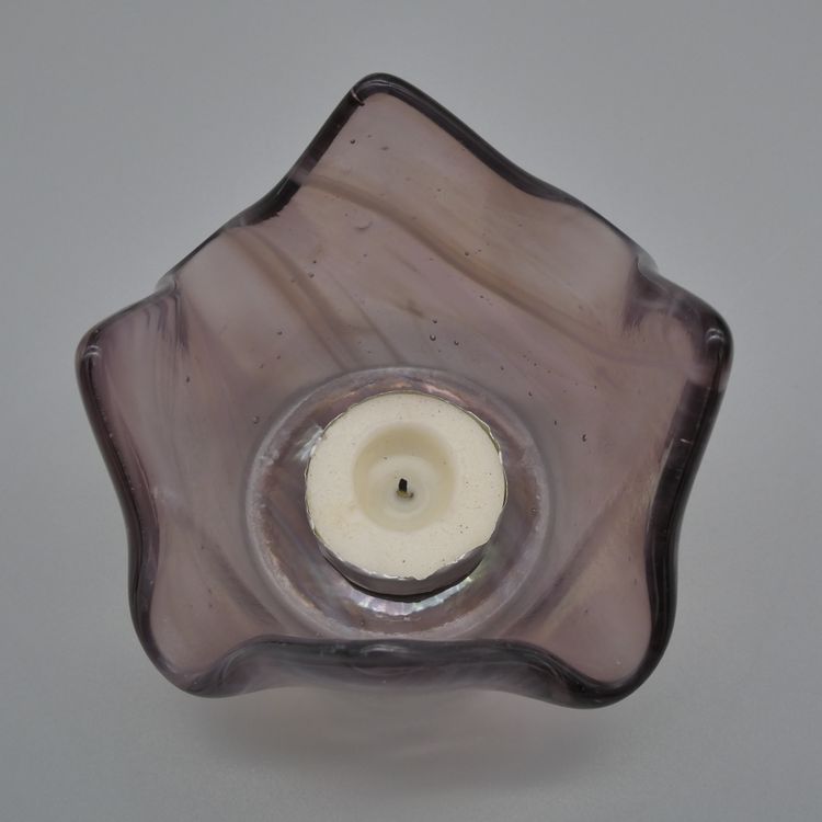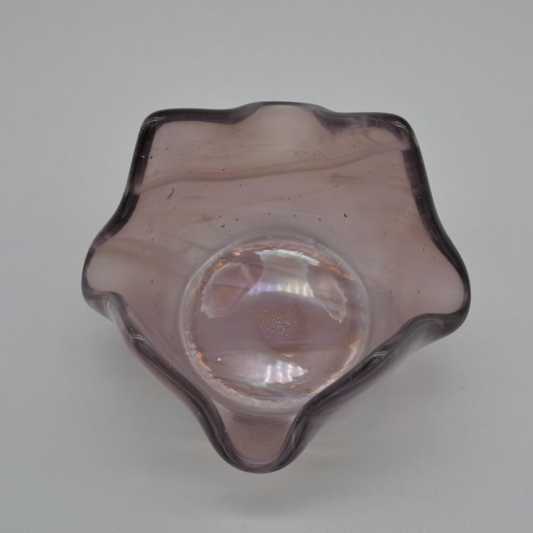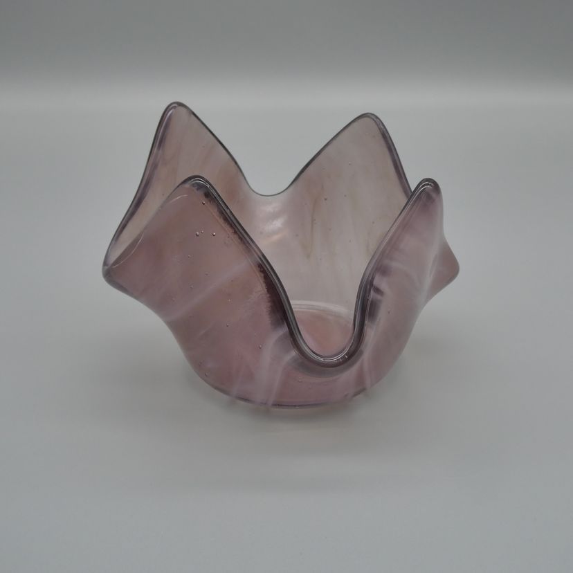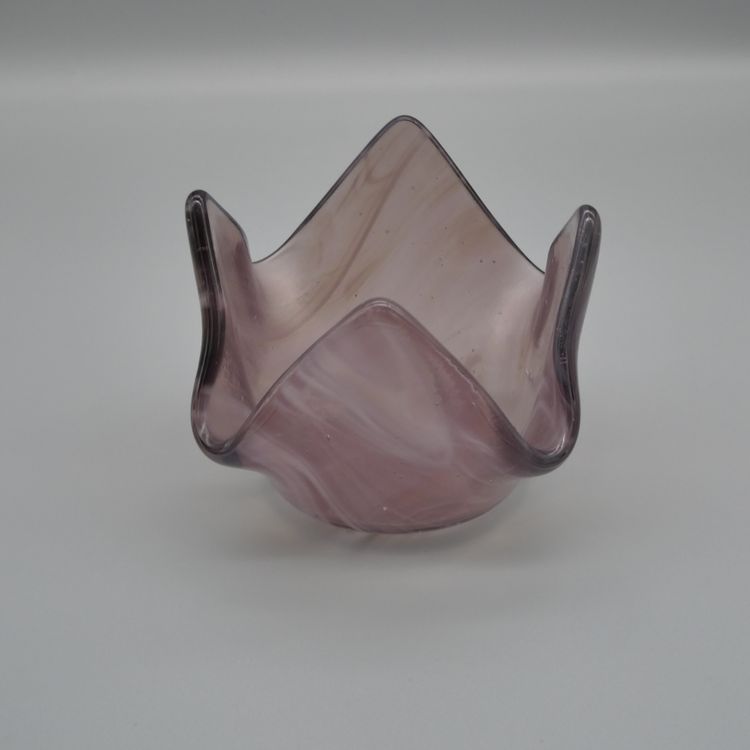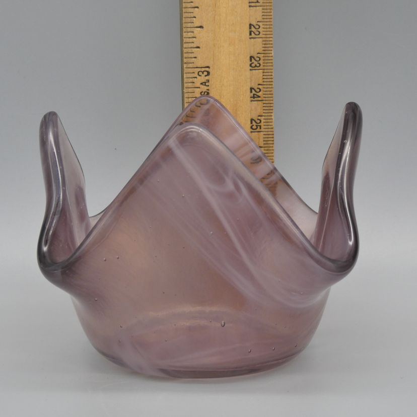 Featuring an amethyst purple handkerchief-shaped glass dish Hand-formed translucent slag glass with milky swirls Perfect for tealight candles, small votives or as a trinket dish Measures overall about 4-3/8" across x 3" tall at its tallest point with a 2-1/2" base Weighs about 8.5 ounces before being packaged to ship