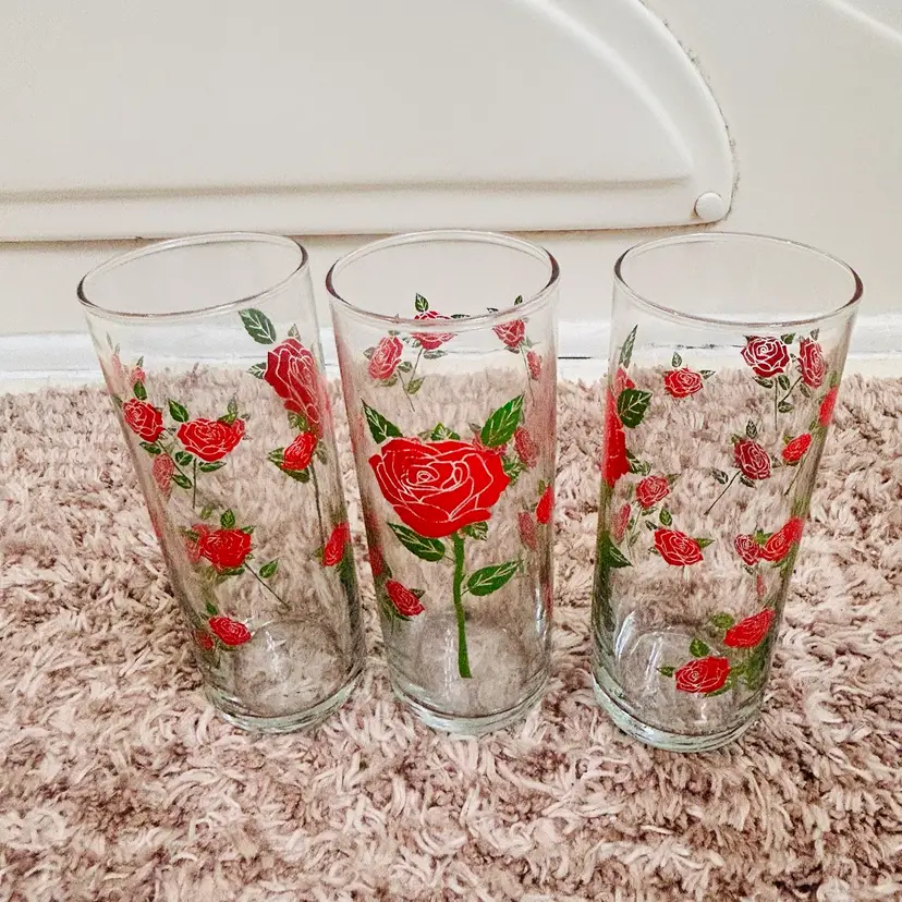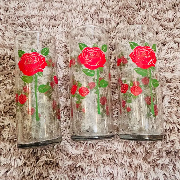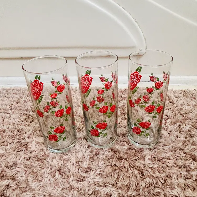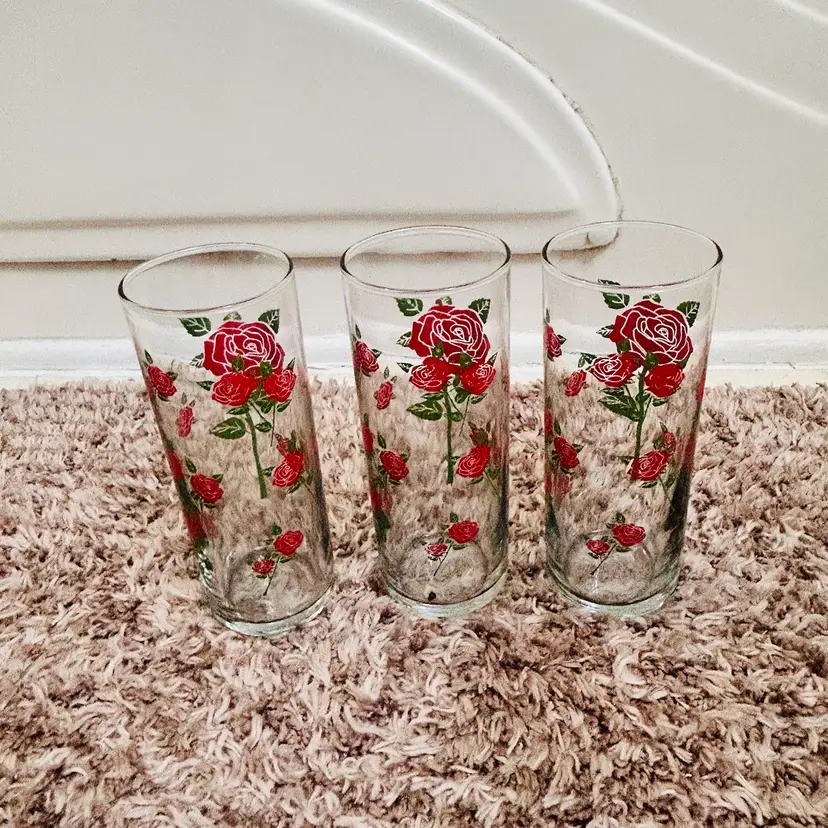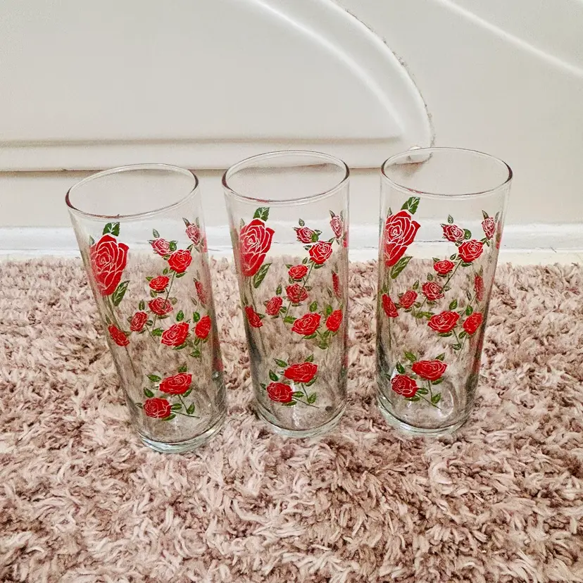 Vintage Anchor Hocking Red Rose 6.5 Inch Highball Iced Tea Glasses Set of 3
