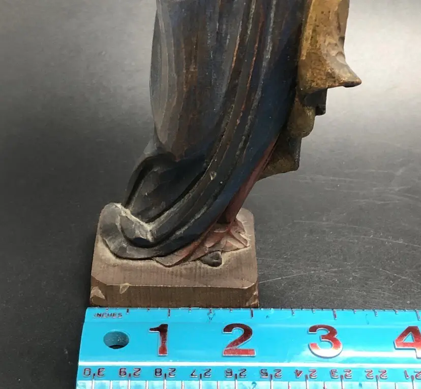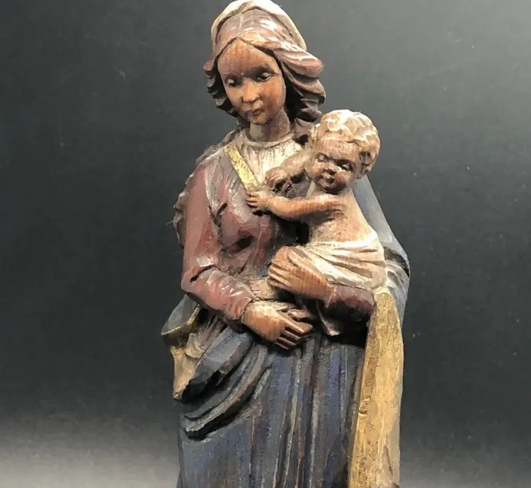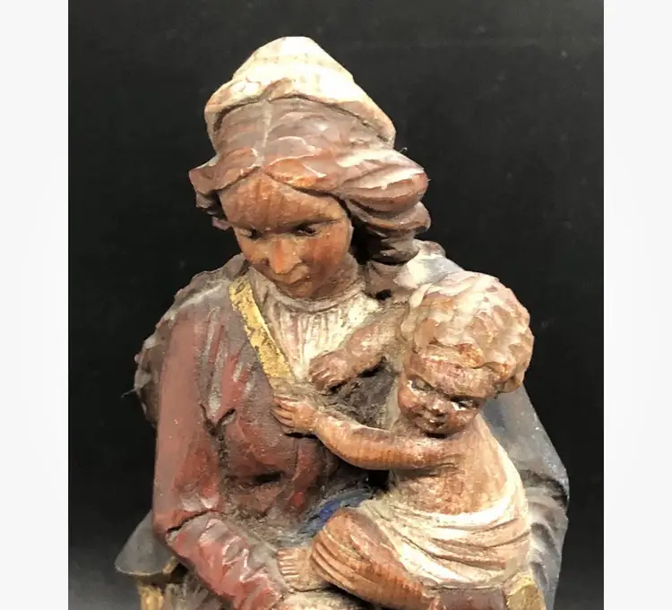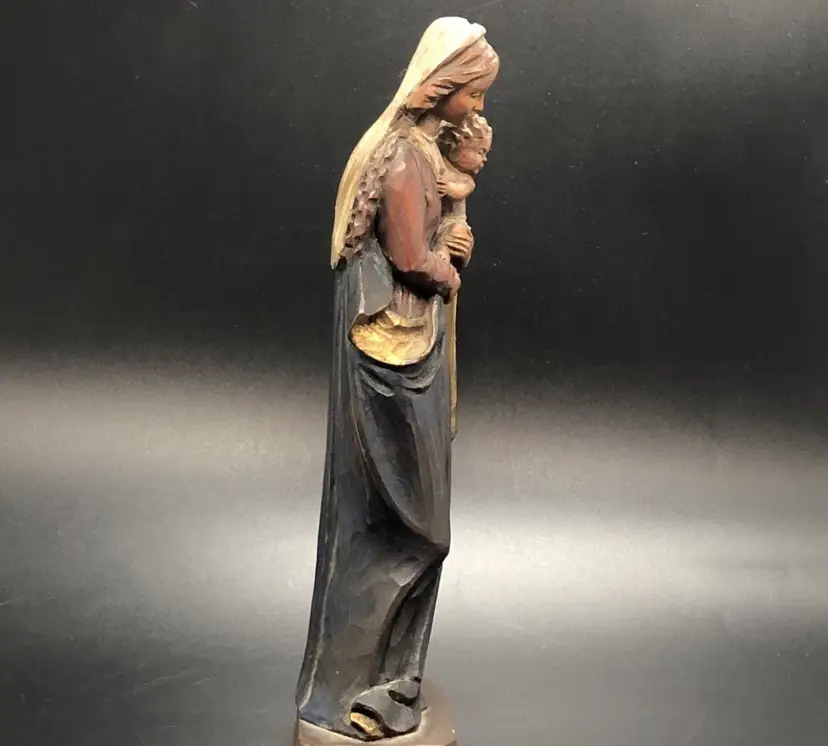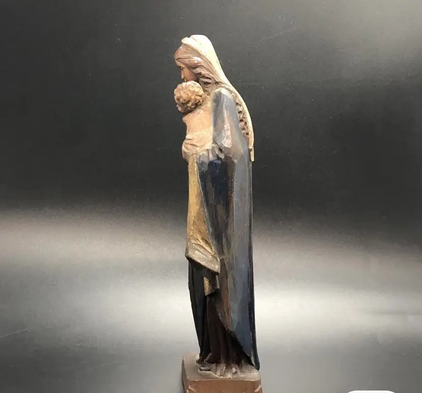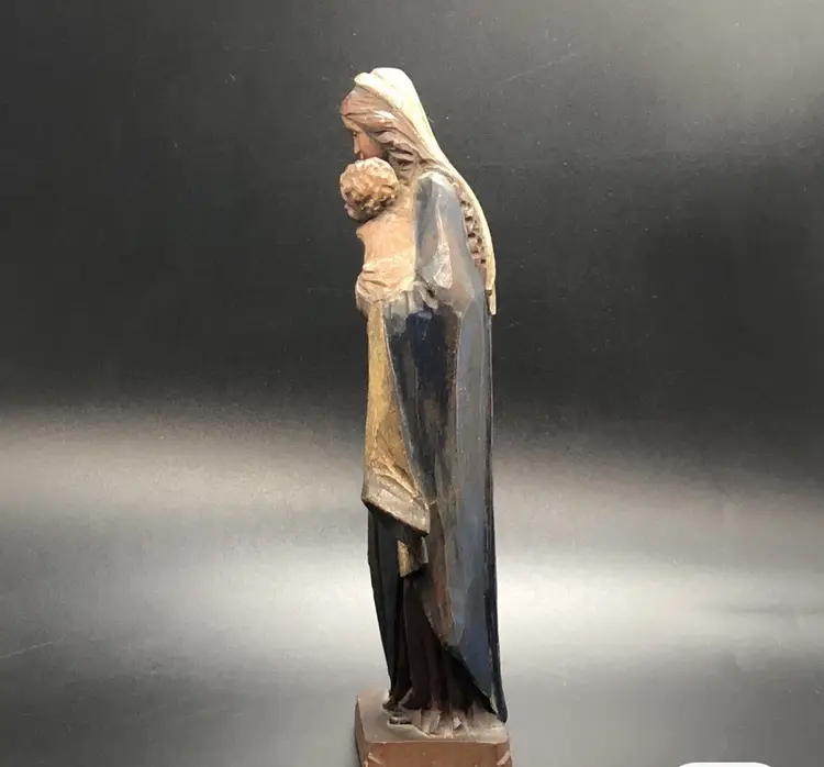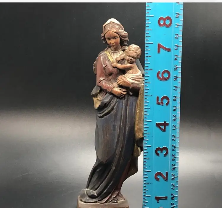 This vintage ANRI carved wood and painted Madonna and Child statue is a beautiful piece of art created by artist M.K. Kaslatter in Italy. The sculpture, measuring 8 inches in height, showcases intricate craftsmanship and attention to detail, reflecting the European culture and religious theme. Handmade with a carving production technique, this original piece is a unique addition to any art collection, signed by the artist to ensure authenticity. The statue depicts a classic Madonna and Child subject, making it a meaningful and timeless piece for any art enthusiast. This vintage piece is in good condition for its age. It has minor marks on the base and dress due to natural age and wear. Please check photos. Any questions please message me. Thank you ๐