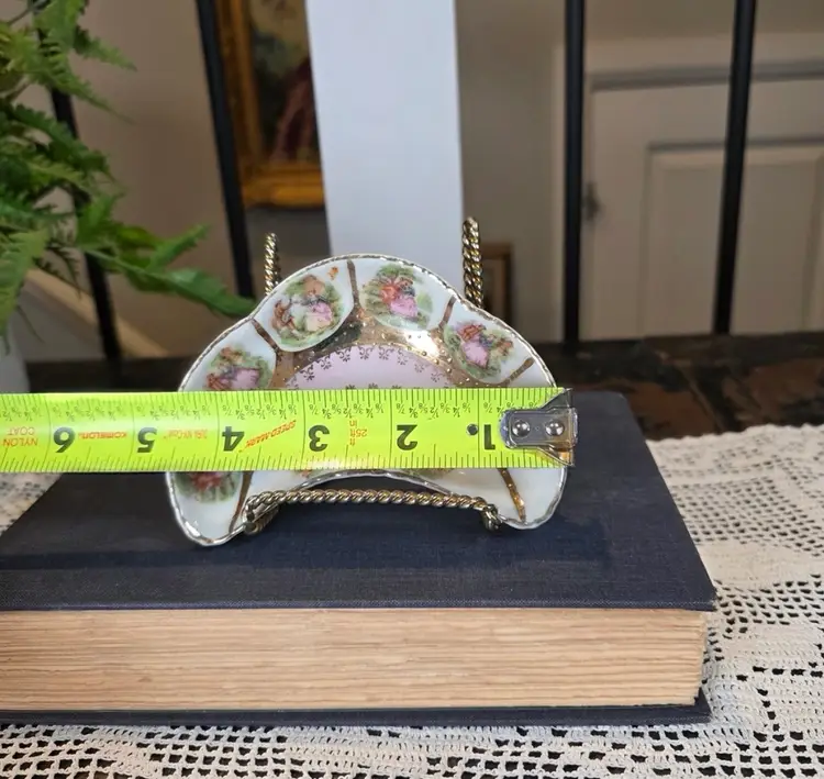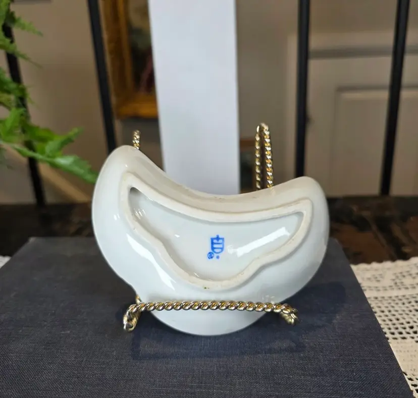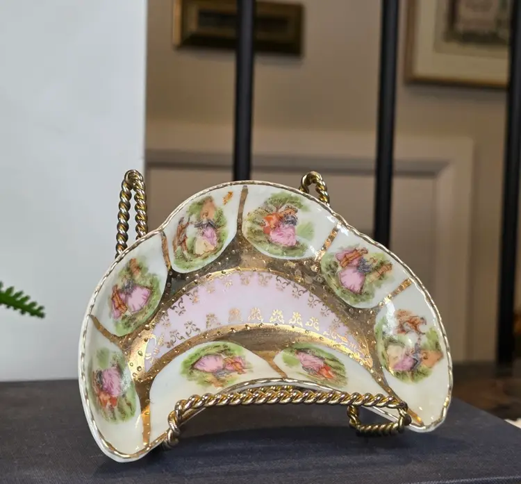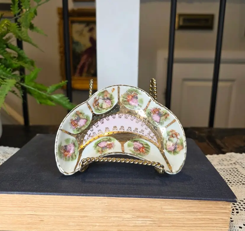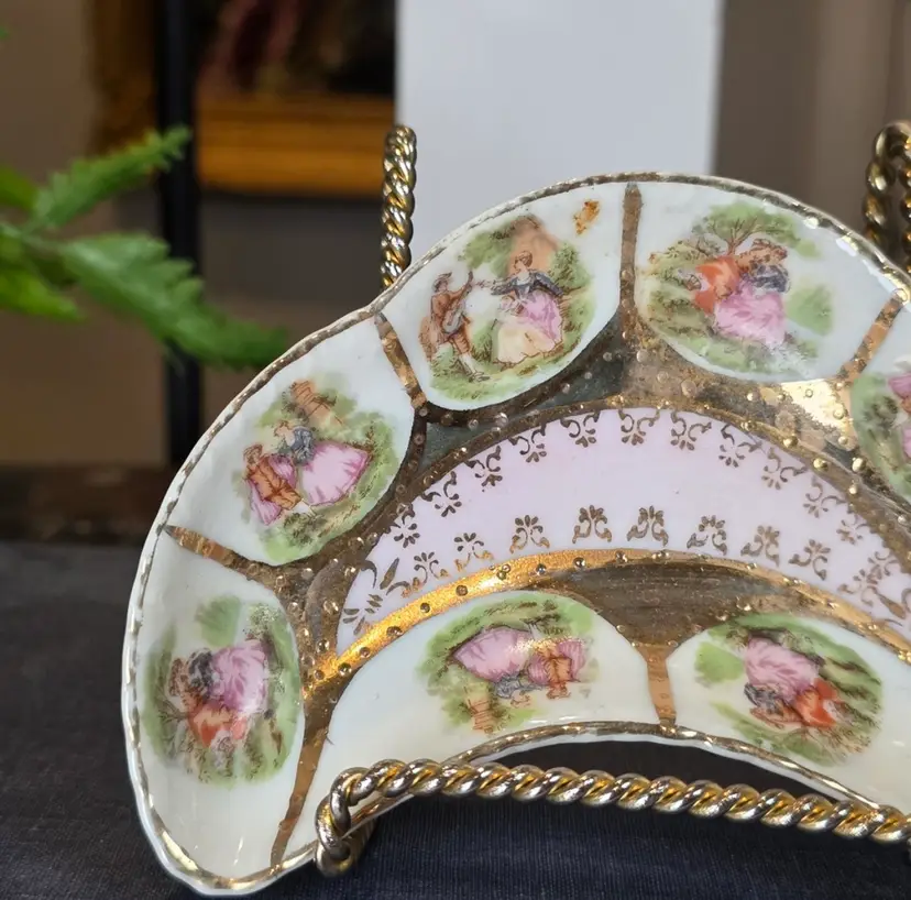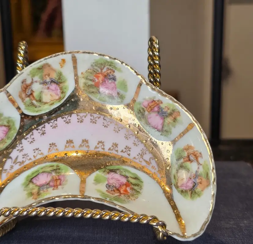 This exquisite and highly decorative small dish is an authentic piece imported by Arnart Creations (often sold under names like Arnart 5th Avenue or Royal Vienna Arnart). Arnart specialized in importing "Victorian" style porcelain pieces featuring romantic, 18th-century European motifs. Manufacturer: Attributed to Ar art Creations (an importer of Japanese/Taiwanese porcelain). Style: Inspired by the expensive European Meissen/Dresden pieces, featuring the iconic Fragonard-style courting couple vignettes in six separate, gold-framed segments. Coloration: Features a beautiful, soft baby pink background in the center, richly decorated with intricate gold stencil work and bold, heavy gold trim throughout the entire dish. Shape: Distinctive crescent or half-moon shape, which is a desirable form for collectors of vanity and decorative dishes. Function: Perfect as a trinket dish, ring dish, individual bonbon or candy holder, or simply as a charming decorative accent for a vanity, dresser, or shelf in a Grandmillennial or Rococo aesthetic. 5” l x 1” h. This item is in beautiful vintage condition. Given the age and material (imported porcelain with applied gold trim), there may be slight, minor wear to the gold finish in places, which is common and expected. Please examine all photos closely.