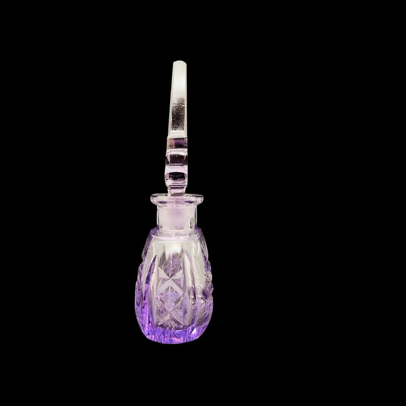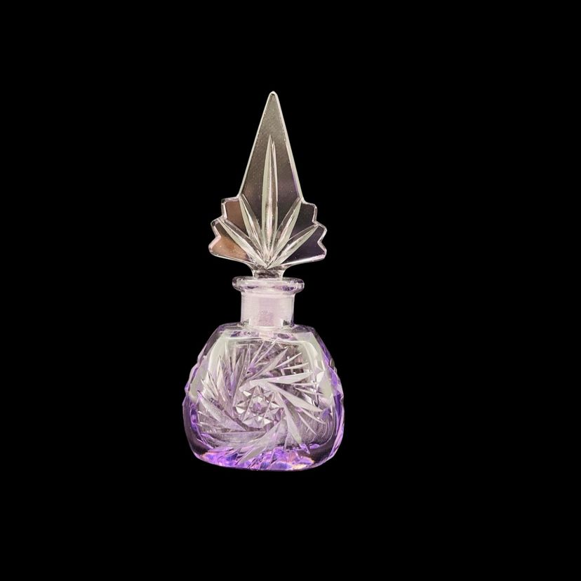 Beautiful vintage art deco Czech purple cut glass perfume bottle with stopper, star and pinwheel design. In very good vintage condition with no major chips or cracks; some small chipping around the top and one very small chip on side of stopper (see photos)