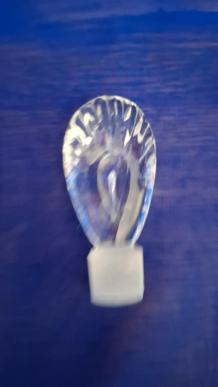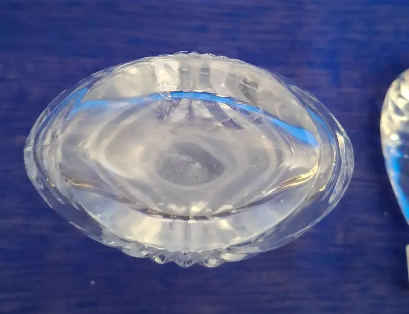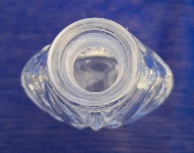 Vintage Art Deco–Style Perfume Bottle – 4½ Inches – Fan Stopper – Vanity Decor This charming vintage perfume bottle features a sparkling pressed-glass body with a layered Art Deco fan design, paired with a matching fan-shaped stopper. Measuring 4½ inches tall and 2¾ inches wide, it catches the light beautifully and makes a lovely display piece for a vanity, dressing table, or perfume collection. The stopper seats well, and the glass is clear and bright with no chips or cracks. A delightful little collectible for lovers of Deco-inspired décor and vintage perfume bottles.