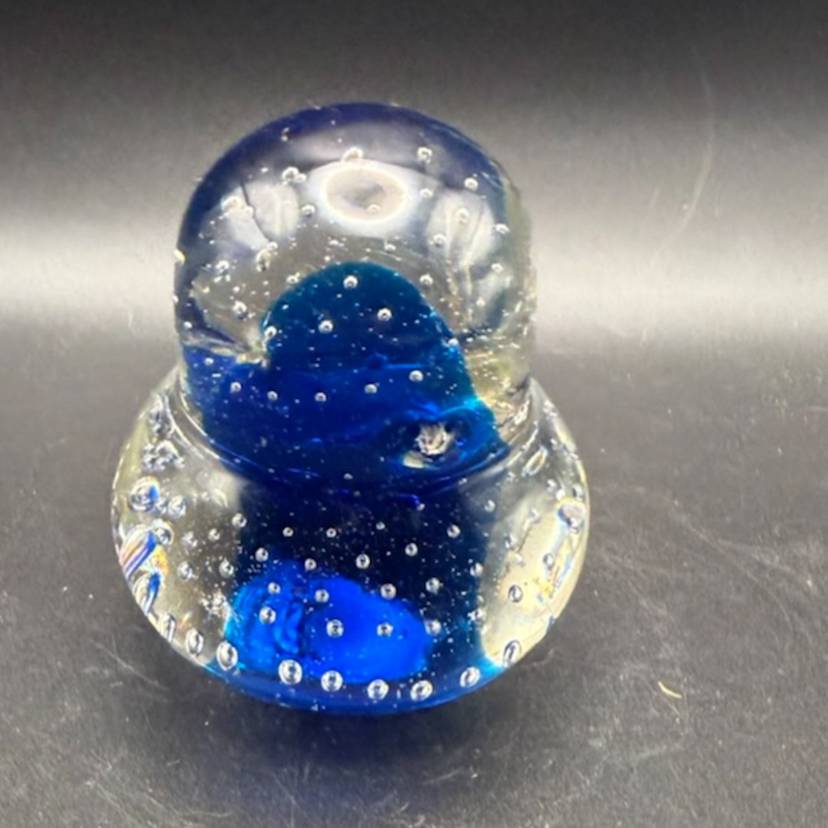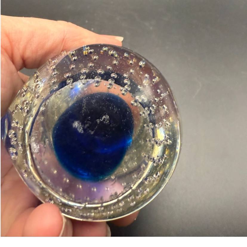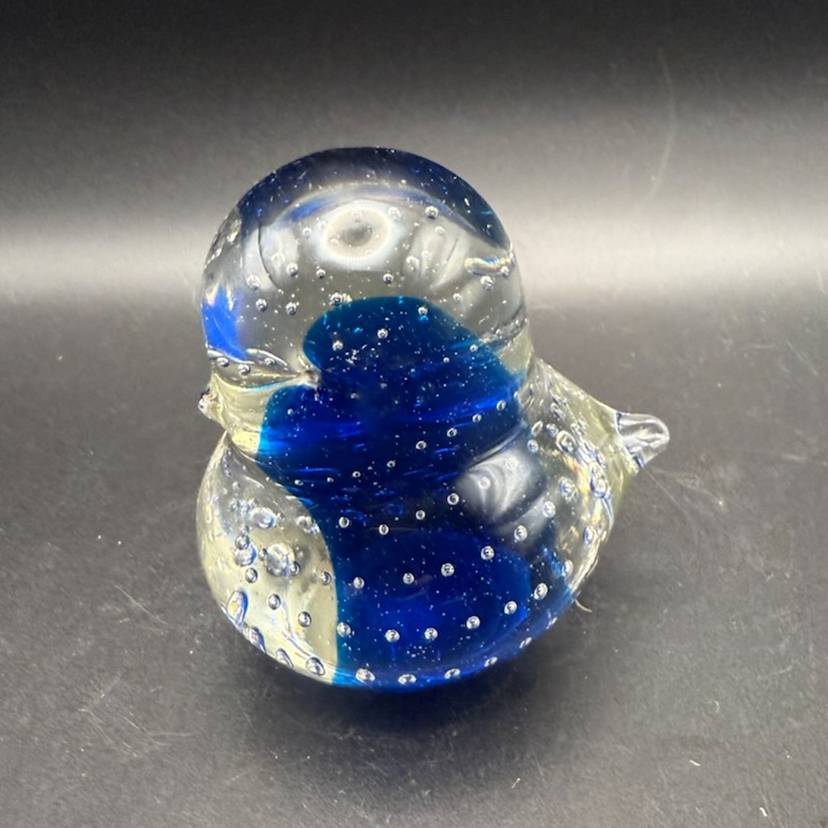 The bullicante technique, characterize d by the deliberate inclusion of controlled air bubbles within the glass, creates a mesmerizing visual effect, adding depth and sparkle to the piece. This particular figurine, shaped like a bluebird, is a classic example of decorative art glass popular in the mid-20th century, often used as paperweights or decorative accents.