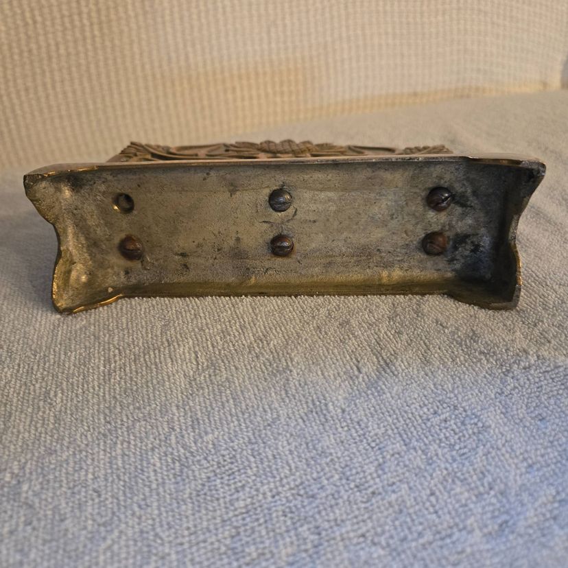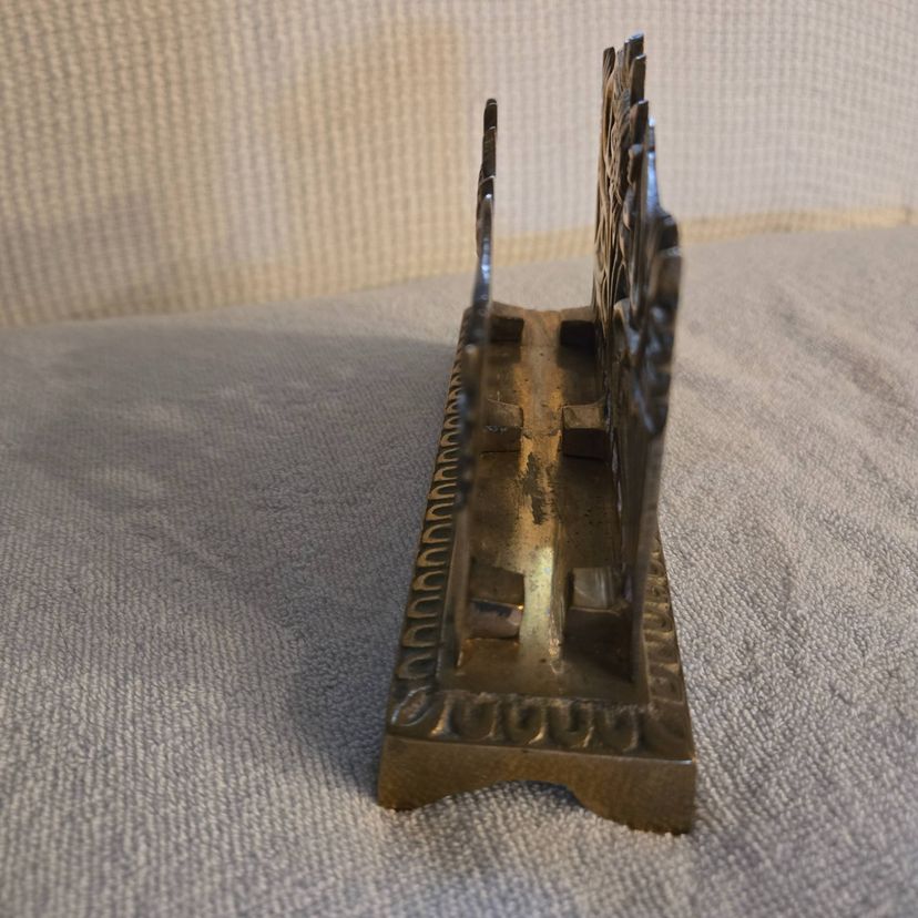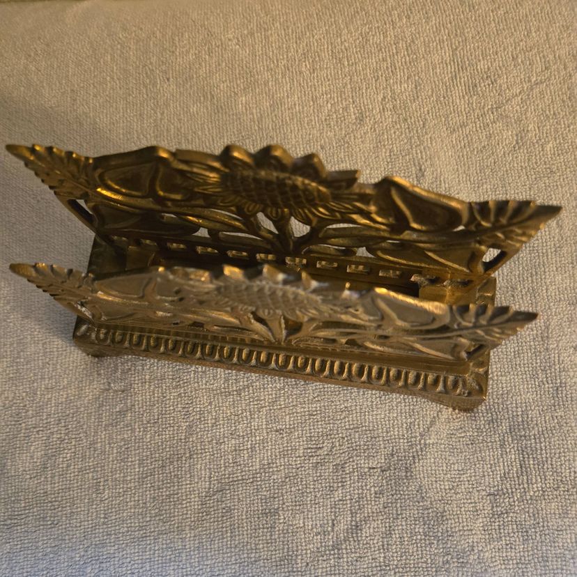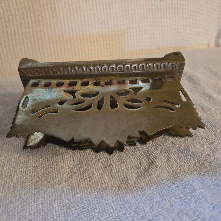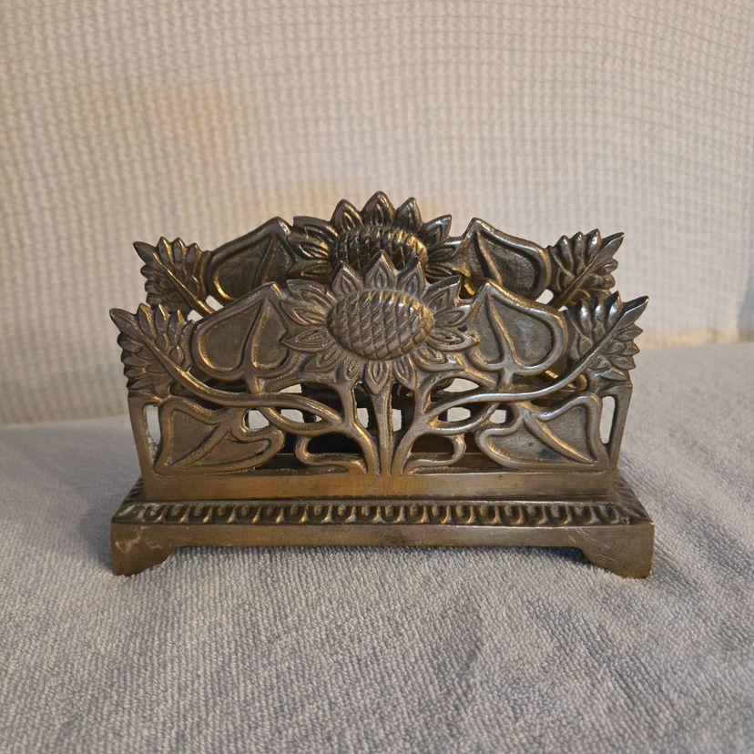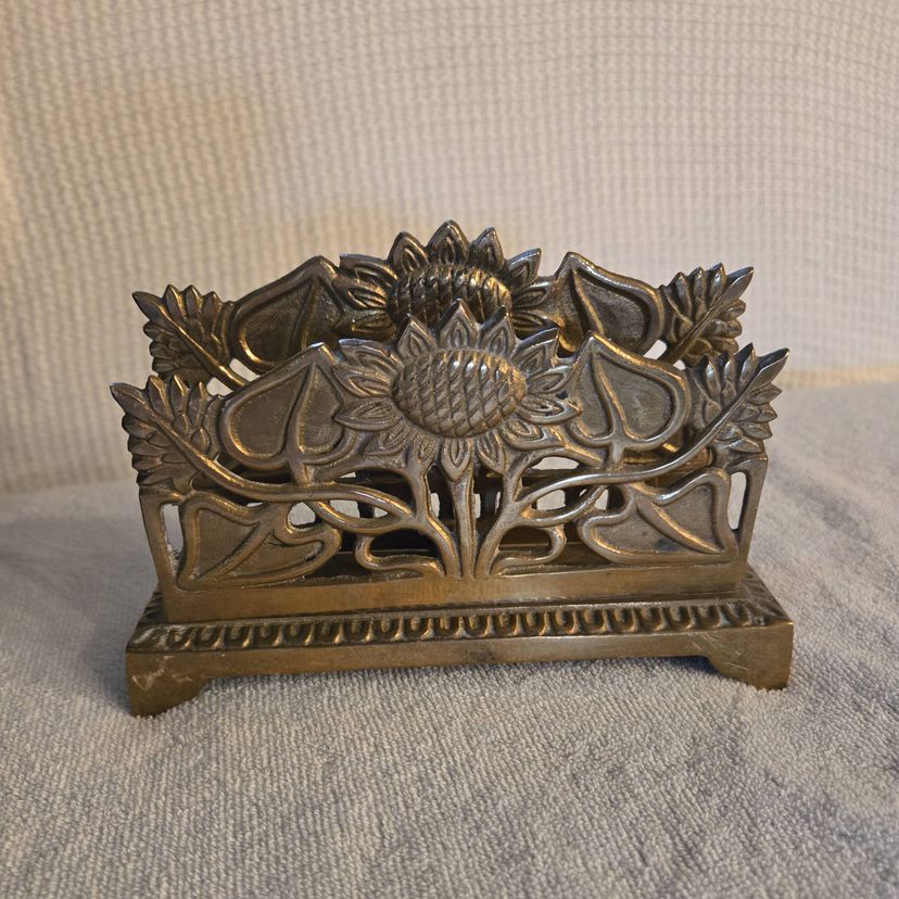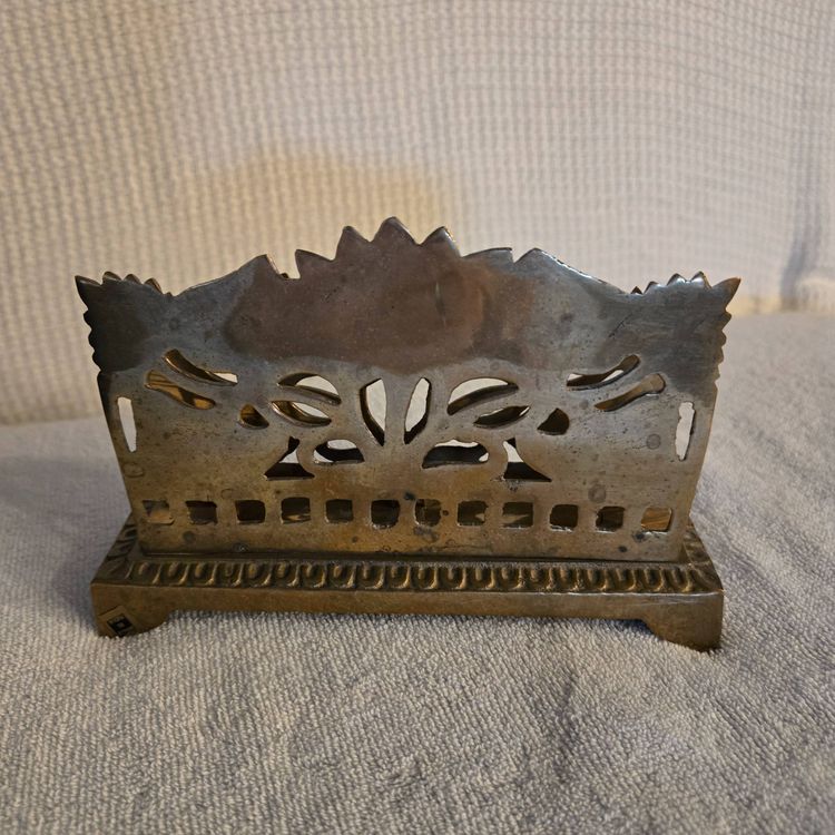 Featuring a beautiful desk top brass holder in art Nouveau design. It can hold your letter, napkins, or recipe cards. A unique and desirable piece to add to any collection. It has a beautiful patina that i will leave you to decide if you want to polish. Stands 3 3/4" tall, 6 1/4" wide and 2 " deep. Is missing 1 screw on the bottom. In beautiful condition.
