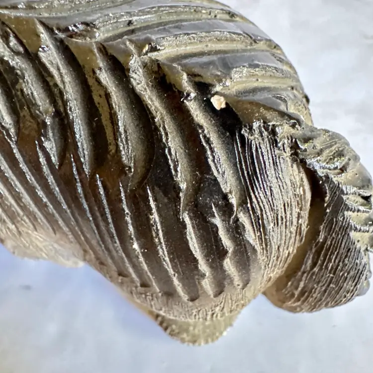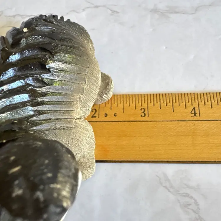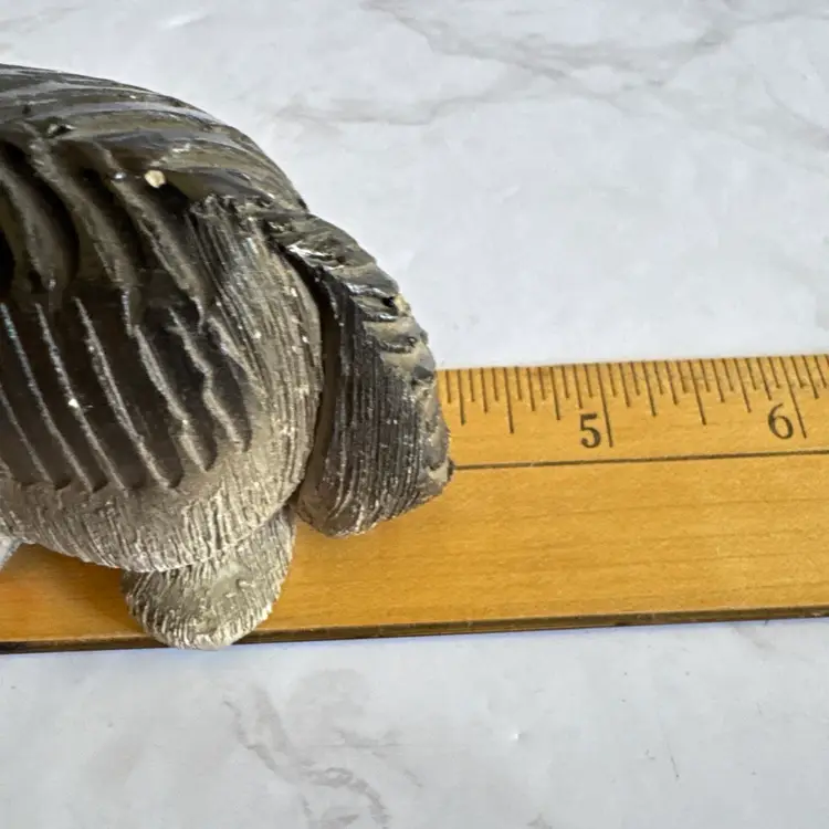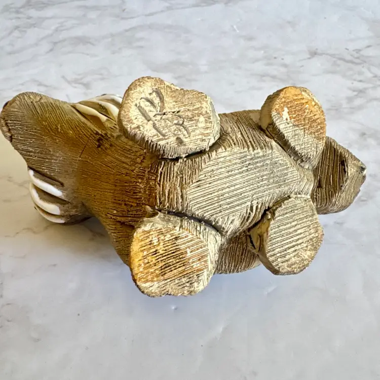 Has many little chips to the pottery. See photos. 4” x 2-1/4” x 2-3/4”h