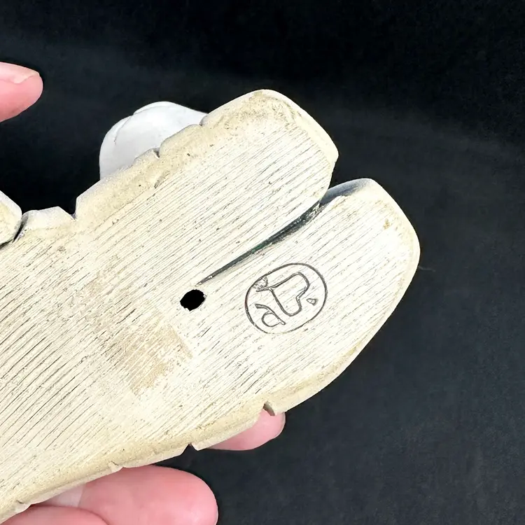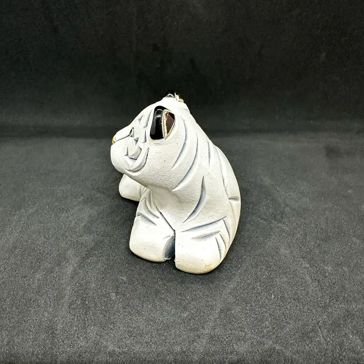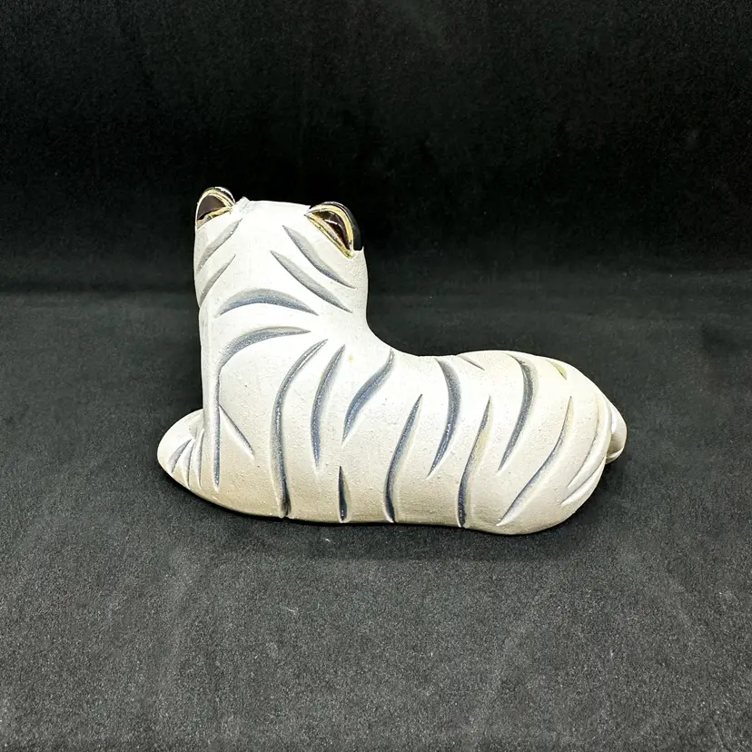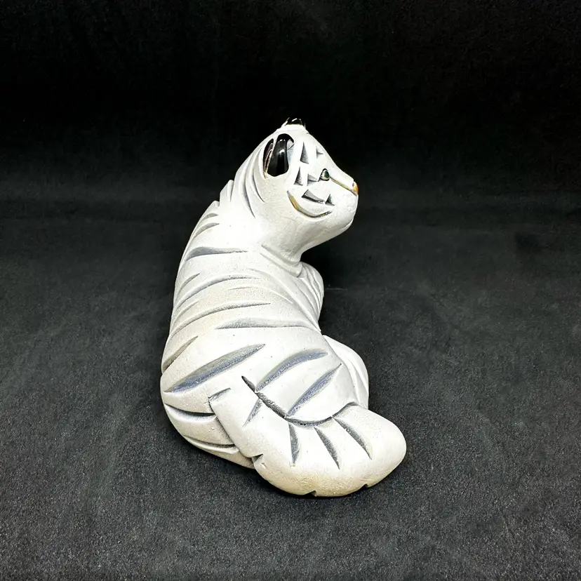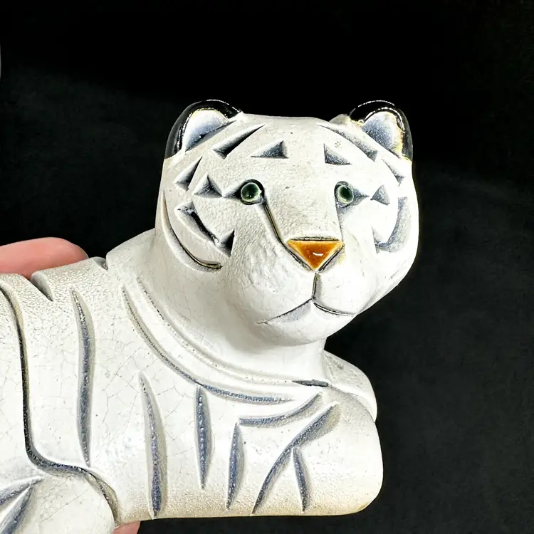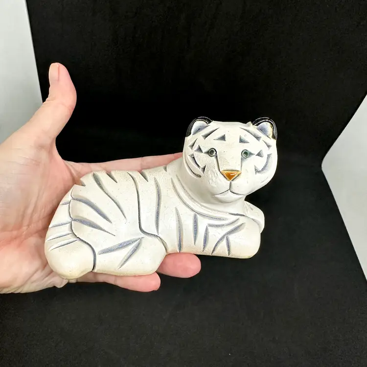 Artesania Rinconada white tiger mama. Solid, signed on bottom. About 3" tall x 5" wide x 2.5" deep. No chips or cracks, general wear from age & being in storage. It does have a rough mark under it's nose that had glaze added to it during manufacturing/creation. I looked at others that I could find and this seems common on them for some reason. Offering it for cheaper due to this.