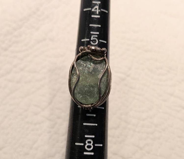 The front face of the ring is 1" long. Marked 925 with an artist seal. Interesting wire technique artfully holds the glass in place and is contrasted by a very simple band.