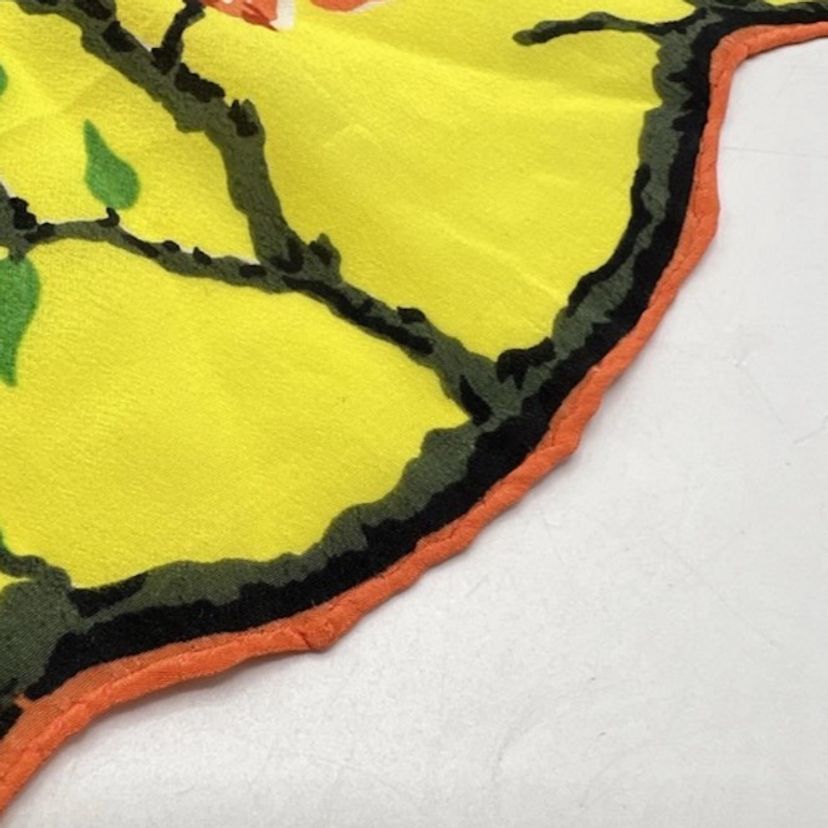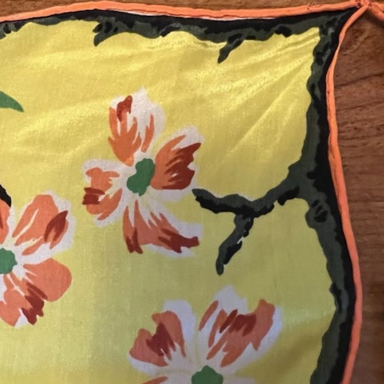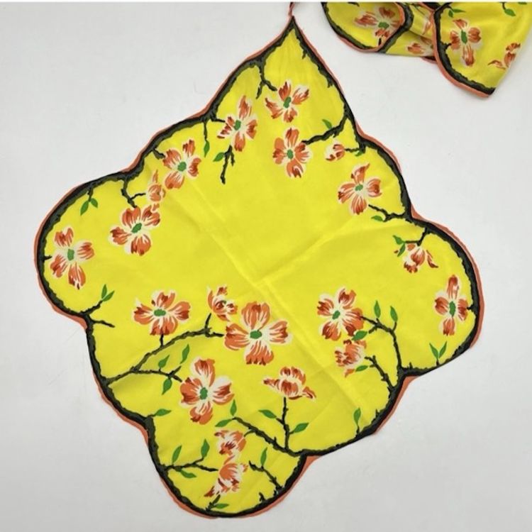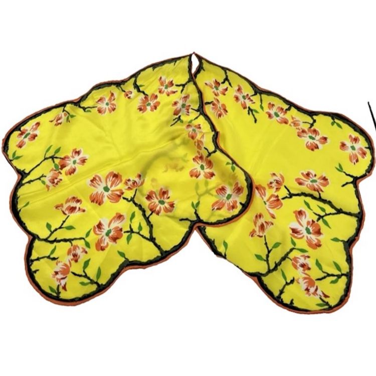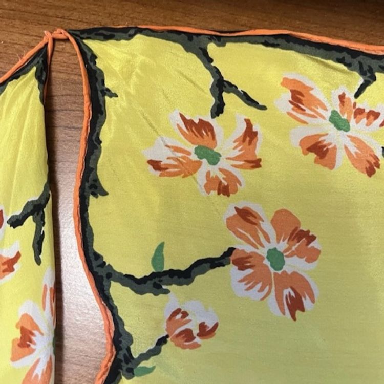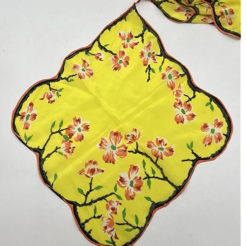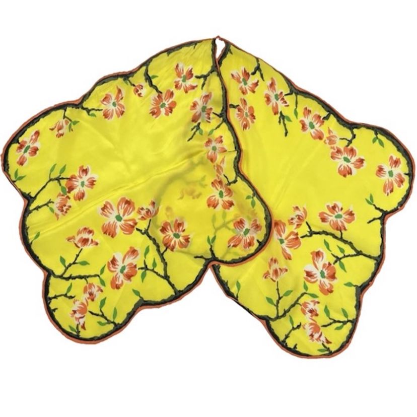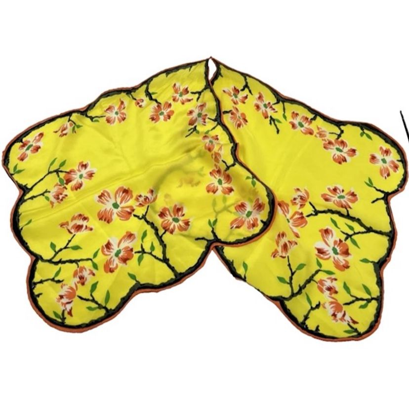 Vintage Asian Floral Silk Hanky Scarf Scalloped Edges Yellow Double Hankie *READ