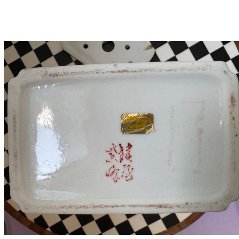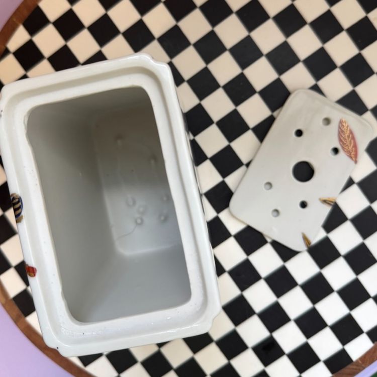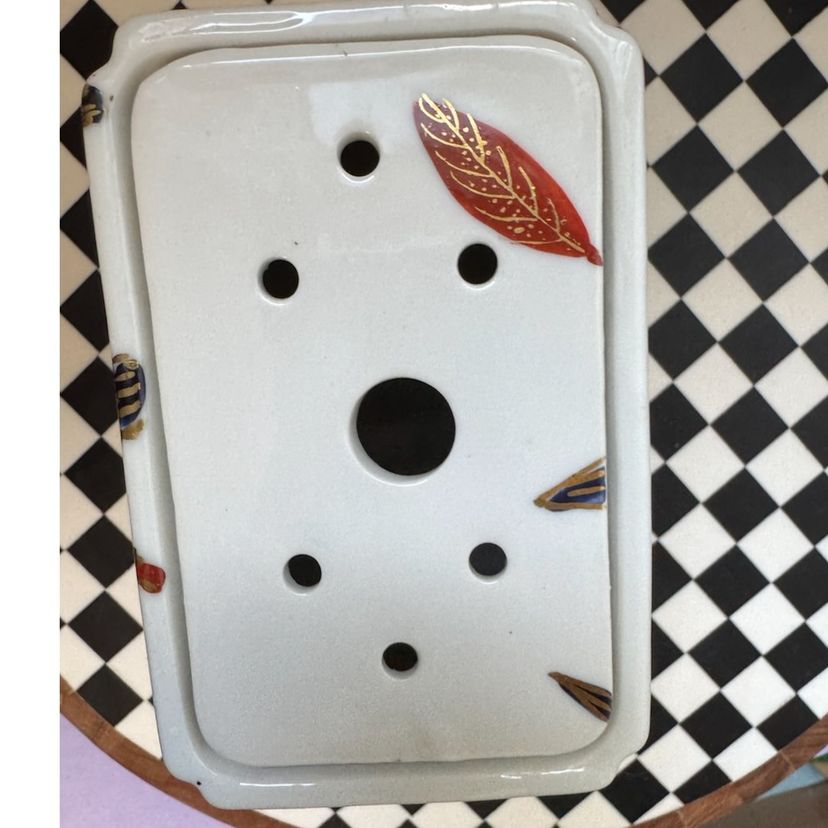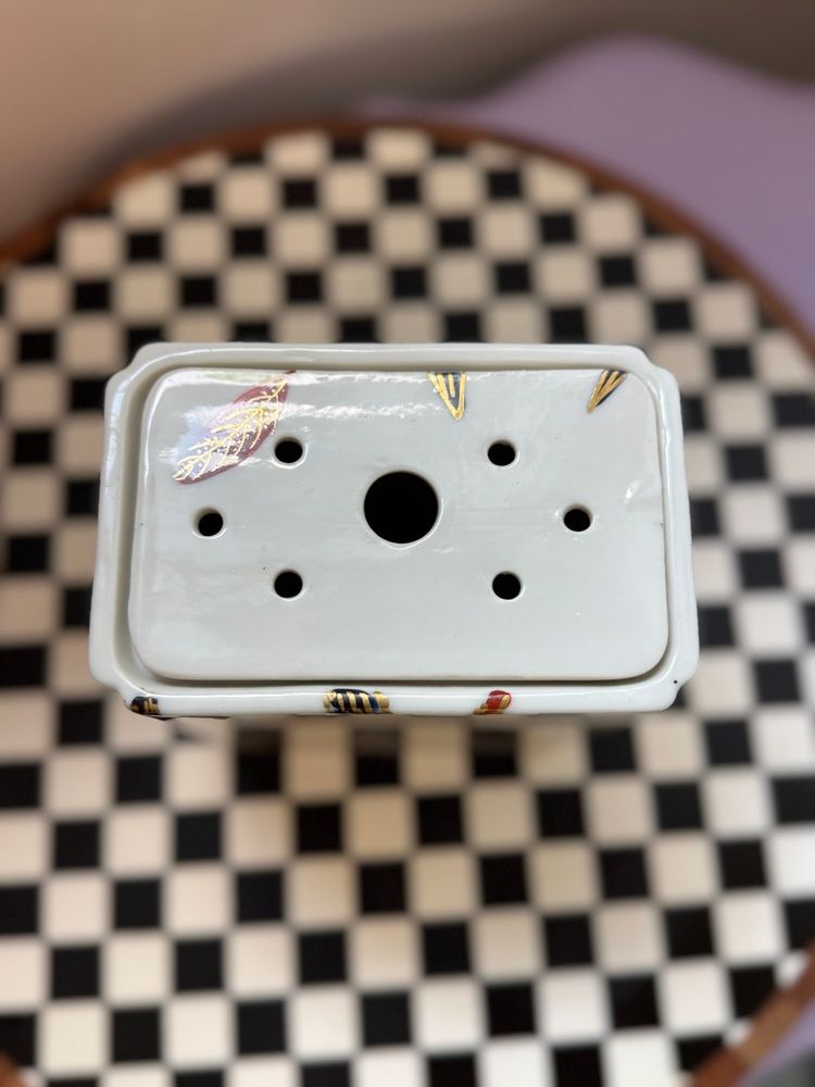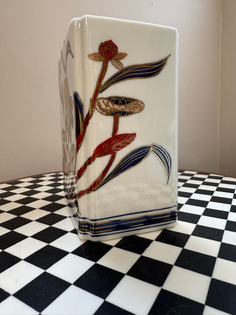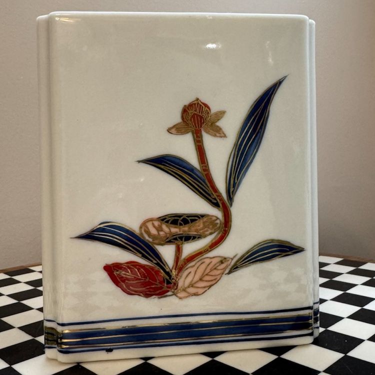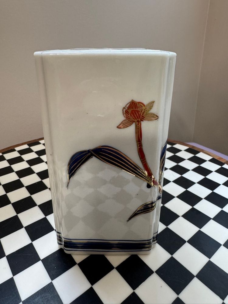 Beautiful flower frog vase. Navy, rust and gold floral design. No chips or cracks. Beautiful for arranging and displaying flowers or just by itself. Measures about. 5 1/4“ x 3 1/2“ x 6“.