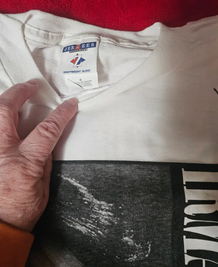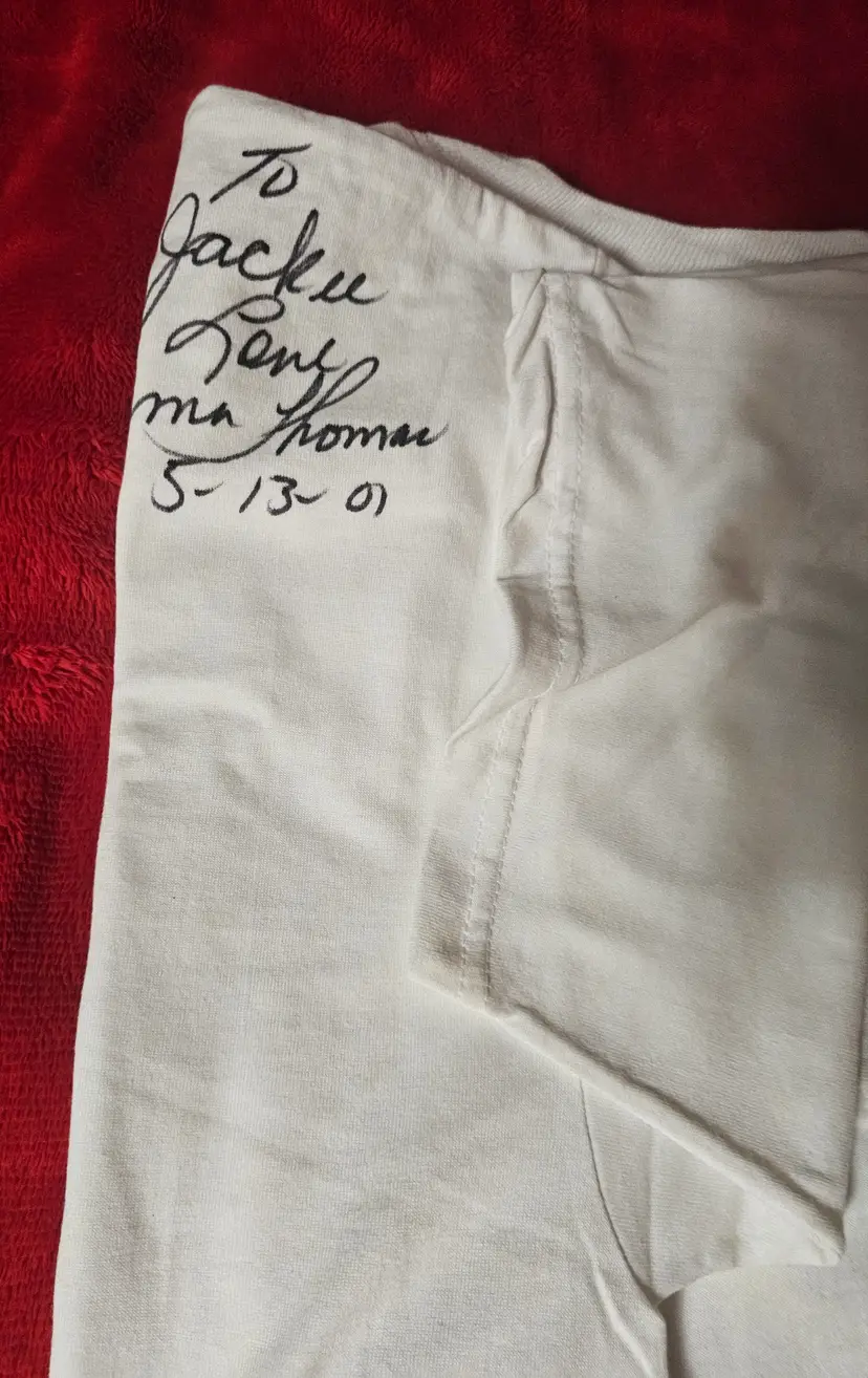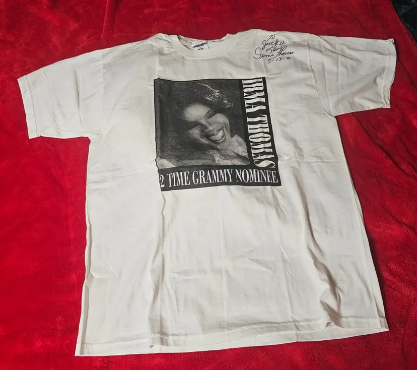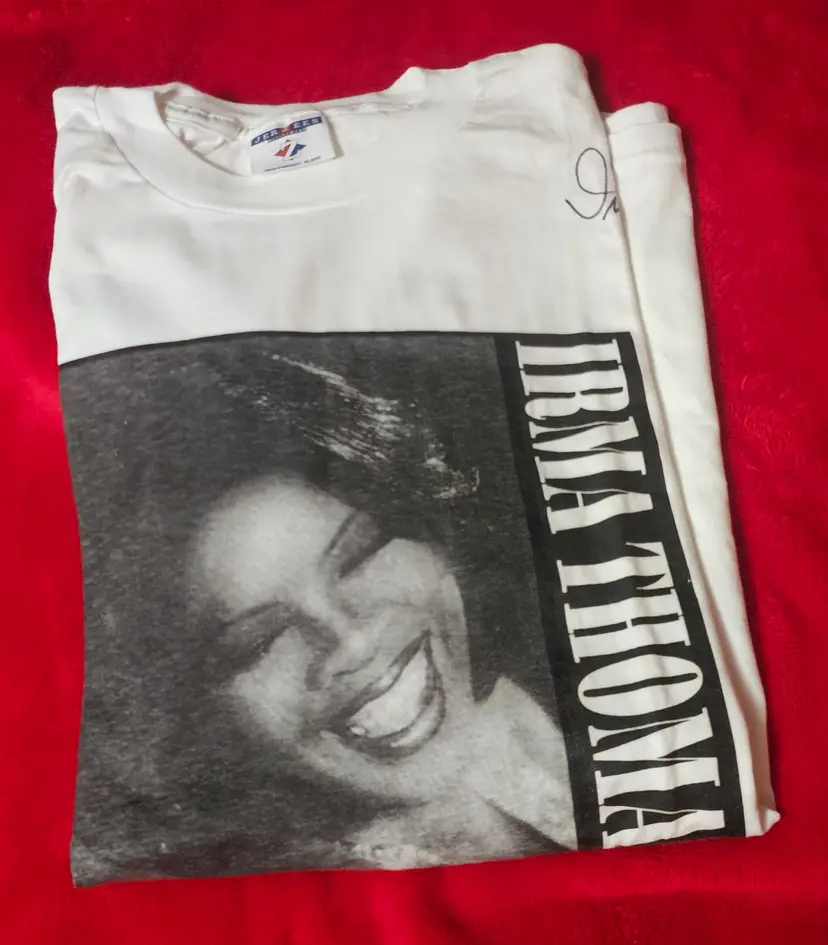 The product is a vintage autographed T-shirt signed by Irma Thomas, featuring the Lions Den New Orleans design on both sides. Made of cotton, the white shirt in size XL has a solid pattern with a crew neck and short sleeves. The regular fit T-shirt, with a theme revolving around art, USA, colorful love, music, college, and hip hop, is perfect for all seasons, making it a versatile addition to any wardrobe. Made in the United States by the brand JERZEES, this shirt is a unique piece that captures the essence of both 80s and 90s music scenes.