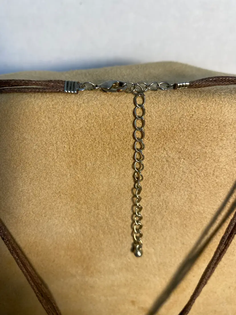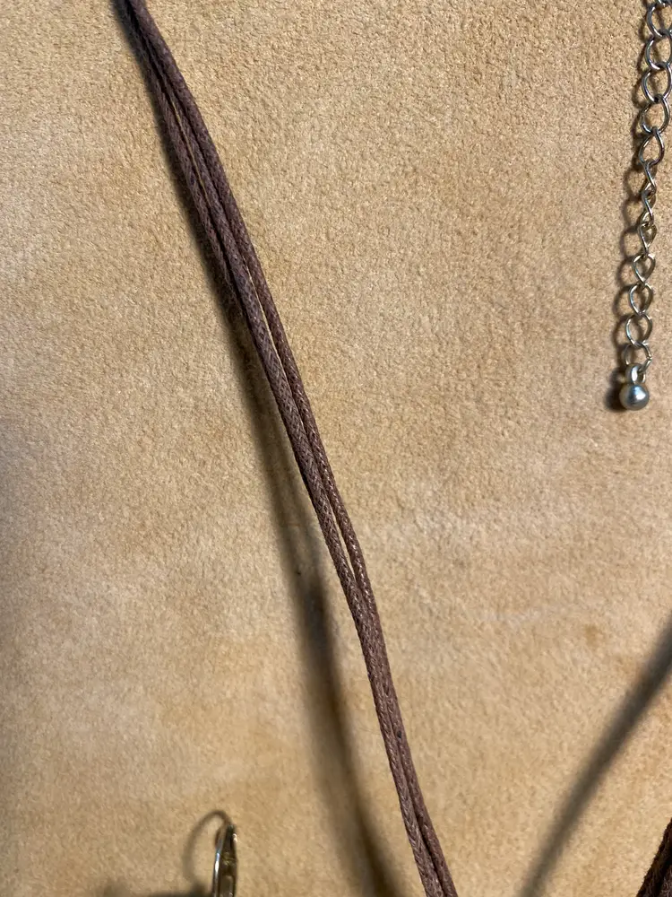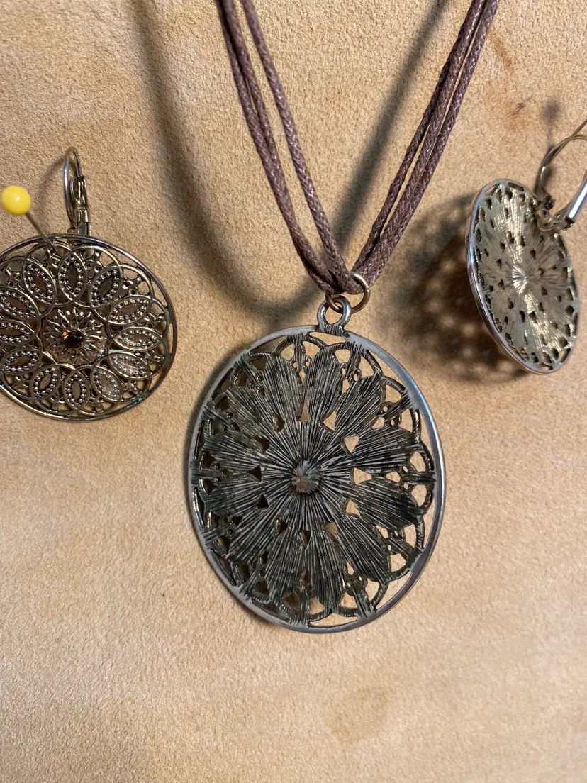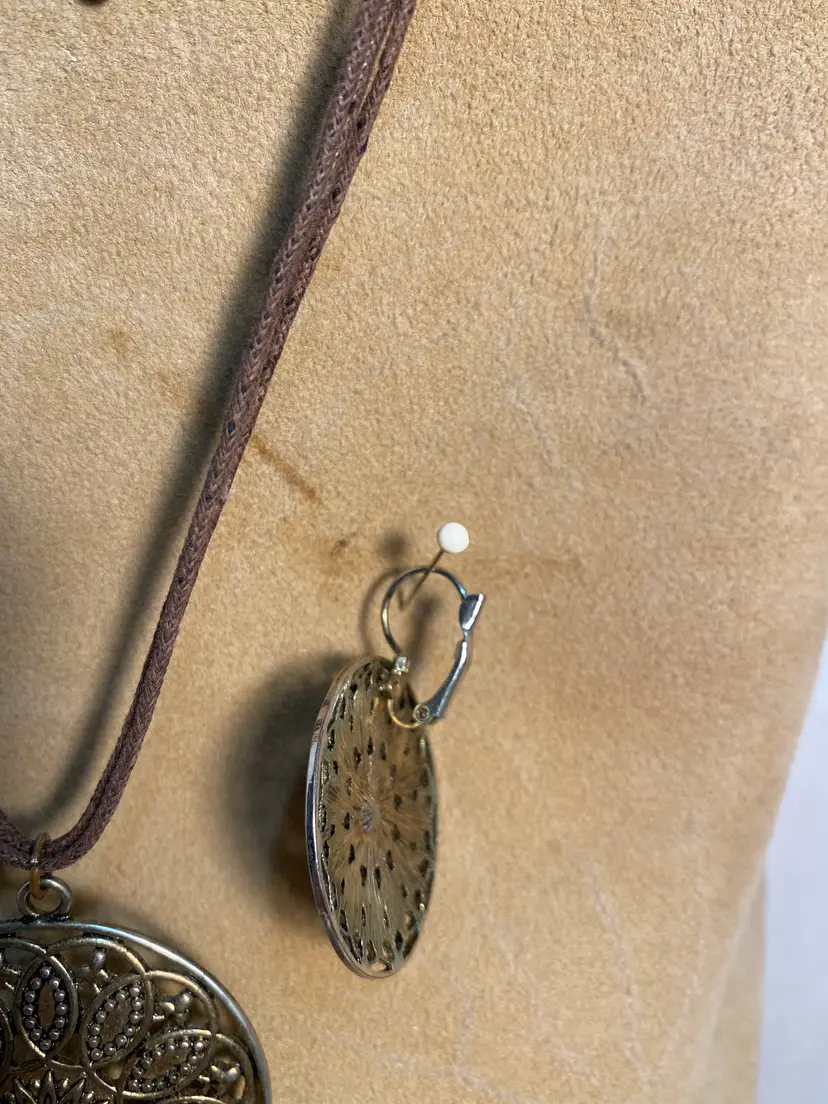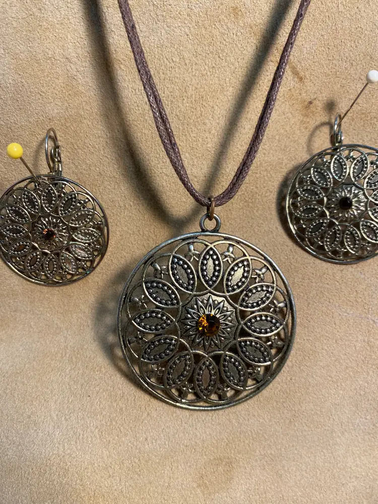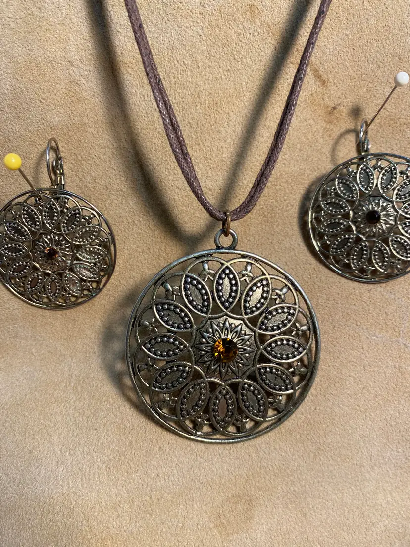 Gold tone pendant and earrings, with brown cord for necklace. Earrings and pendant has brown setting in middle.in great condition. Measurements are necklace length 8”-9 1/2”, medallion is 2” wide. Earrings are pierced wires, 1 3/8” wide, hangs 1 3/4”. I believe I got this from Avon but can’t remember for sure.