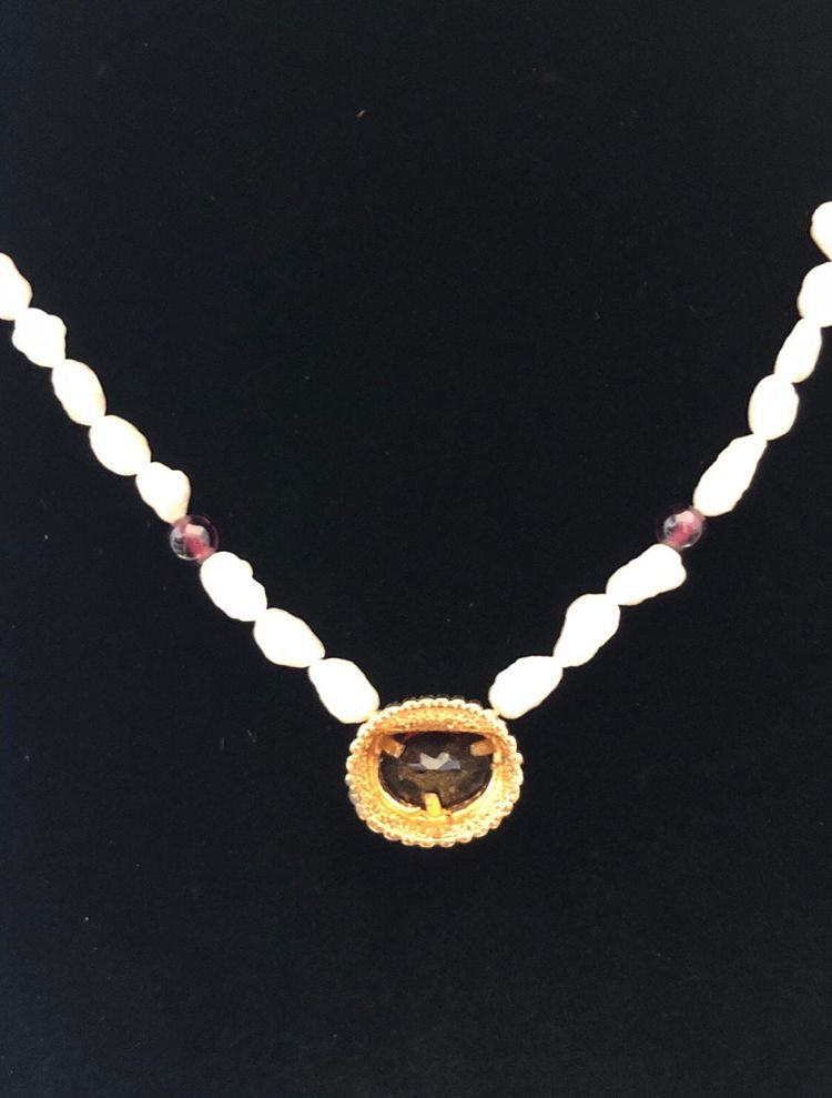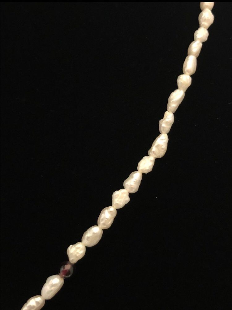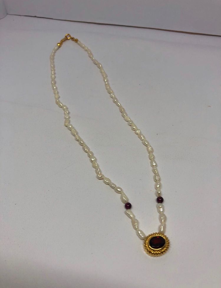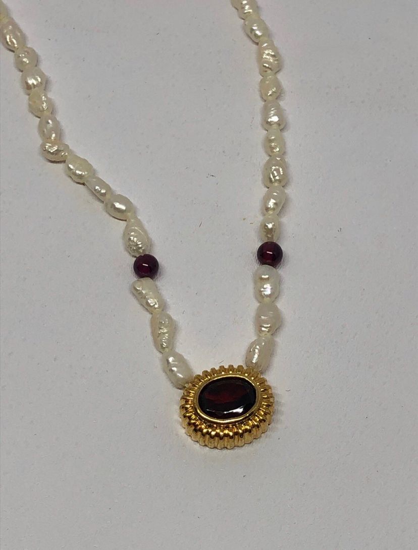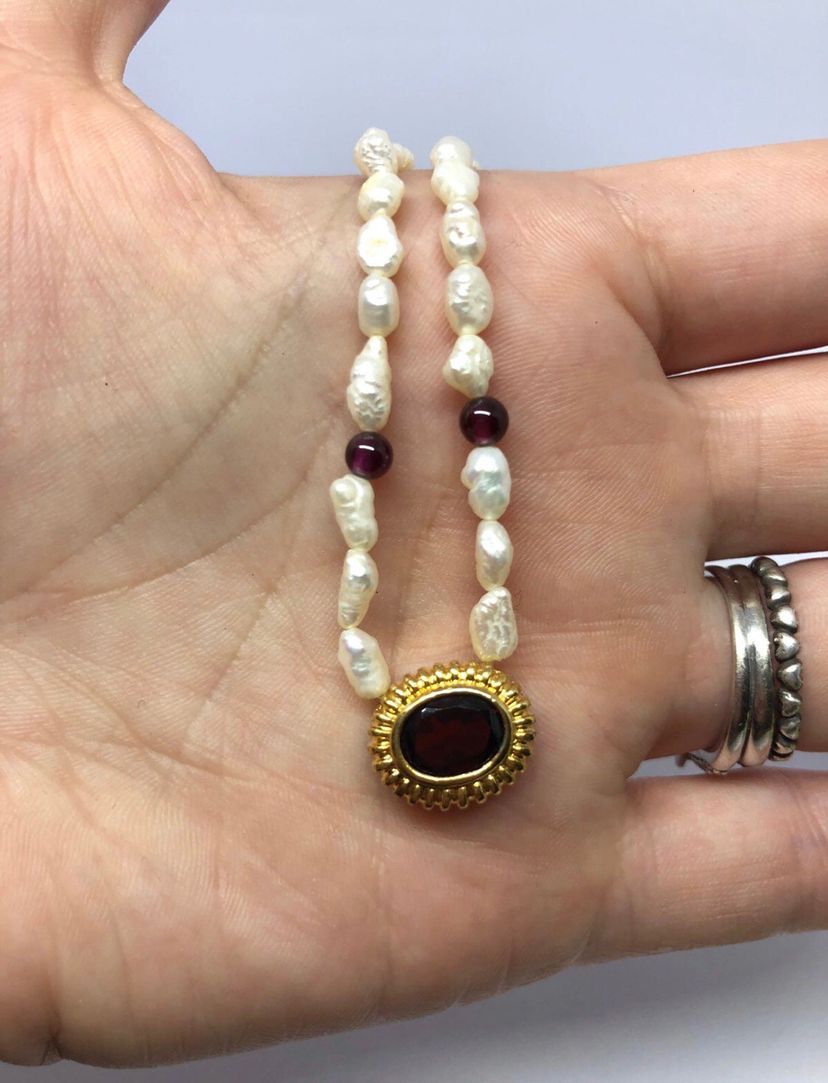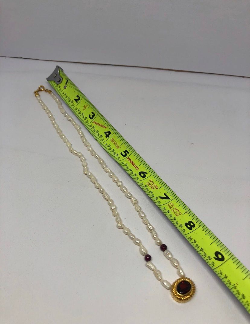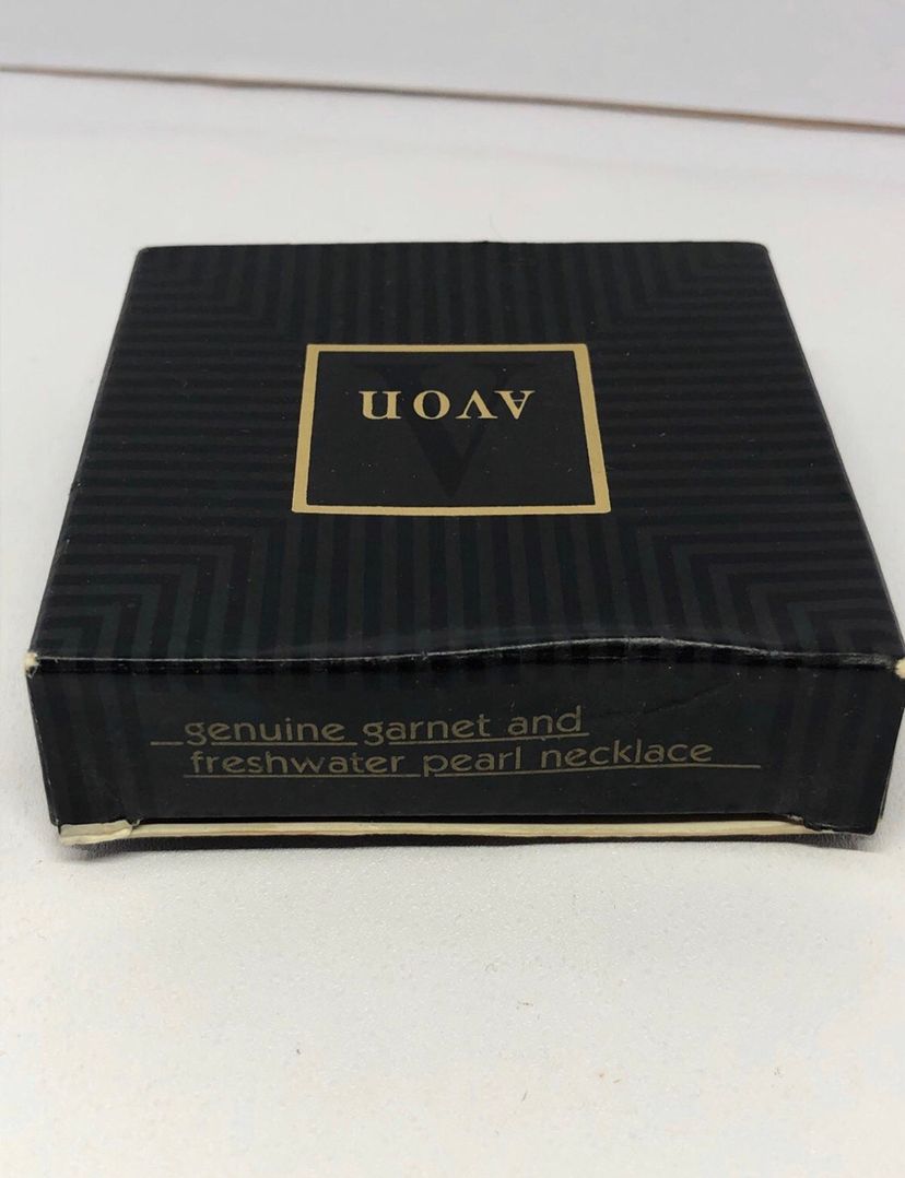 Comes with the original box Really gorgeous necklace Genuine pearls and Garnet Great for Avon collectors, Pearl lovers, garnet lovers, and so so many more Does not include jewelry stand