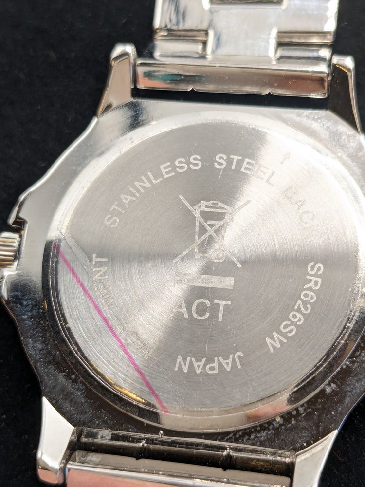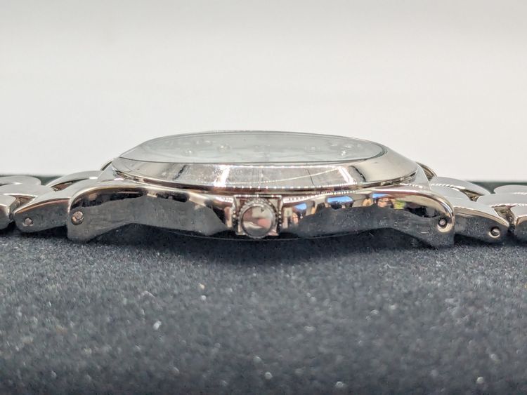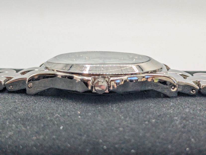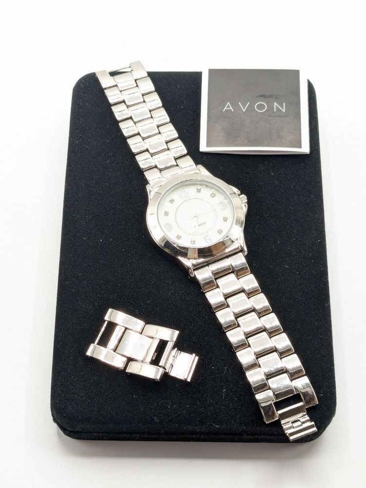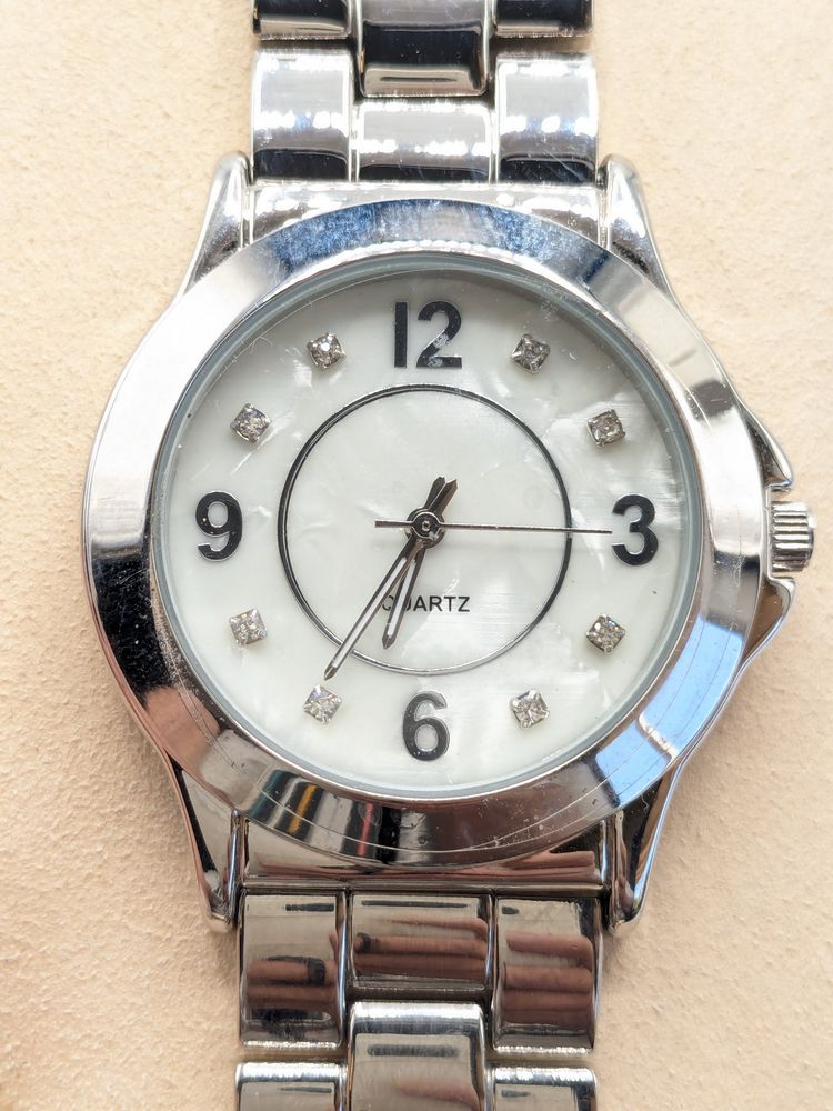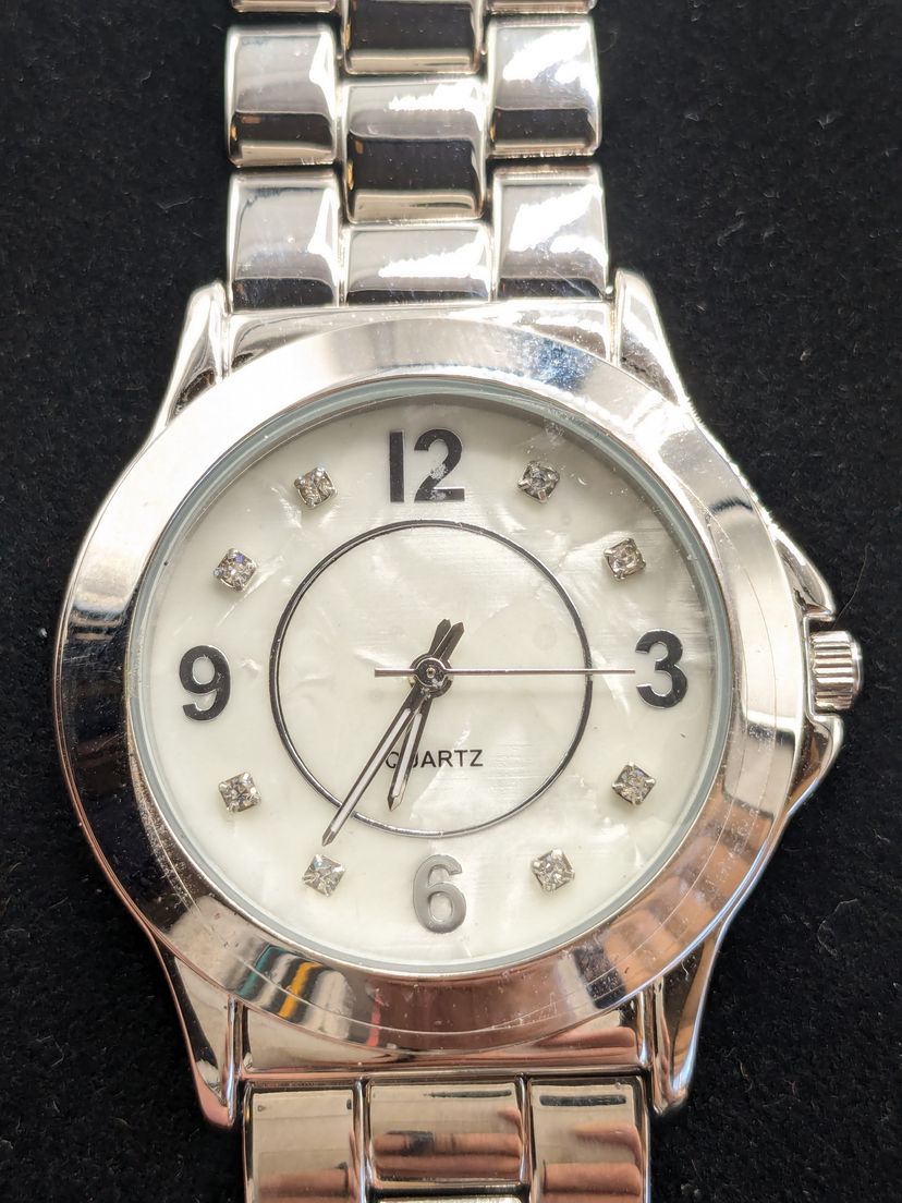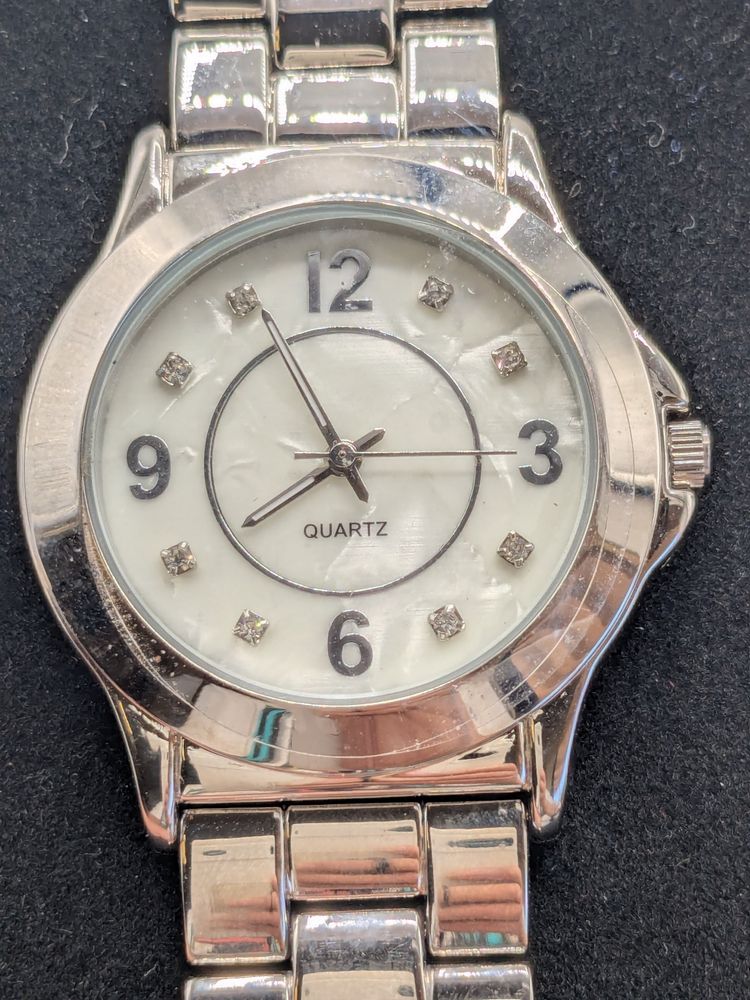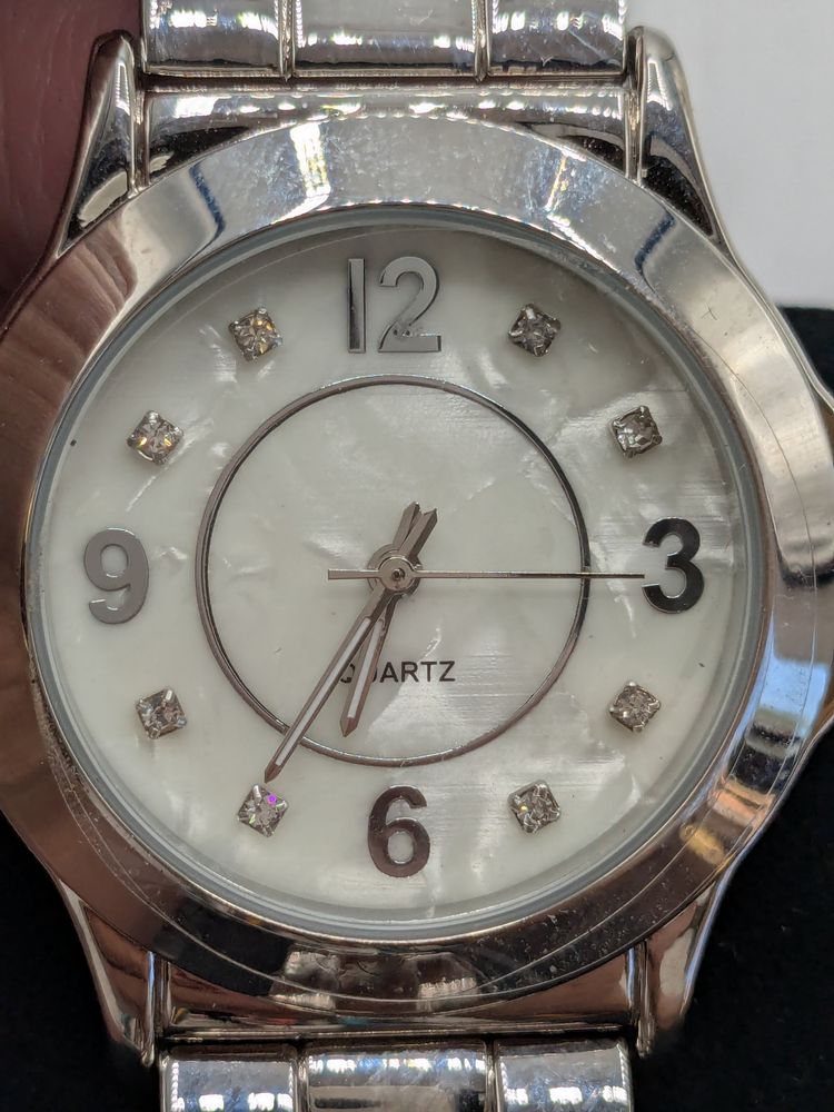 Good condition. New old stock. Rhinestone accents. Needs battery. Has NOT been tested. Stainless steel back. Japan movement. SR626SW. Has extension link. Still has plastic protective cover on face and back of watch. Comes with original paperwork and box. Box is in worn condition. Size 7 1/4" with the extension. Band is 7/8" wide. EN3