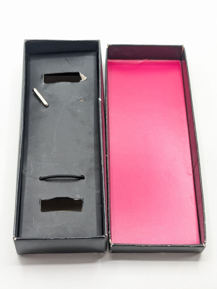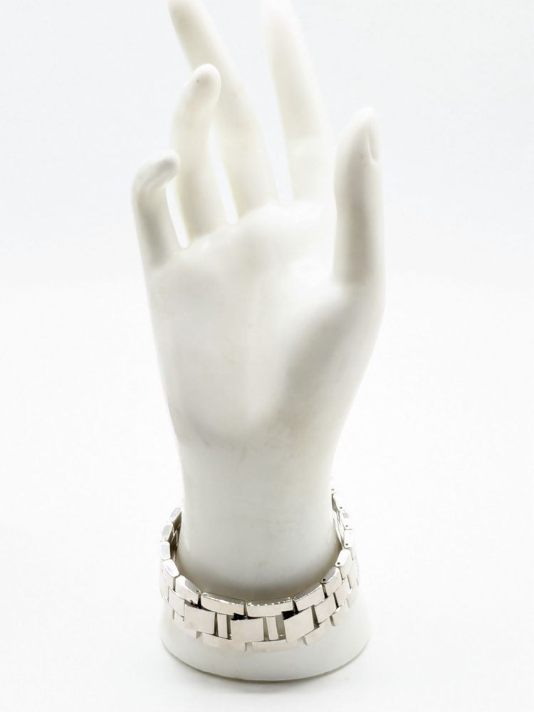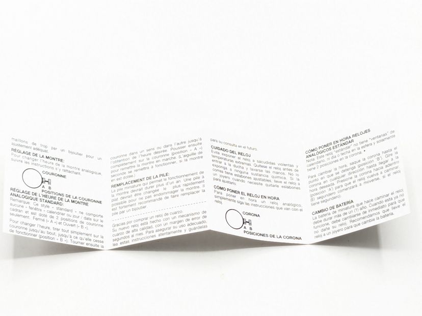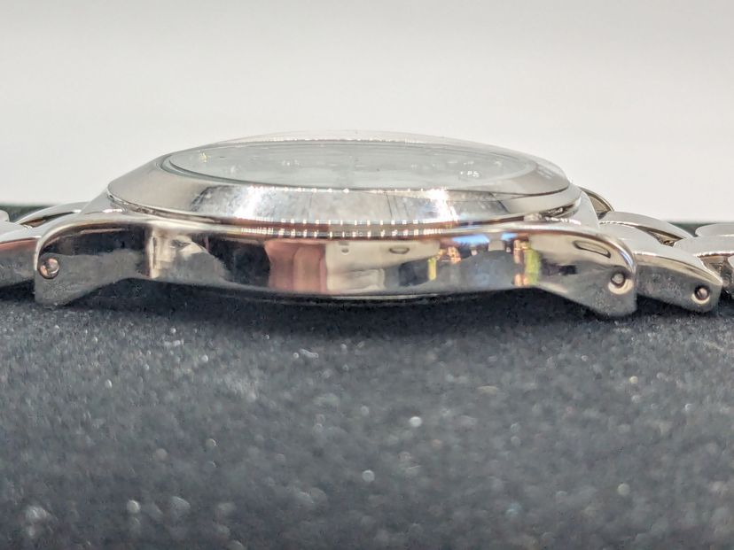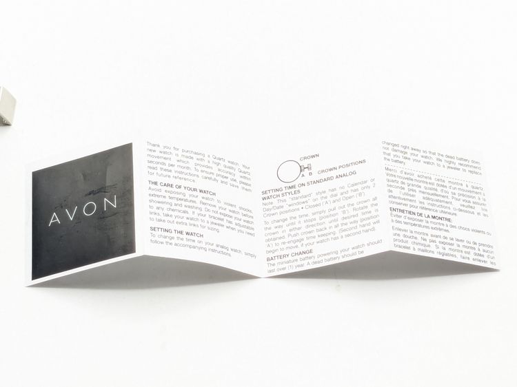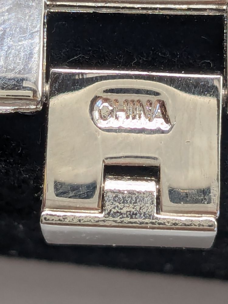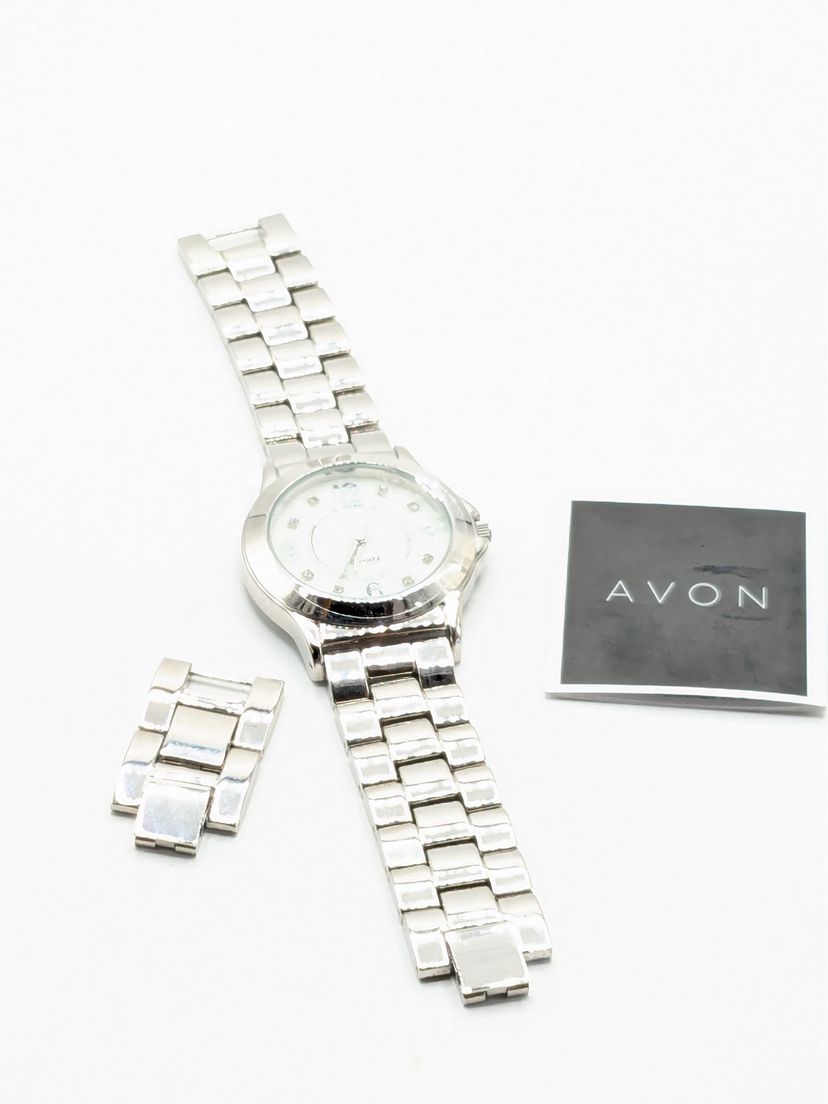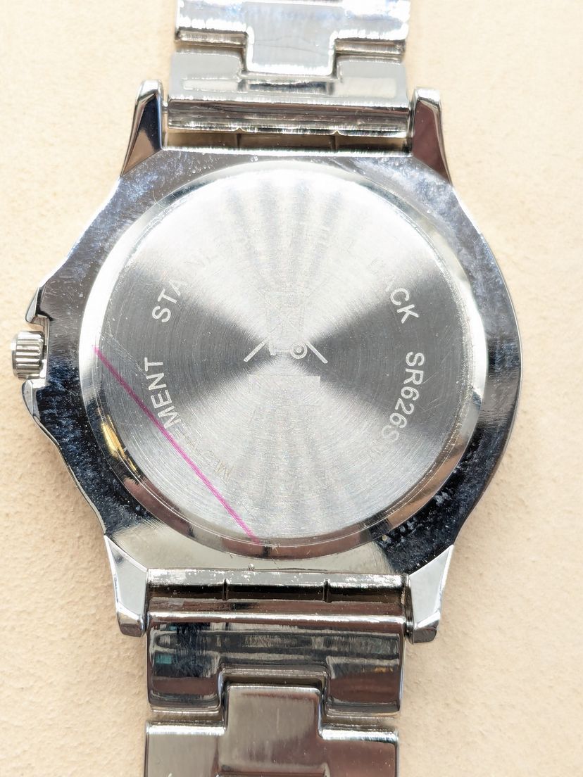 Good condition. New old stock. Rhinestone accents. Needs battery. Has NOT been tested. Stainless steel back. Japan movement. SR626SW. Has extension link. Still has plastic protective cover on face and back of watch. Comes with original paperwork and box. Box is in worn condition. Size 7 1/4" with the extension. Band is 7/8" wide. EN3