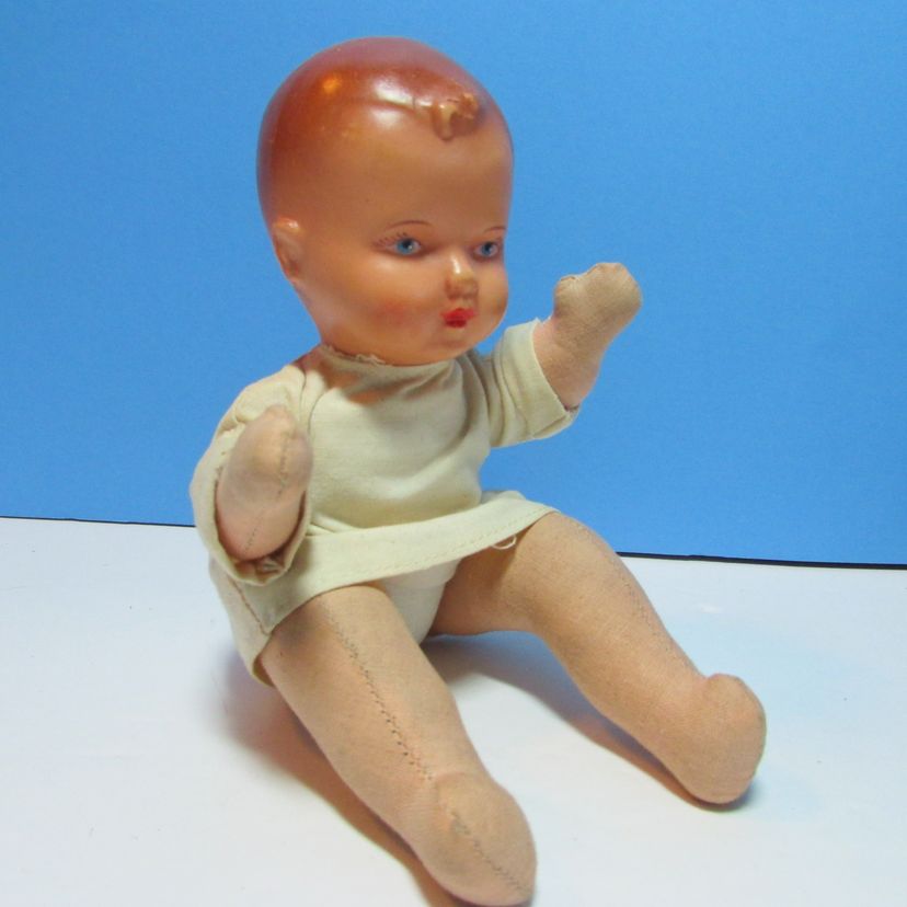 This adorable baby has some wear, he has a spot on his face and stain on his back. Still adorable doll to display, you can move the legs to have him sit or laydown. He is about 8" when laying flat. This is shipped from a smoke free home. Thanks for looking!