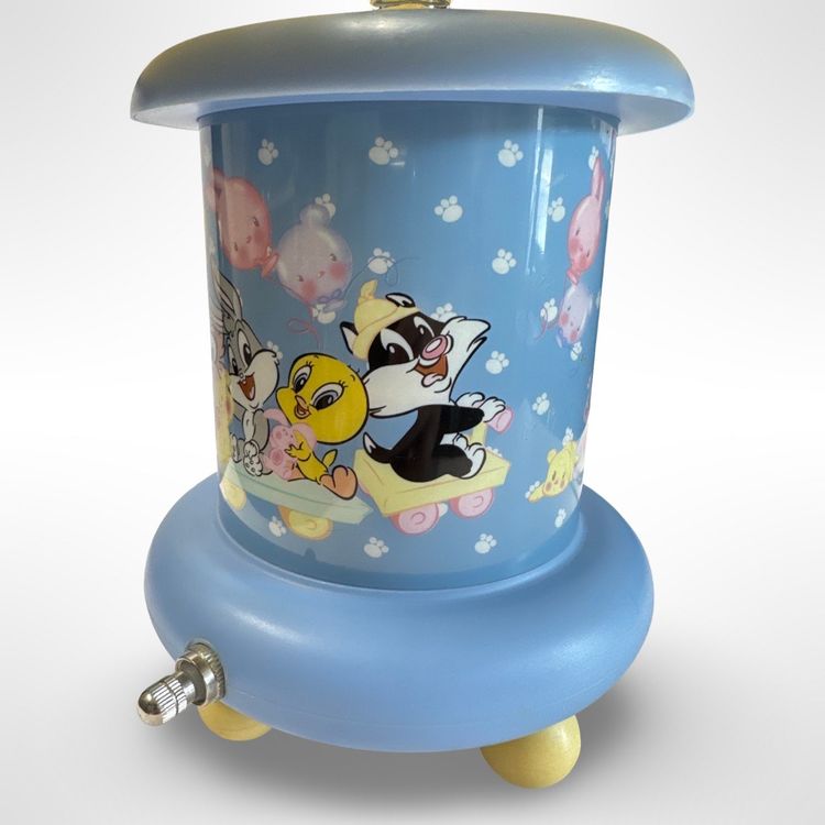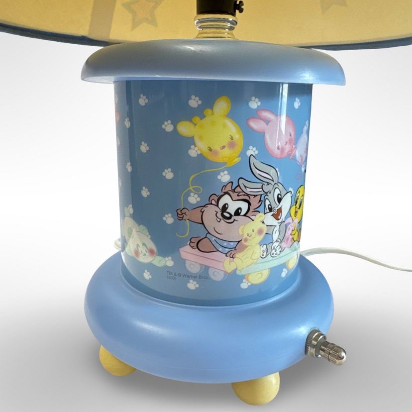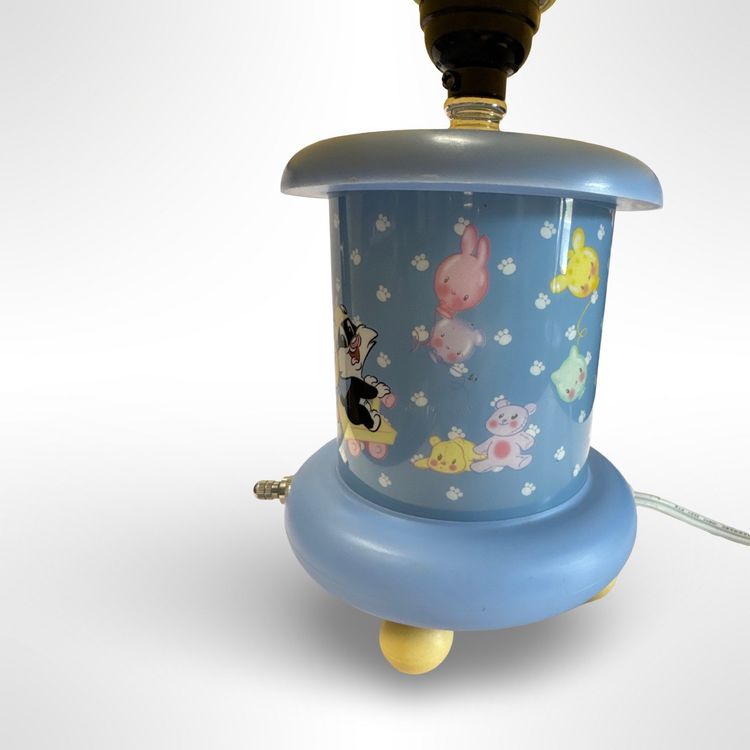 Sweet vintage baby looney tunes lamp for a baby’s room. The shade doesn’t appear to be original to the lamp, and someone seems to have glued it on, but it looks like it could be removed with some patience. It is in good vintage condition with some age related wear. Measures approximately 13” tall
