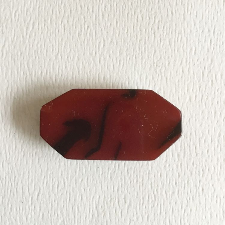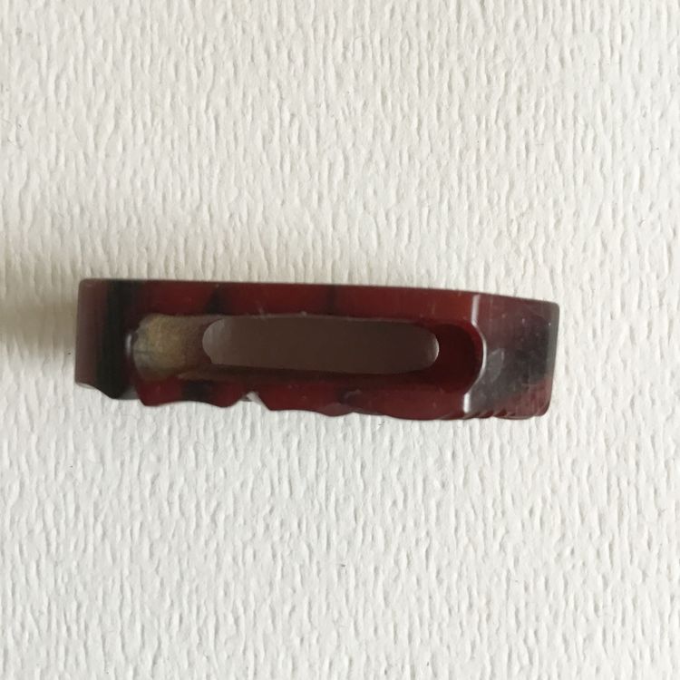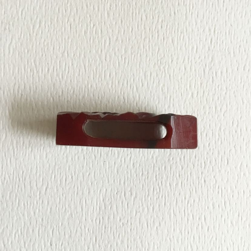 Carved bakelite piece that features a floral design and wide opening. I'm guessing this might be used for a thin scarf or perhaps a bolo tie. Great for repurposing and crafting or adding to your collection.