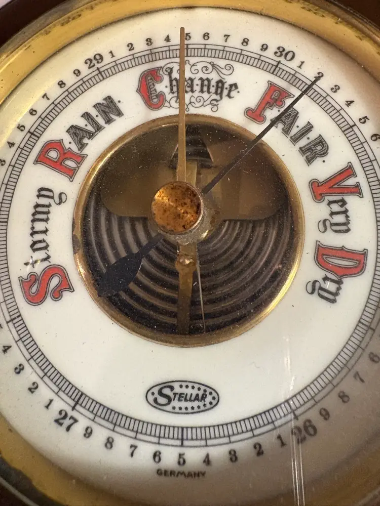 The barometer has been well-preserved and is in good working condition. Its brand is Stellar, and it has not been modified. This collectible item is perfect for those interested in Science & Medicine (1930-Now), and those who appreciate the craftsmanship of German-made instruments. 5” across