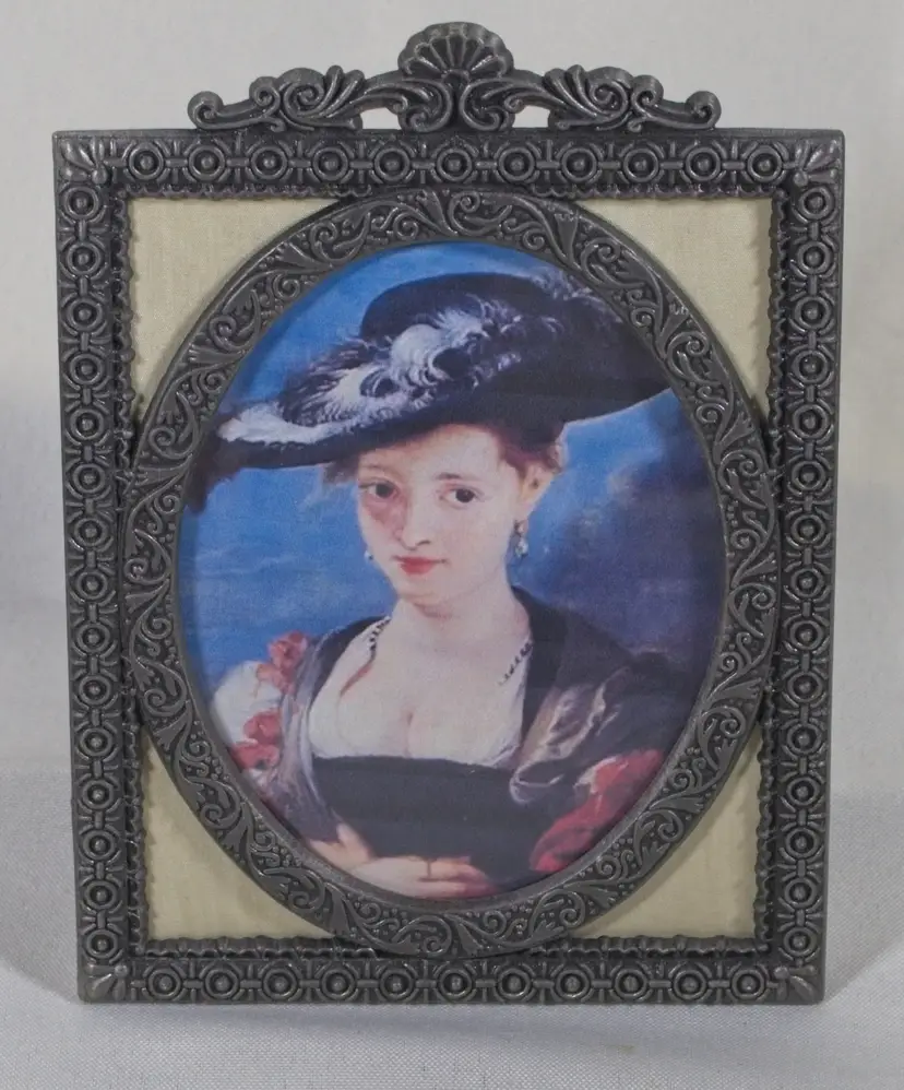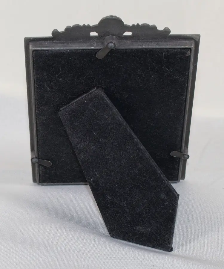 Vintage Baroque Style Metal Picture Frame Holds 4" x 3" Oval Photo. In good condition. Full disclosure: picture in frame is not vintage. I printed it out. Easel black velvet covered back. Does have clear glass in frame. Overall measurements: 4.25" wide x 5.75" tall