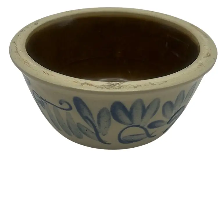 Featuring a hand painted blue floral design on a natural tan to gray stoneware. Signed BBP and is in very nice condition!