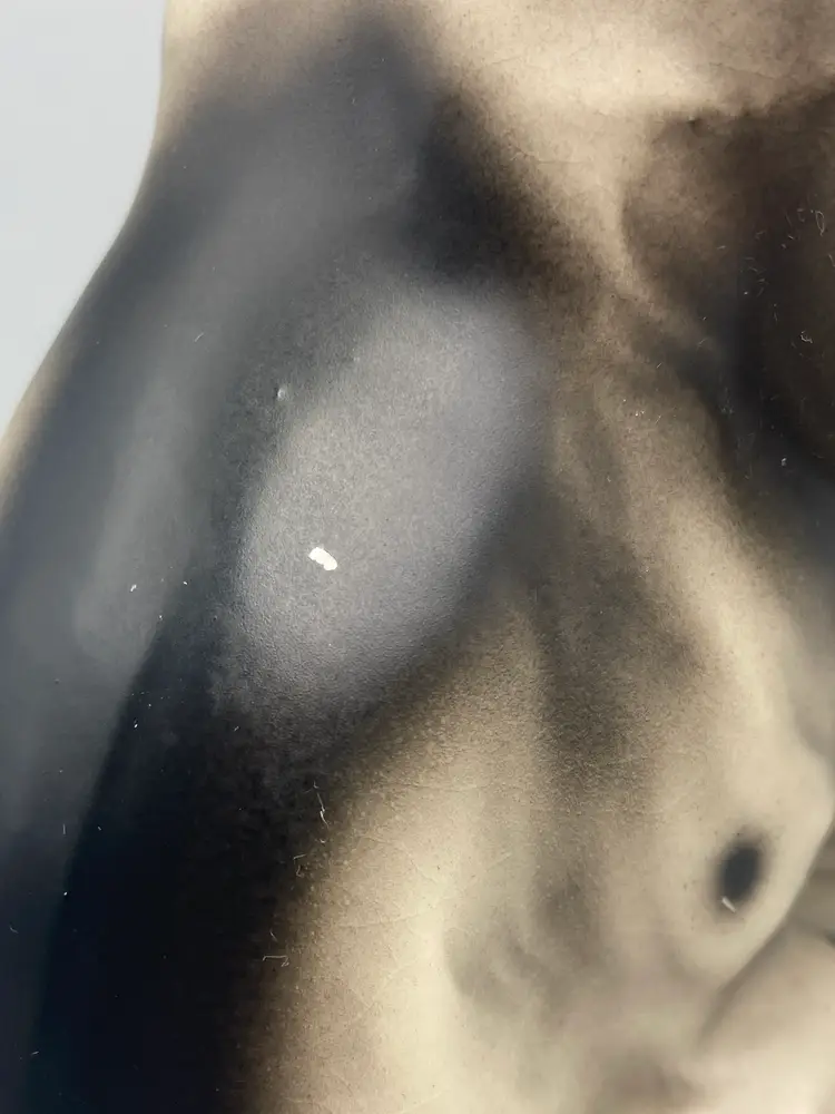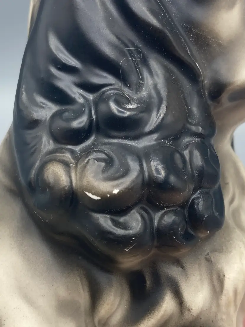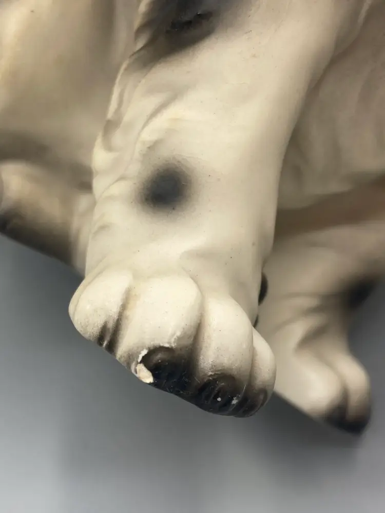 This dog is in good overall condition. There are some places where there is paint chipping and wear, as well as a small chip on the one paw. Please see the last 5 pictures for details. It measures approximately 6" tall x 3" wide x 5" deep.